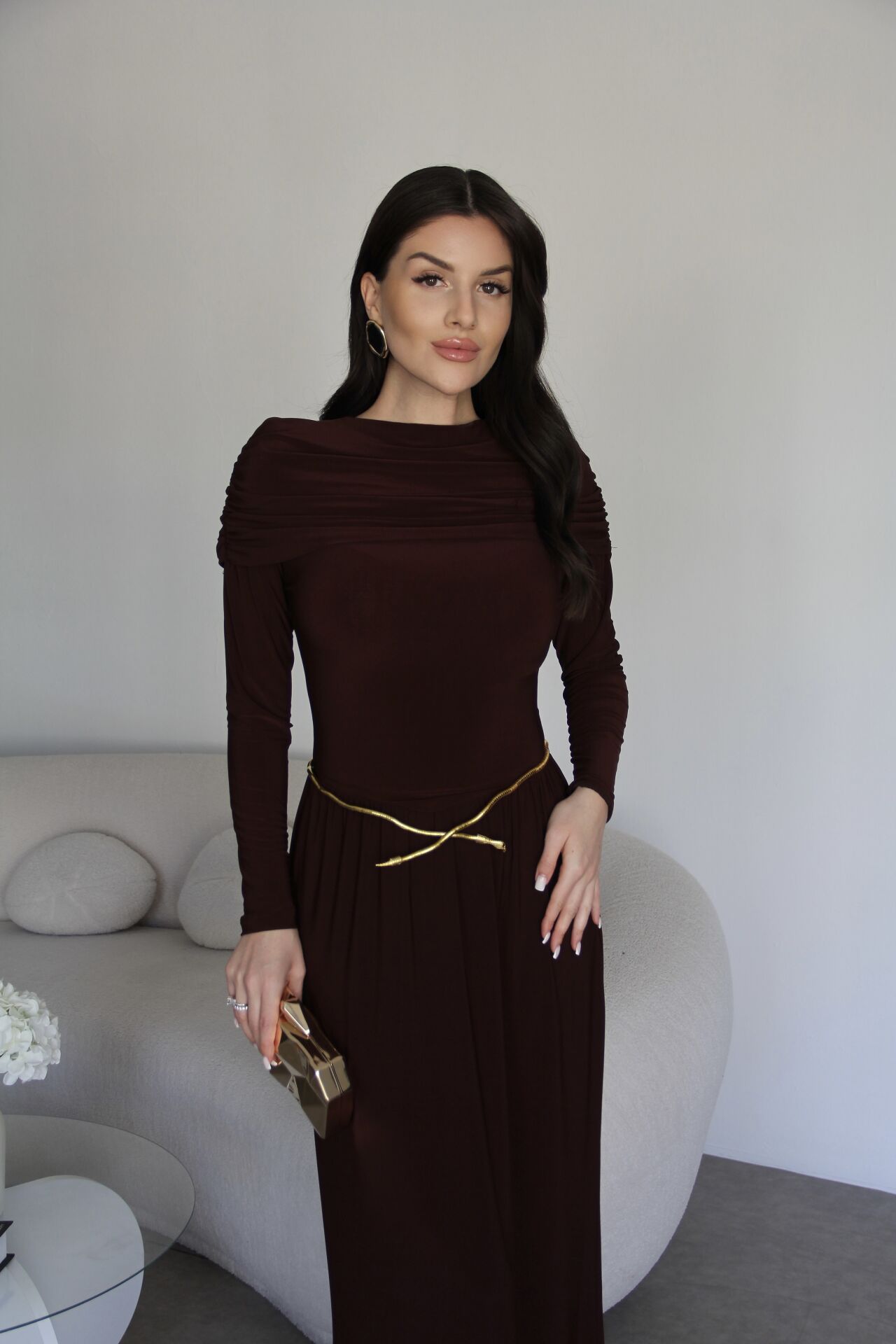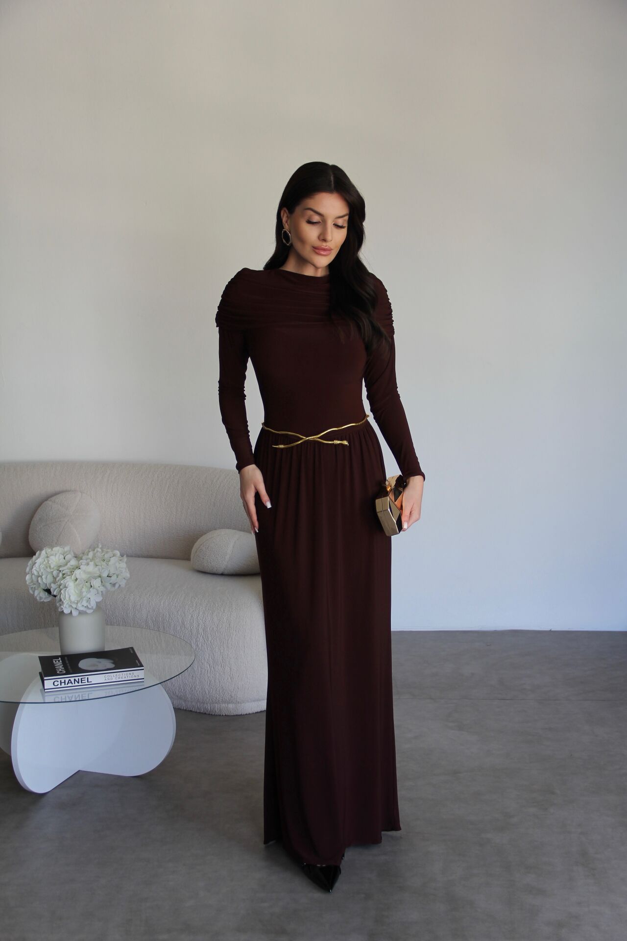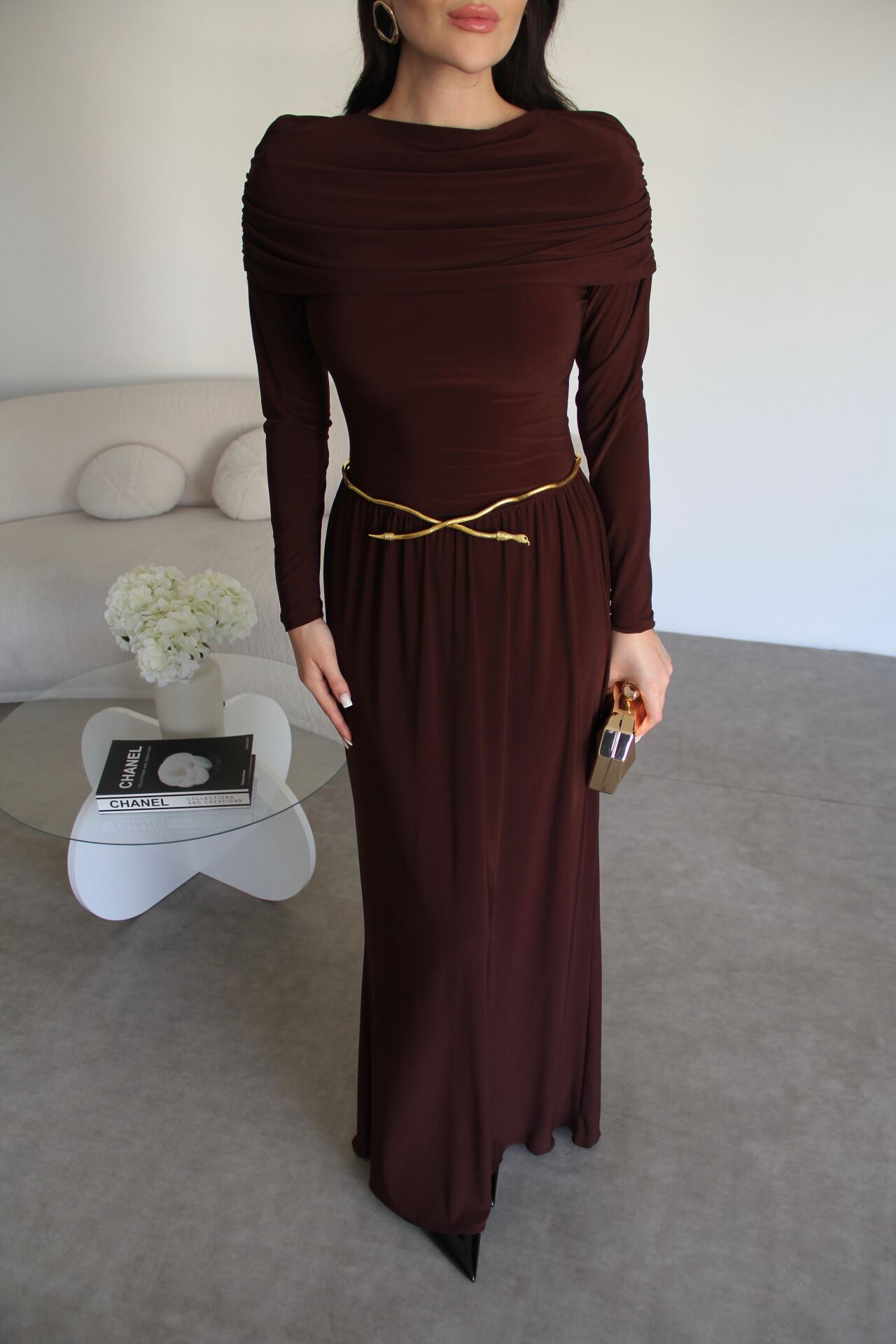 Acı Kahve Şal Yaka Gold Metal Kemerli Maxi Uzun Premium Büzgülü Elbise