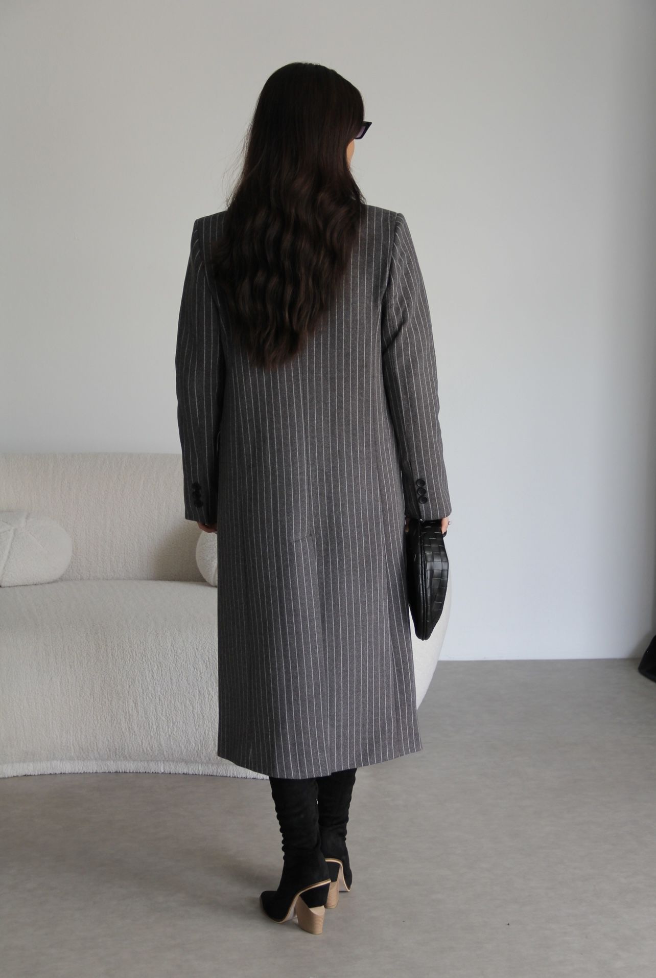 Antrasit Gri Çizgili Kapaklı Cepli Düğmeli Astarlı Premium Uzun Kaban