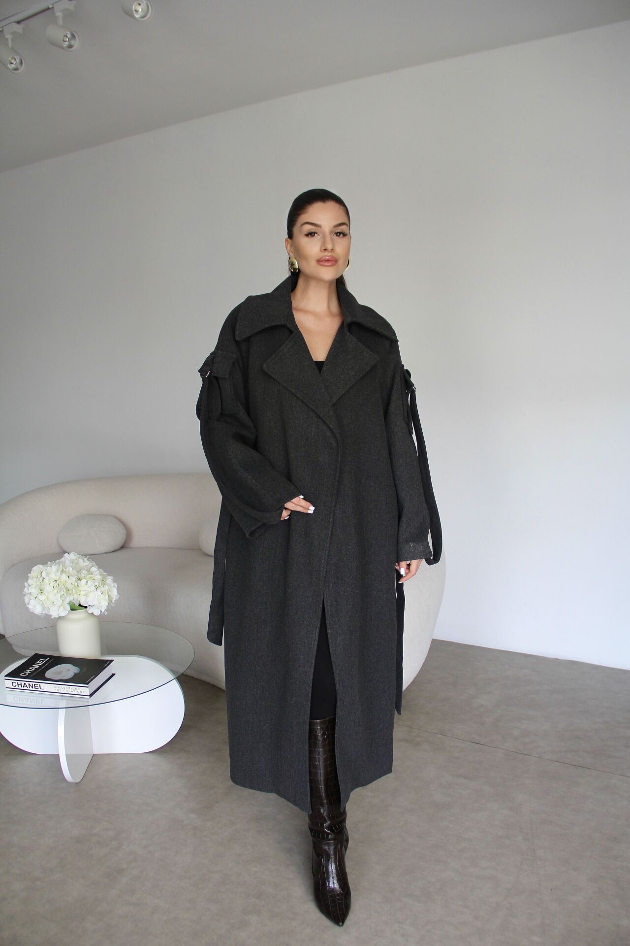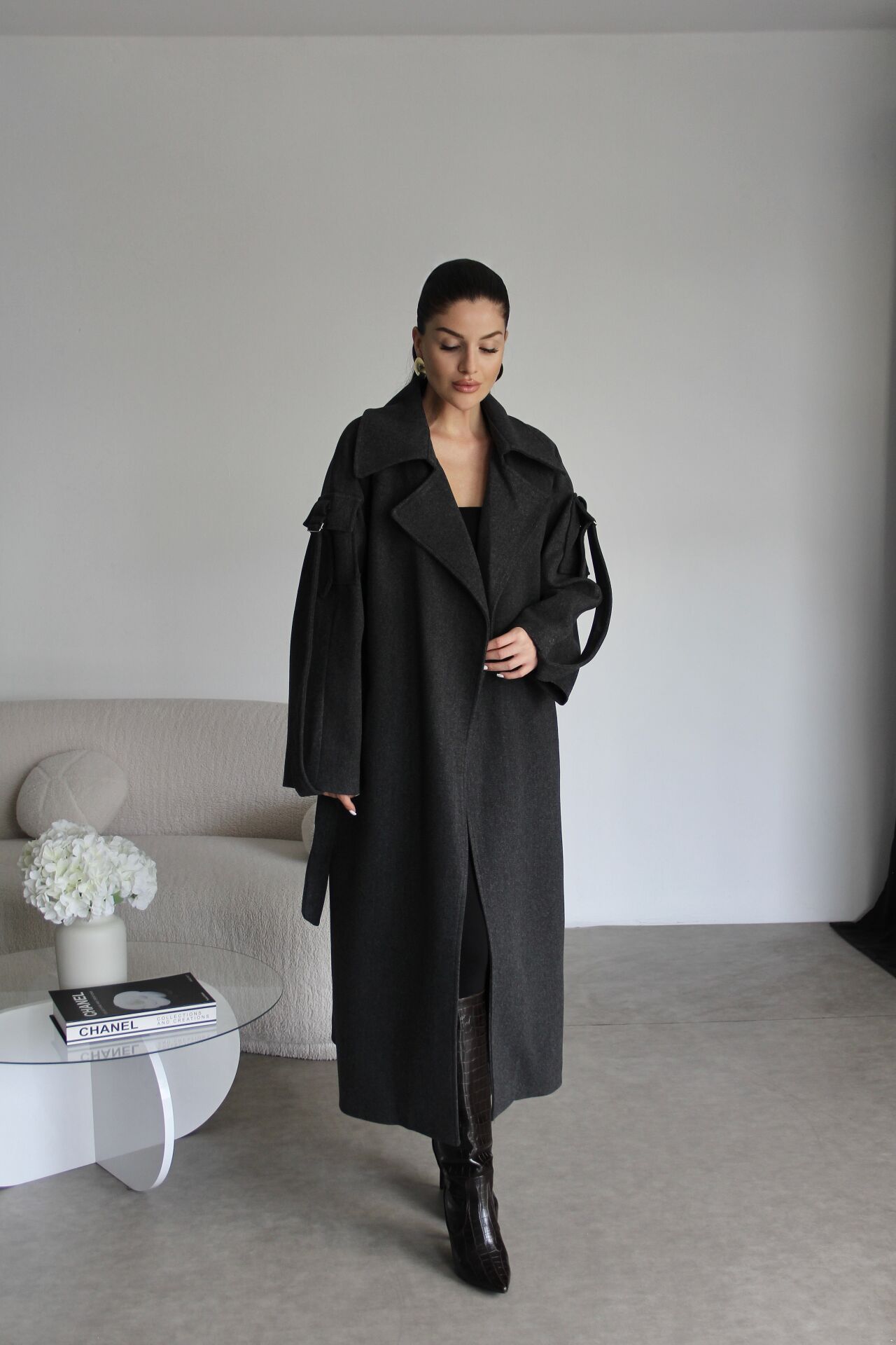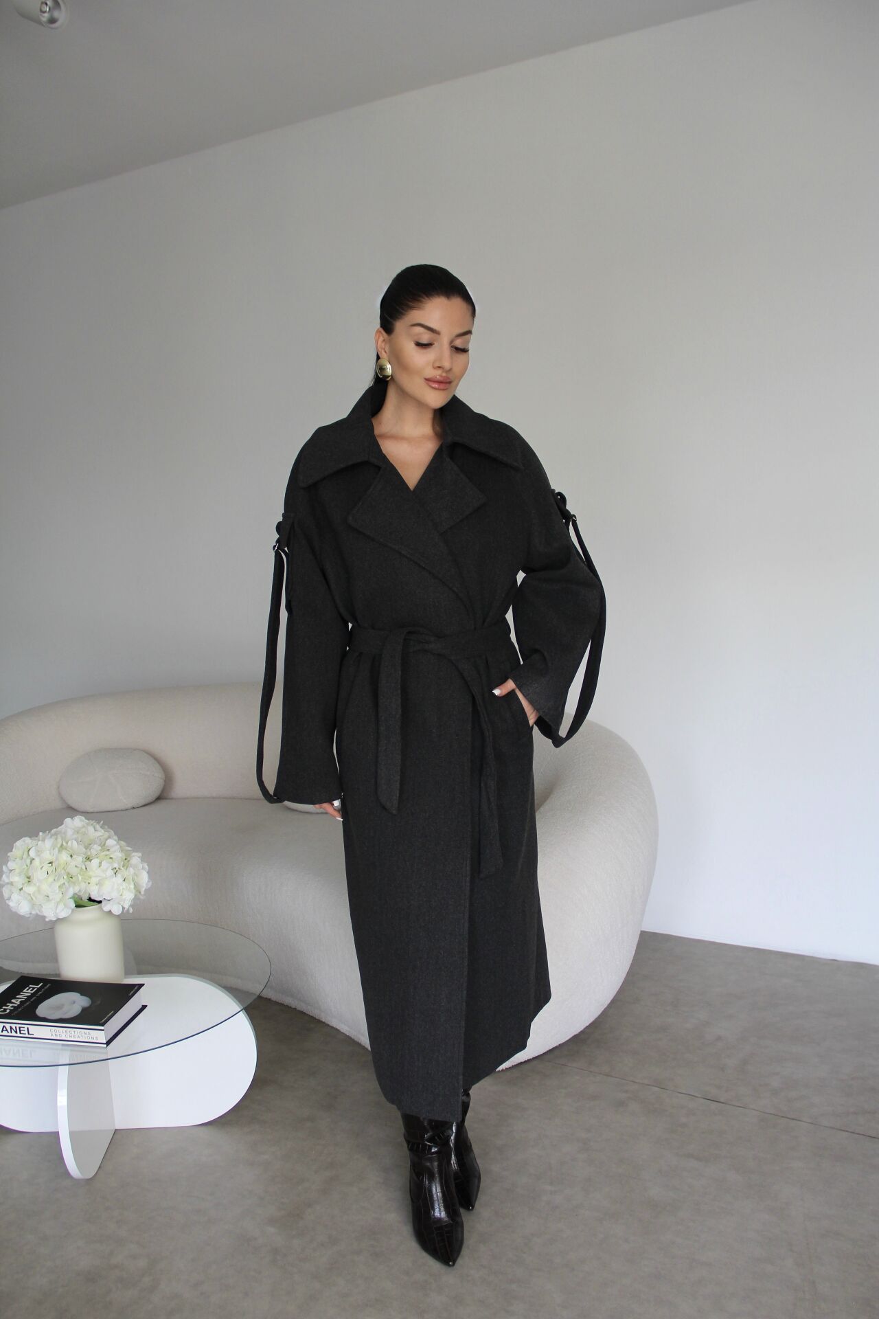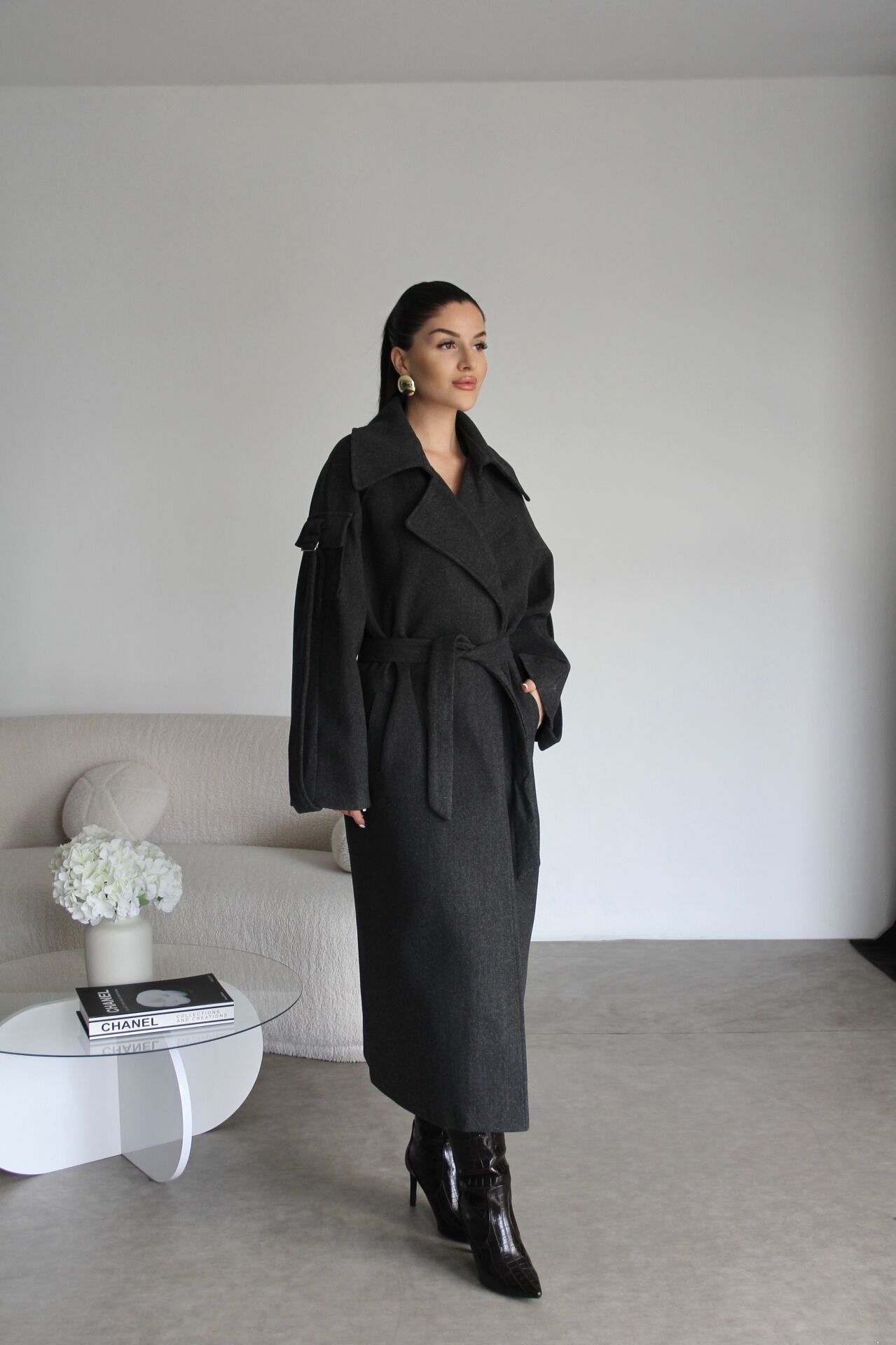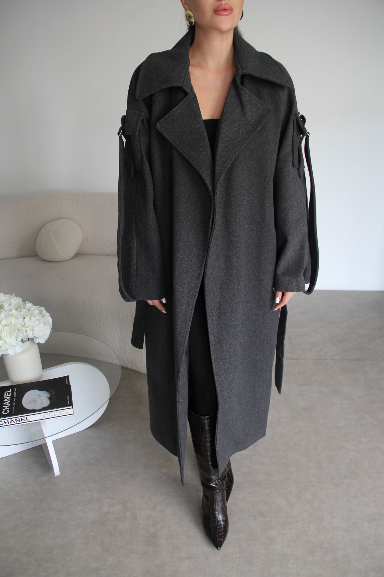 Antrasit Kuşaklı Kol Detaylı Oversize(BOL) Kesim Astarlı Premium Uzun Kaşe Kaban