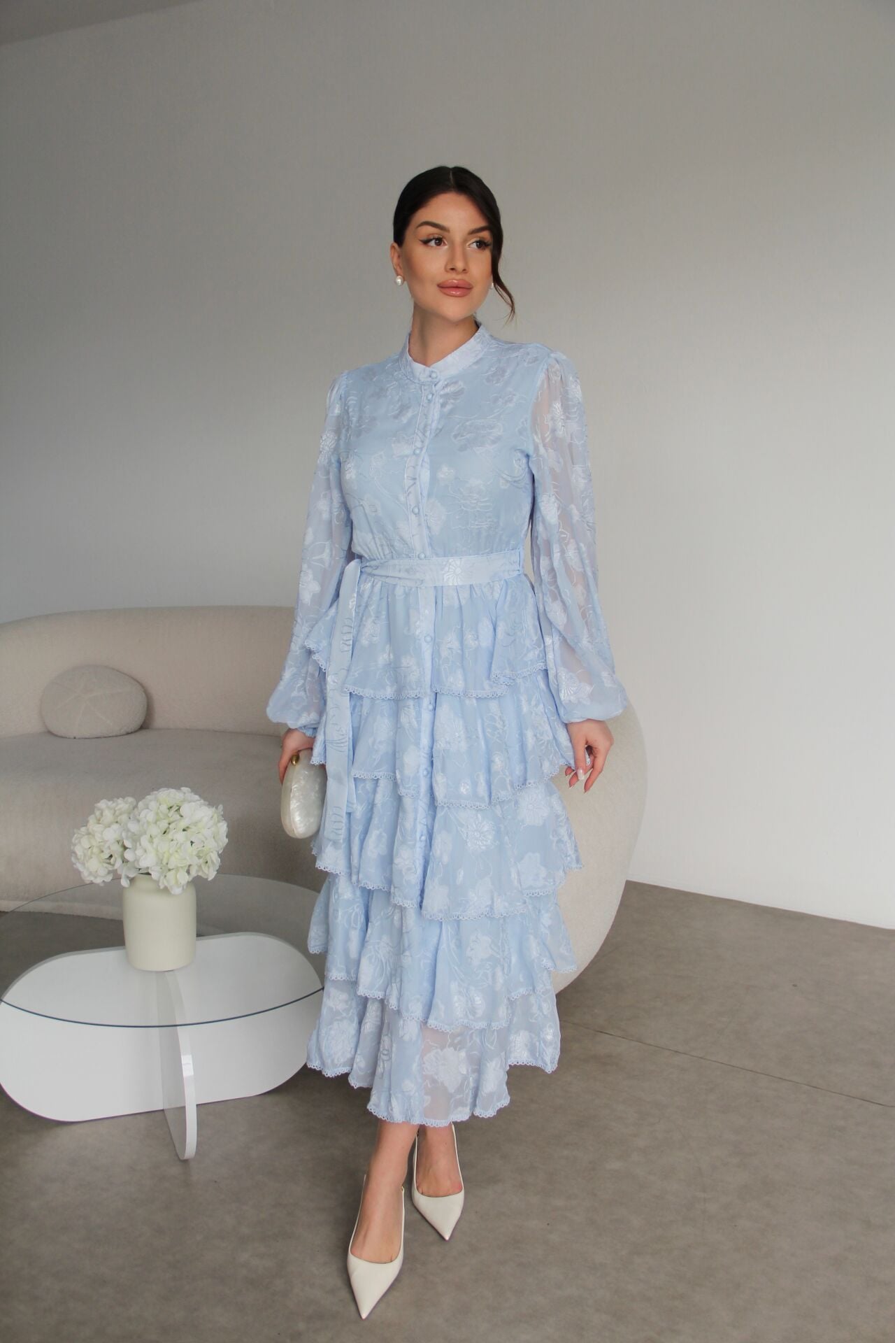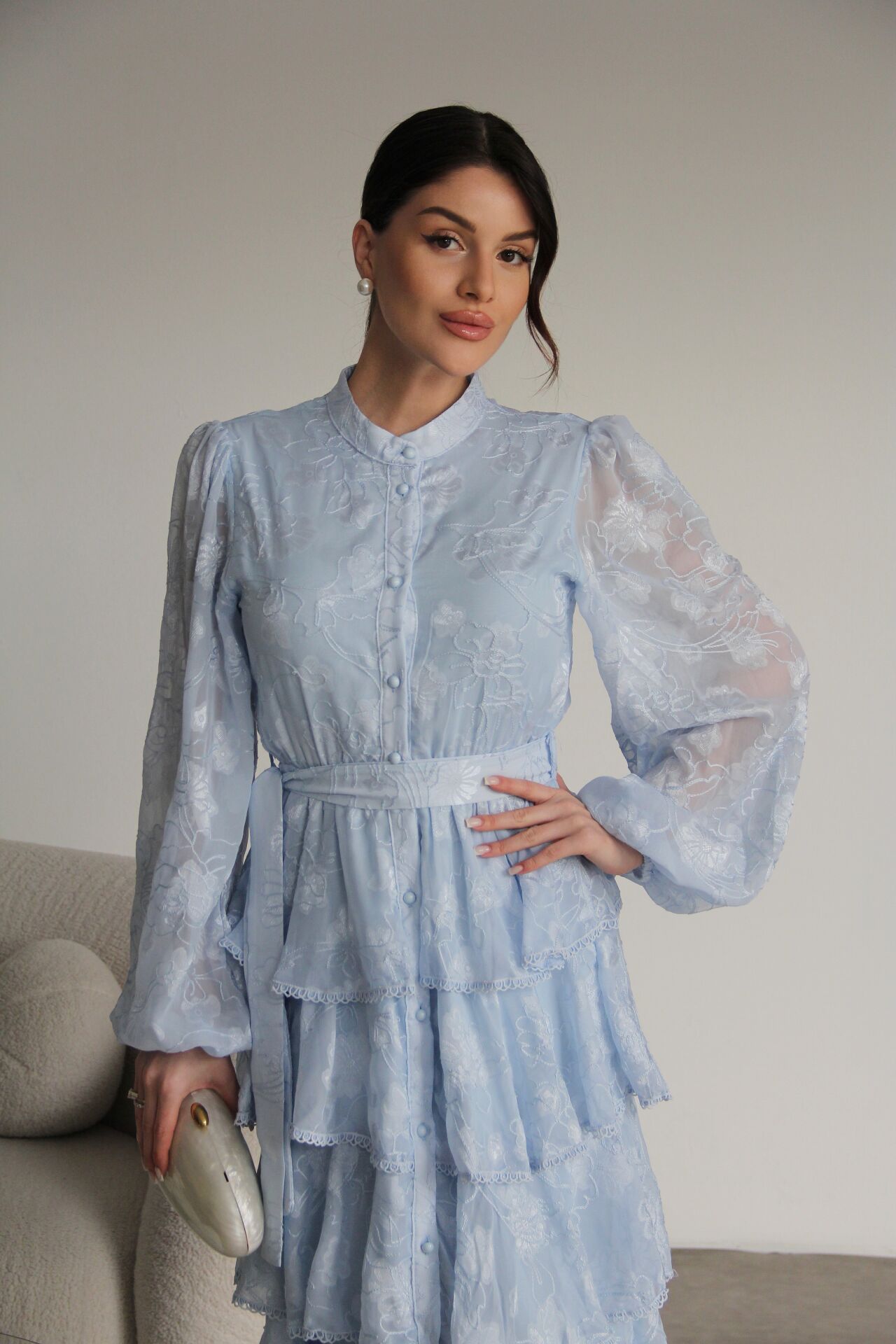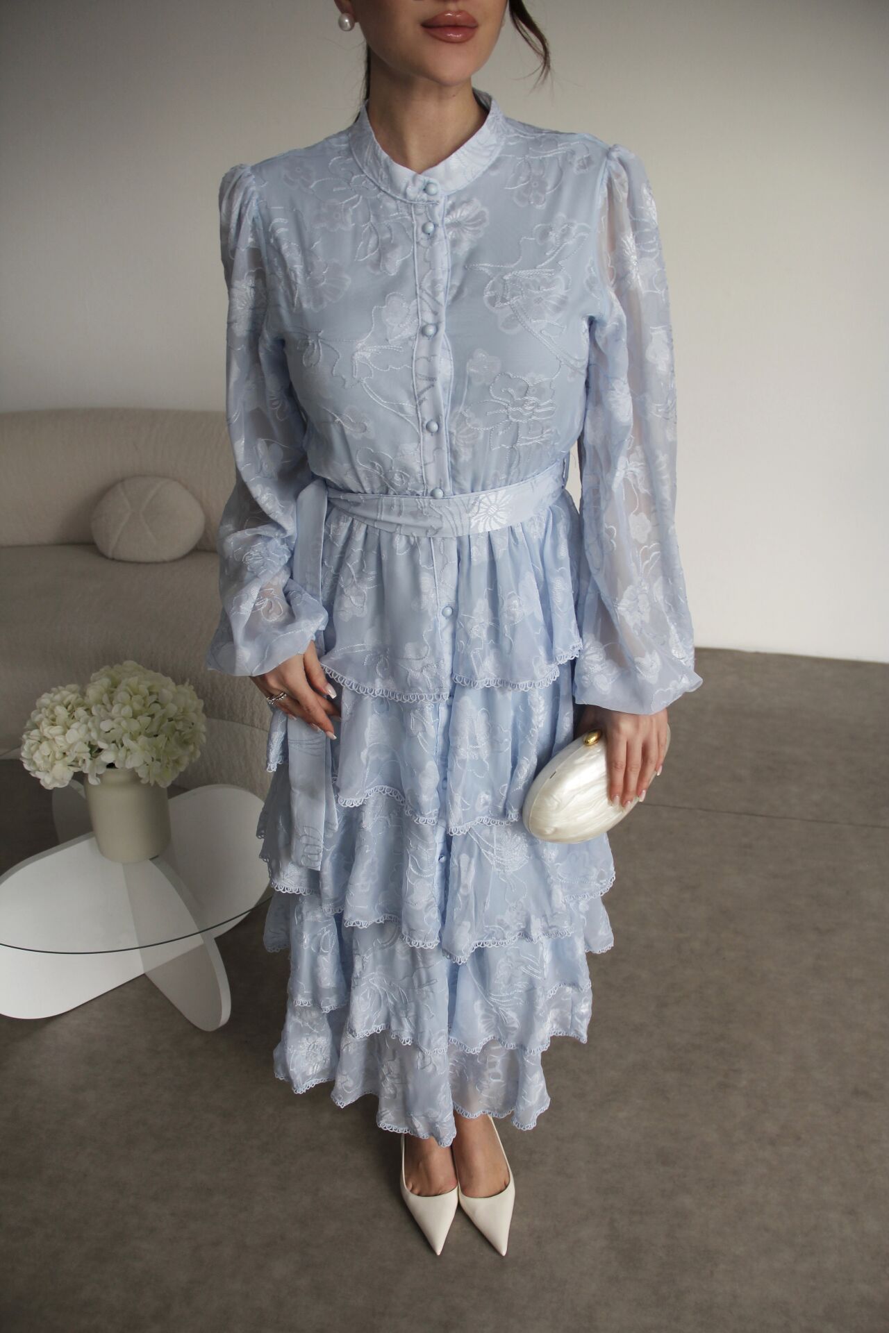 - - Boydan Düğmeli Nakışlı Kuşaklı Beli Lastik Detaylı Kat Kat Premium Tasarım Elbise.; Elbise Boyu:130cm(Ortalama), Kumaş Bilgisi:%100 Polyester.; Boydan düğmeli tasarımı ile şık ve modern bir görünüm sunar.; - Nakış detayları, elbiseye zarif bir dokunuş katarken, kuşaklı yapısıyla belinizi vurgular.; - Beli lastik detaylı olması sayesinde rahat bir kullanım sağlar ve farklı vücut tiplerine uyum gösterir.; - İnce kumaşı ile hafif ve konforlu bir deneyim sunar, mevsim geçişlerinde idealdir.; - Hakim yaka tasarımı, sofistike bir hava katar ve günlük kullanım için uygundur.; - Tüm sezonlar için uygun olan bu elbise, gardırobunuzun vazgeçilmez parçası olmaya adaydır.;Zarif hakim yaka tasarımı ile dikkat çeken bu elbise, her ortamda şıklığınızı ön plana çıkarır.; - Çiçekli deseniyle canlı ve enerjik bir görünüm sunan mavi renk seçeneği, gardırobunuzun vazgeçilmezi olacak.; - Midi boyu ile hem rahatlık hem de zarafeti bir arada sunan bu elbise, günlük kullanım için idealdir.; - İç göstermeyen ince dokuma kumaşı sayesinde rahat bir kullanım sağlar ve şık bir siluet oluşturur.; - Slim kalıbı ile vücut hatlarınıza mükemmel uyum sağlarken, A-line kesimi feminen bir duruş kazandırır.; - Full düğme kapama detayı ve kuşaklı tasarımı ile kolayca kişiselleştirilebilir bir stil sunar.; - Kolsuz ve uzun kol boyu kombinasyonu, mevsim geçişlerinde bile rahatlıkla tercih edilebilmesini sağlar.; - Astarlı yapısı ile konforlu bir kullanım sunarken, şifon dokuma tipi hafifliğiyle hareket özgürlüğü sağlar.; - Sürdürülebilirlik detayı ile çevre dostu bir tercih yapmanızı sağlar.; - Kuru temizleme talimatına uygun olması, uzun süreli kullanım için idealdir.; - Yetişkin kadınlar için tasarlanmış bu elbise, cool & comfort persona ile günlük şıklığınızı tamamlar.