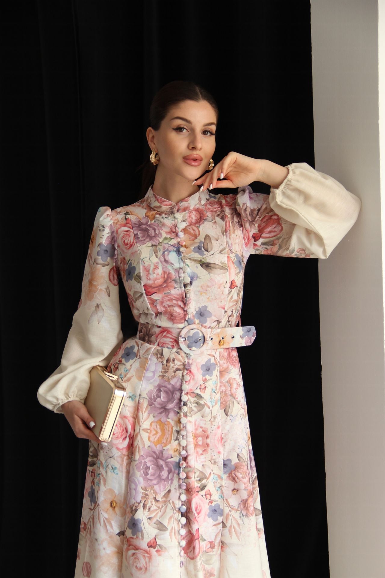 Boydan Düğmeli Dik Yaka Desenli Kemerli Midi Boy Premium Tasarım Keten Elbise
