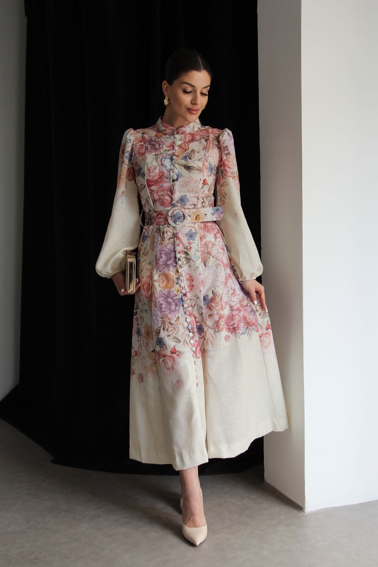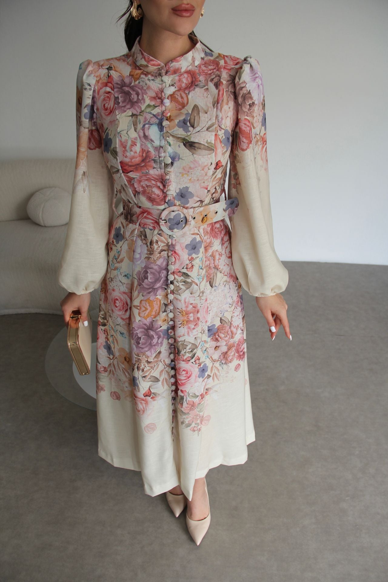 Bej Boydan Düğmeli Dik Yaka Desenli Kemerli Midi Boy Premium Tasarım Keten Elbise(Ön sipariş 16.03.2026))