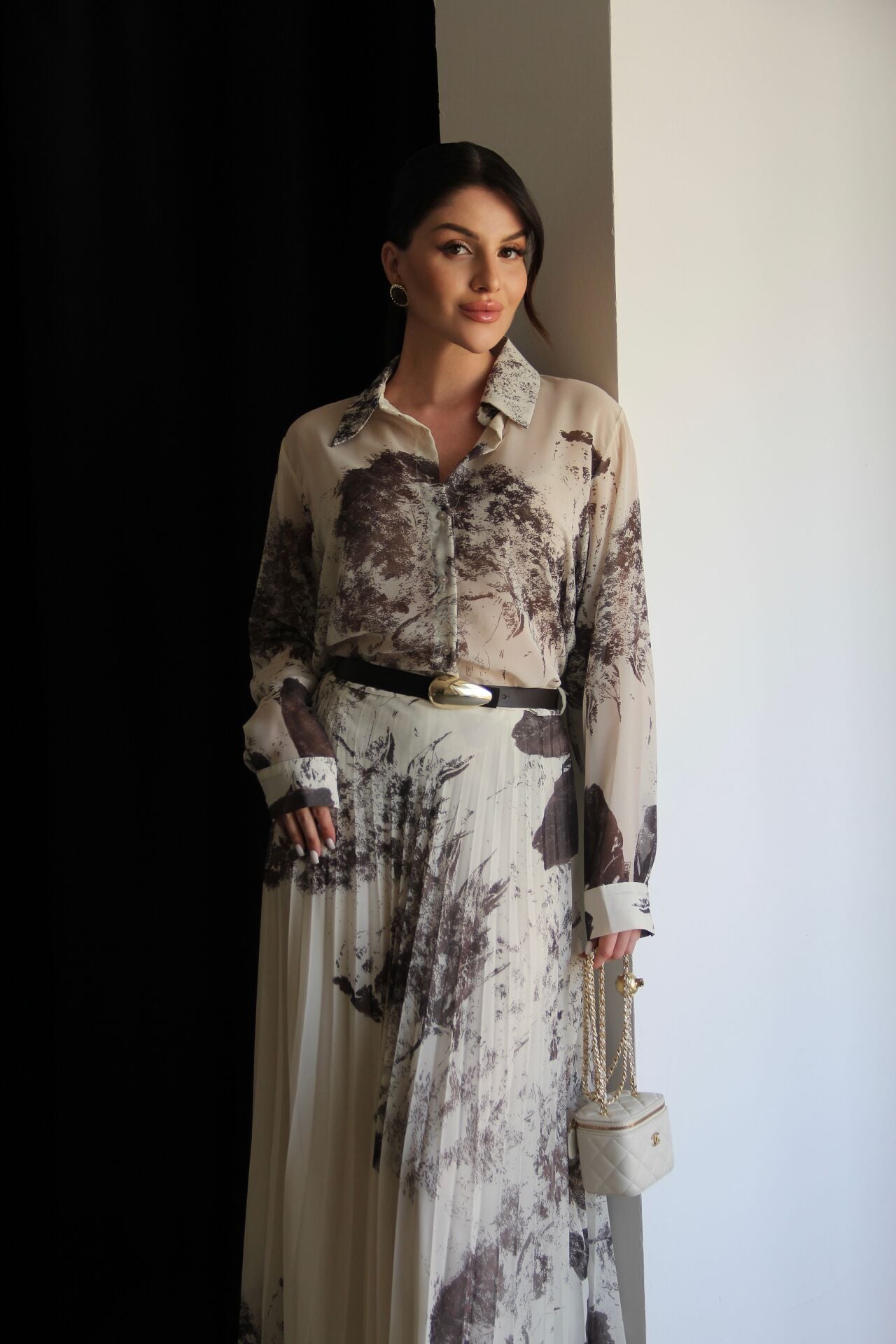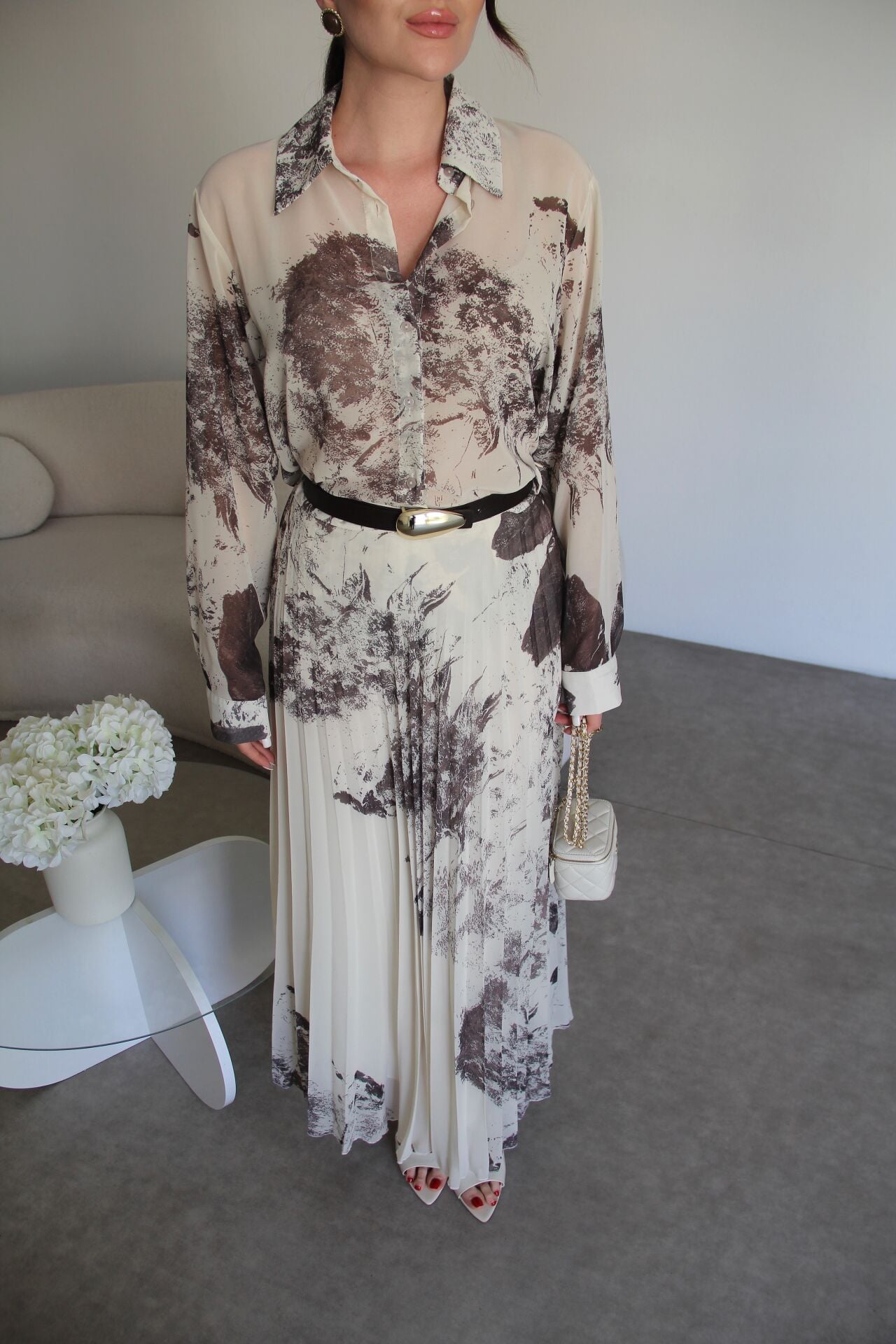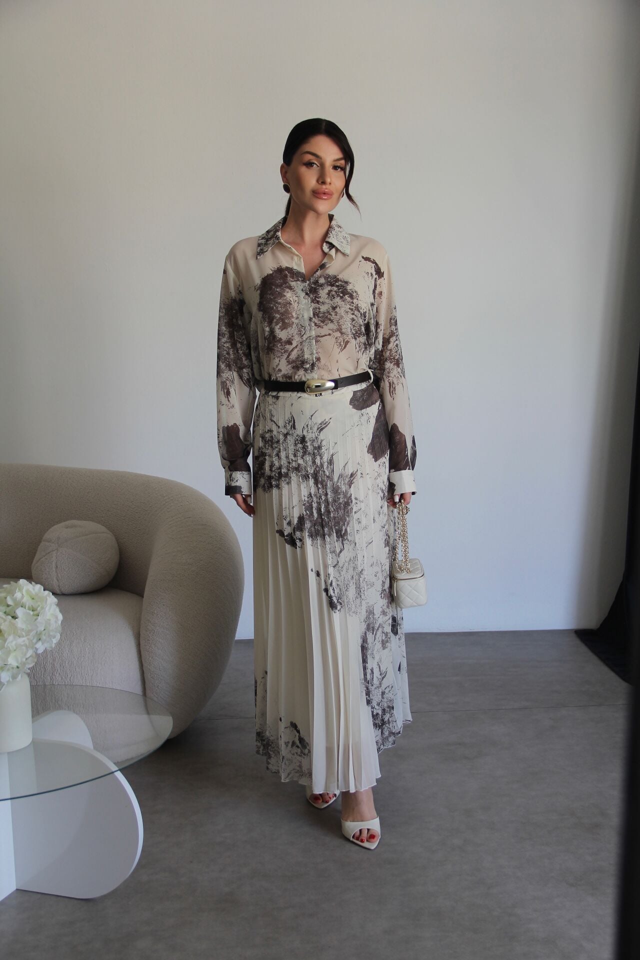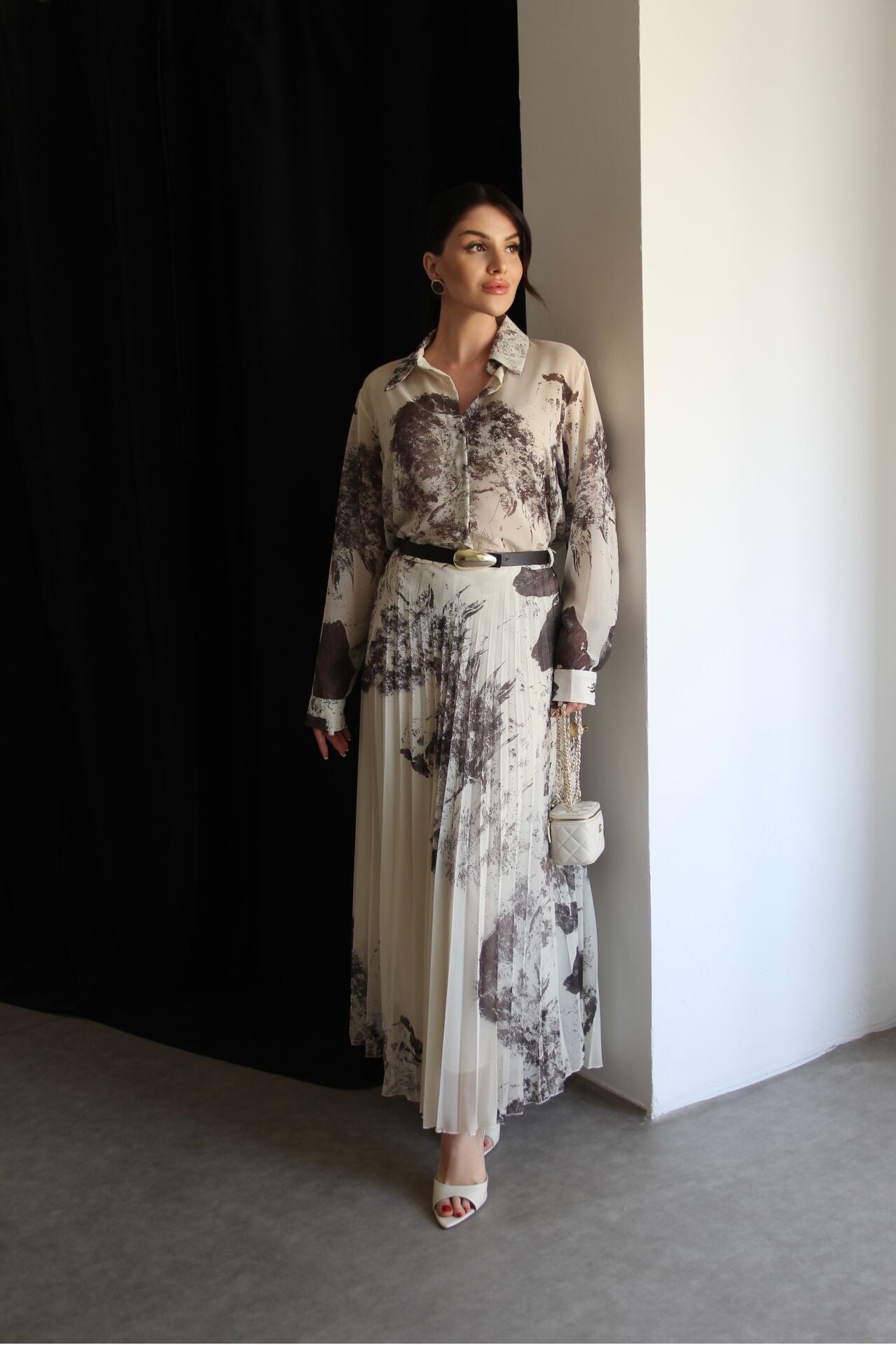 Bej Desenli Gömlek ve KEMERLİ Piliseli Astarlı Maxi Uzun Etek Premium Şifon Takım