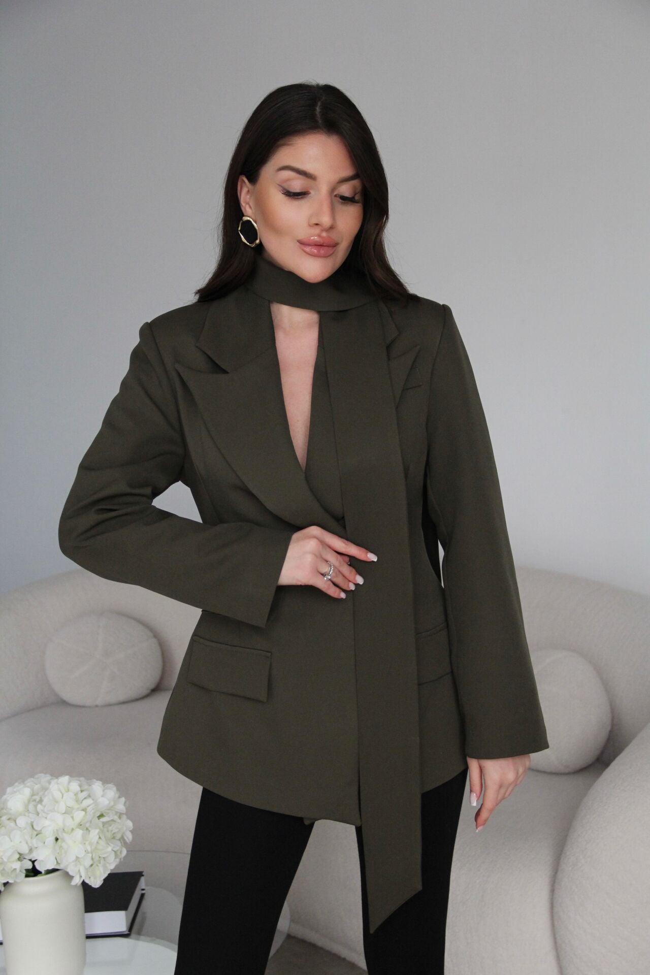 Haki Bele Oturan Kuşak Detaylı Tasarım Blazer Ceket