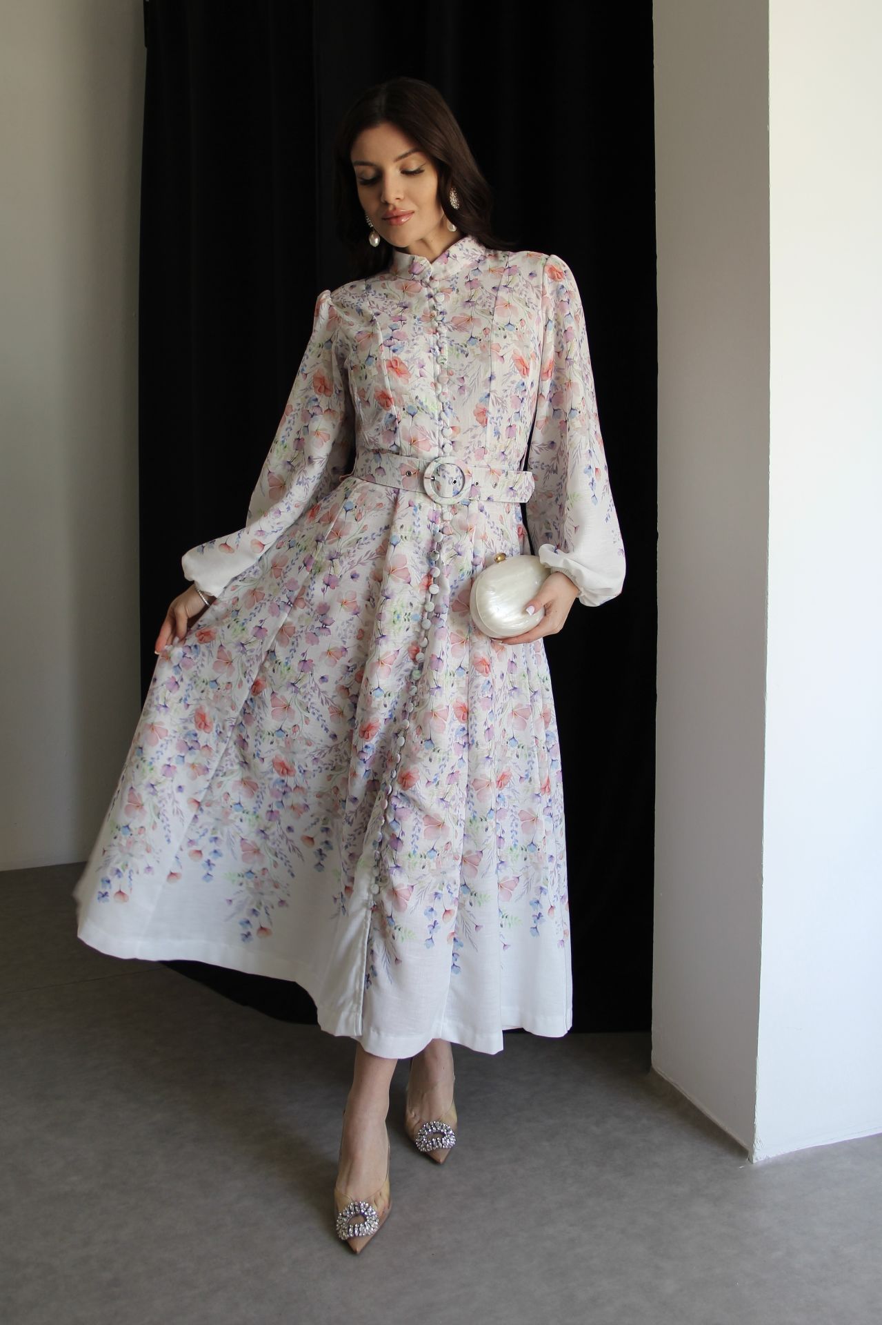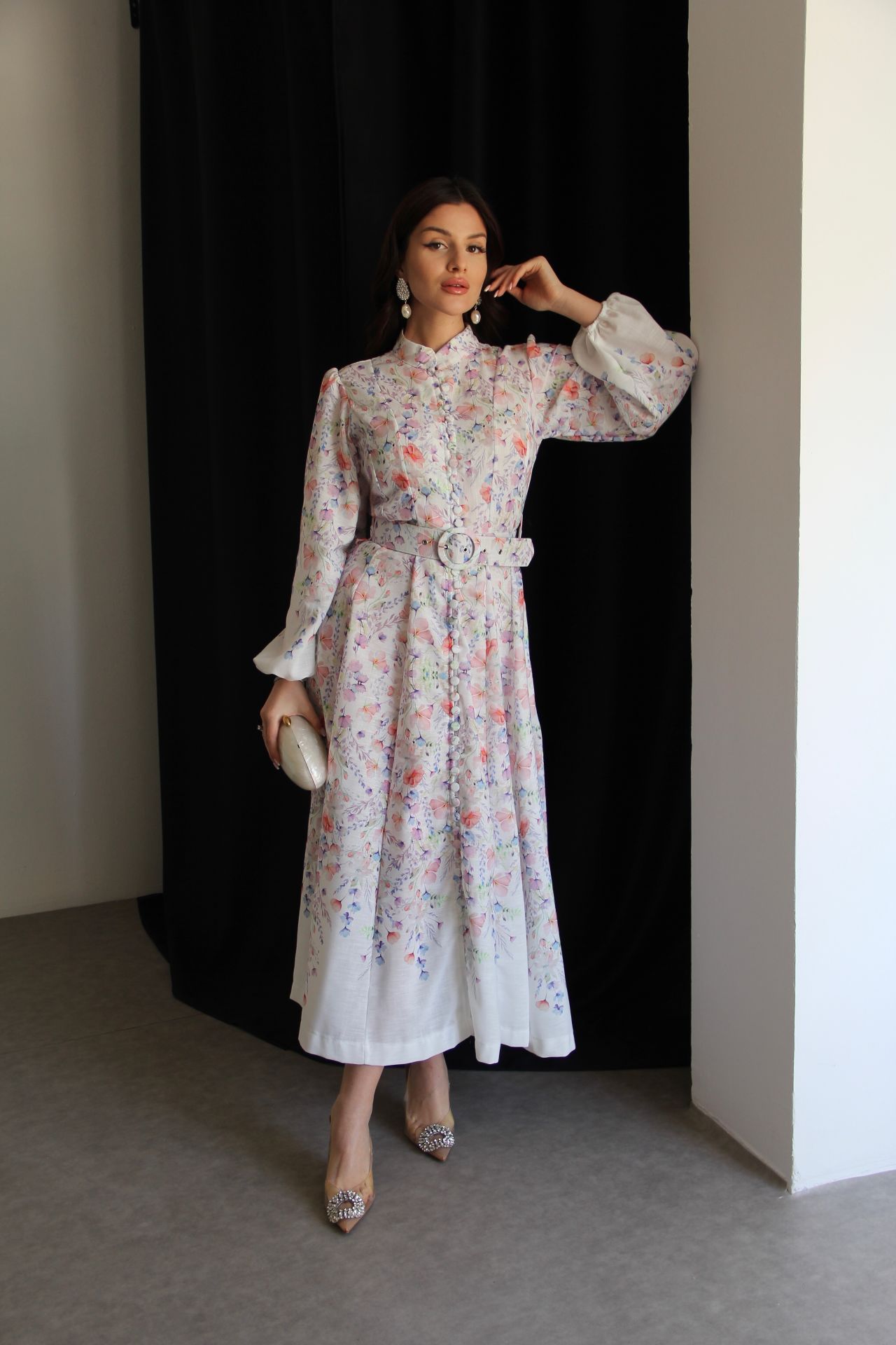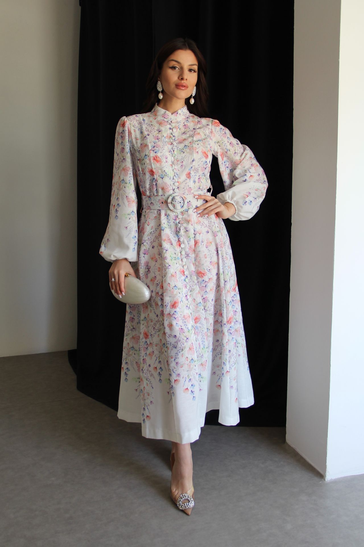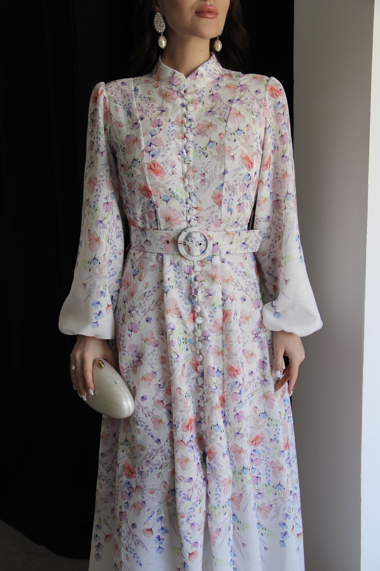 Beyaz Boydan Düğmeli Dik Yaka Desenli Kemerli Midi Boy Premium Tasarım Keten Elbise(Ön sipariş:16.03.2026))