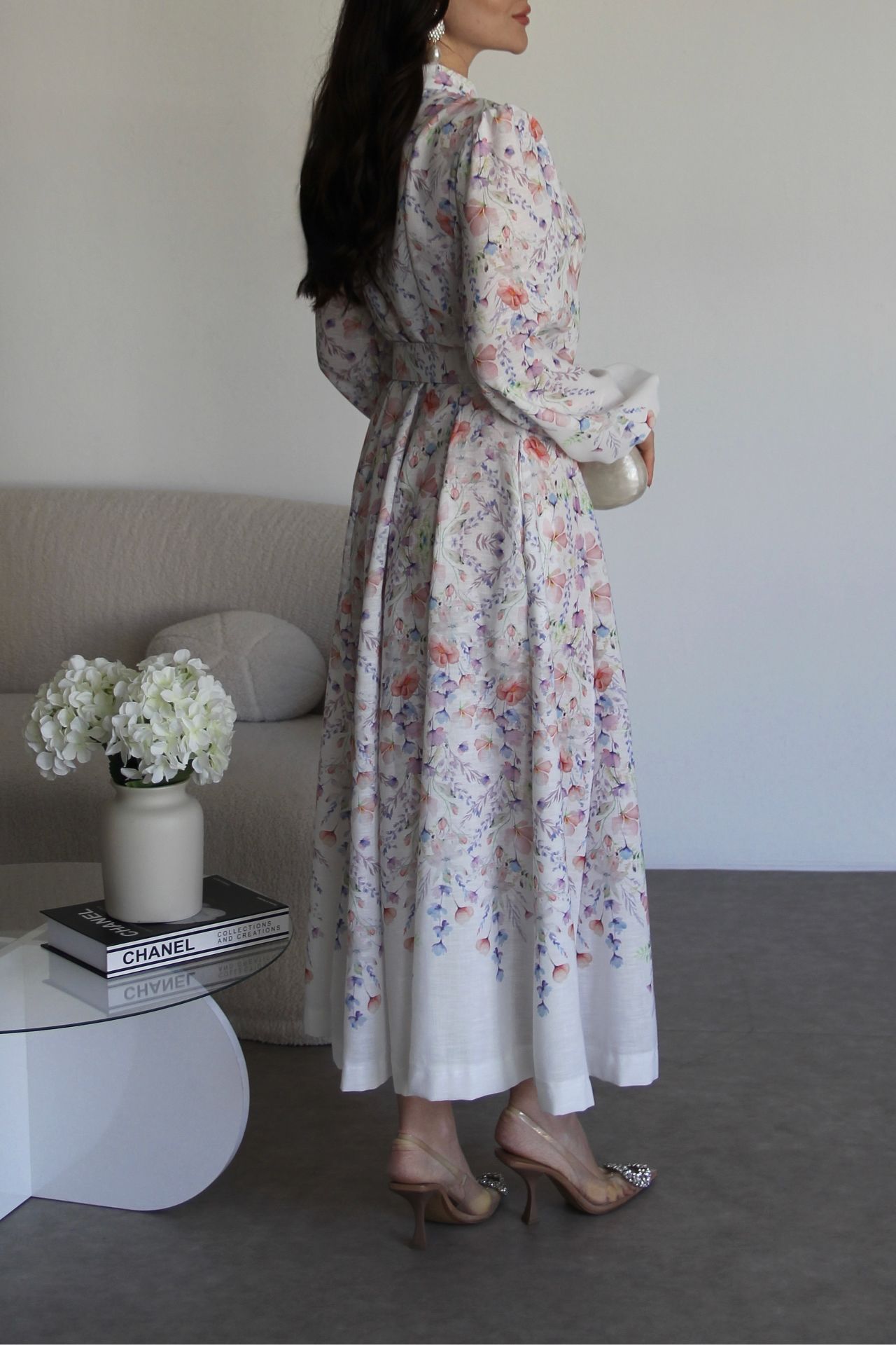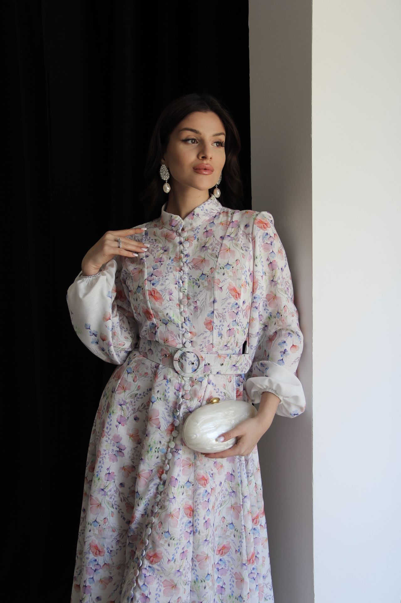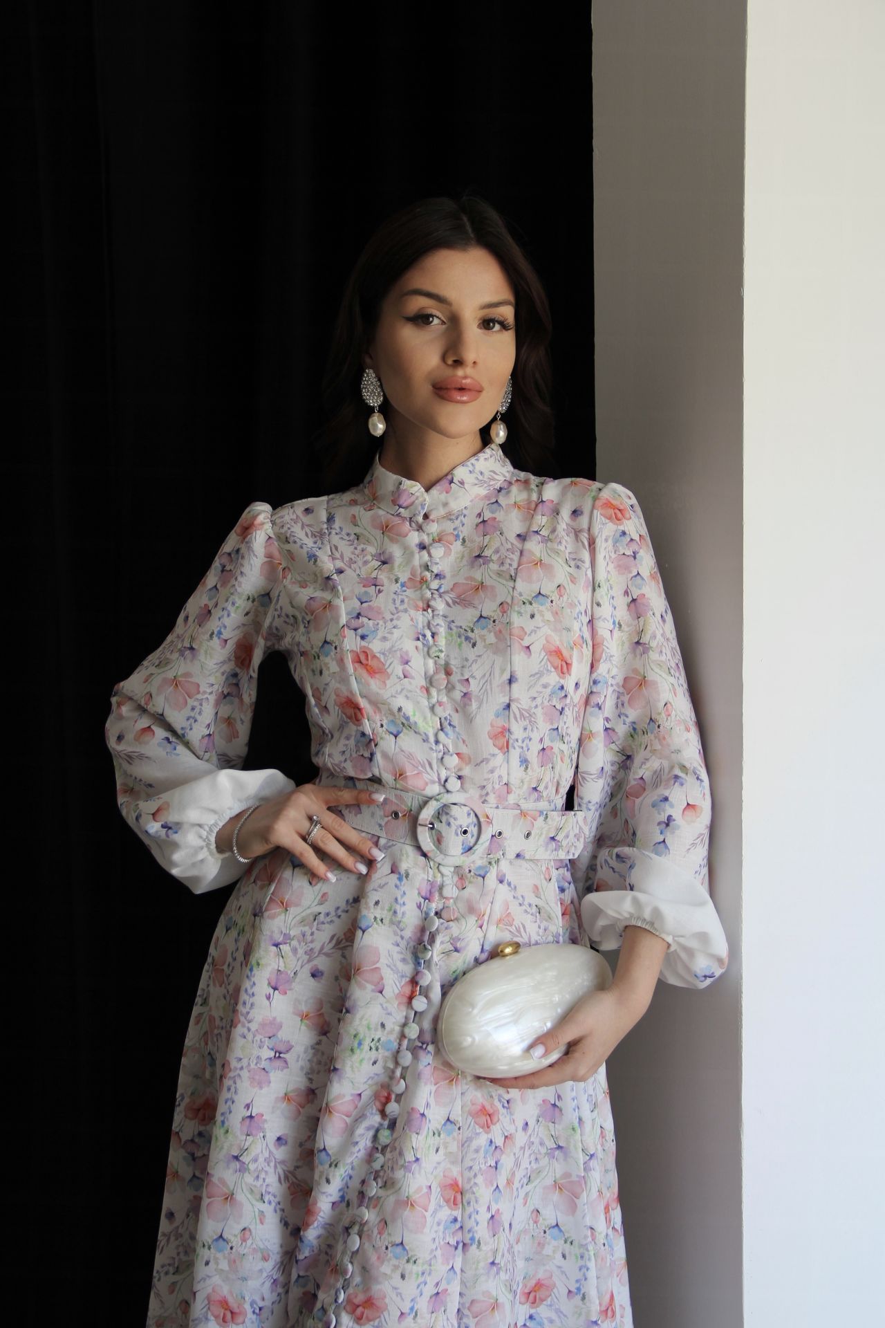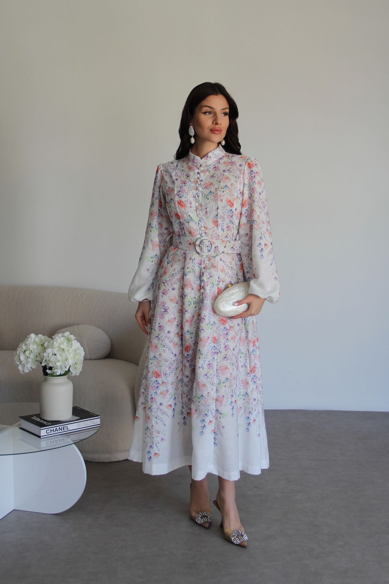 Beyaz Boydan Düğmeli Dik Yaka Desenli Kemerli Midi Boy Premium Tasarım Keten Elbise(Ön sipariş:16.03.2026))