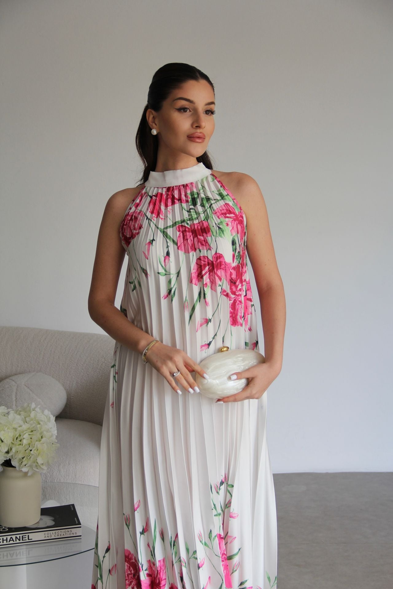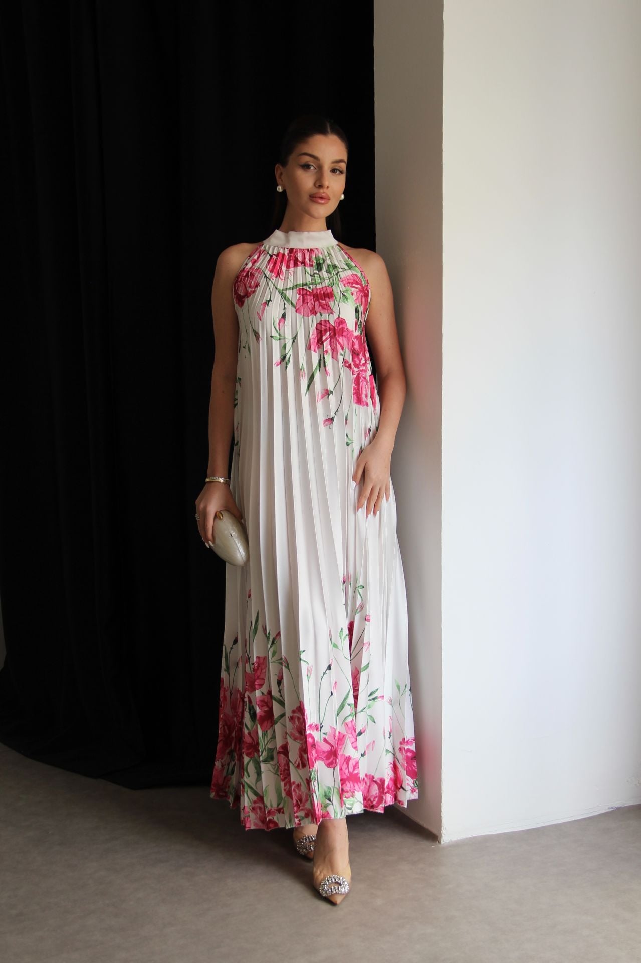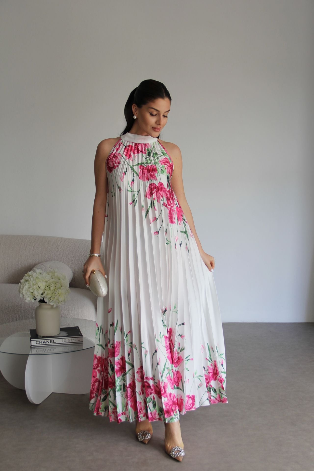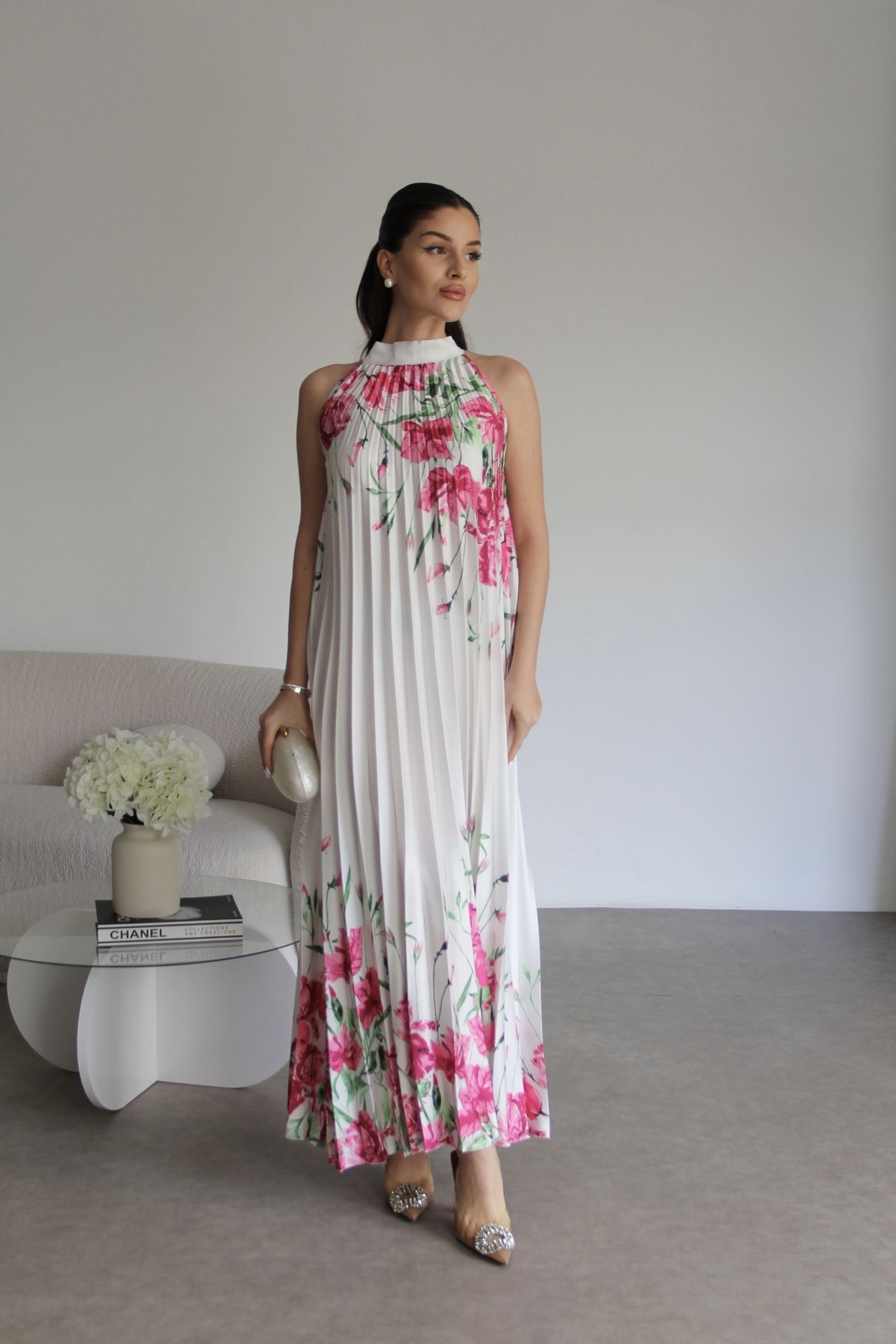 Beyaz Boyundan Bağlamalı Gül Desenli Piliseli Tasarım Saten Elbise