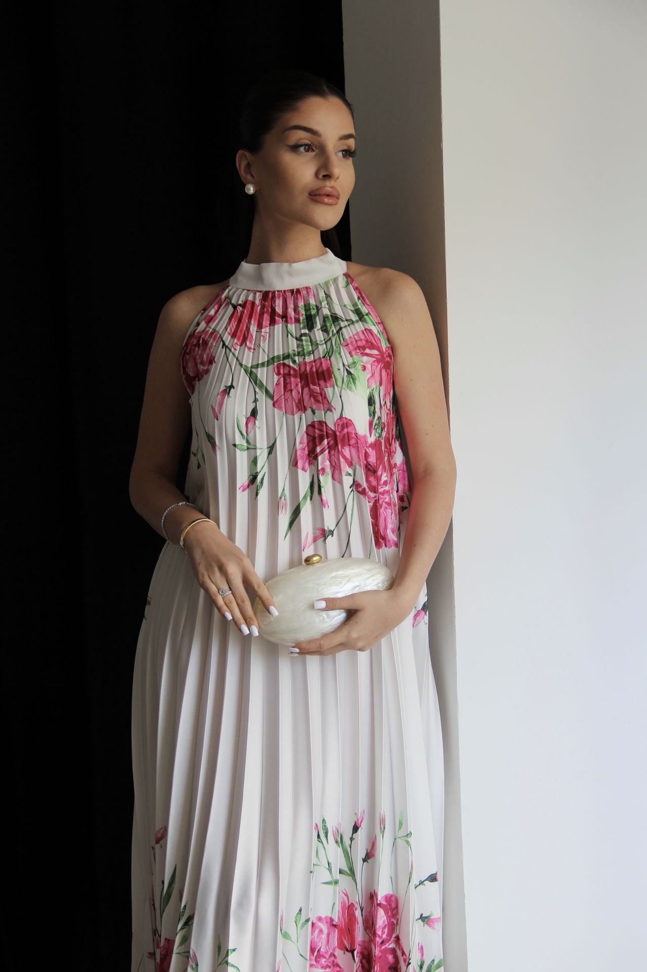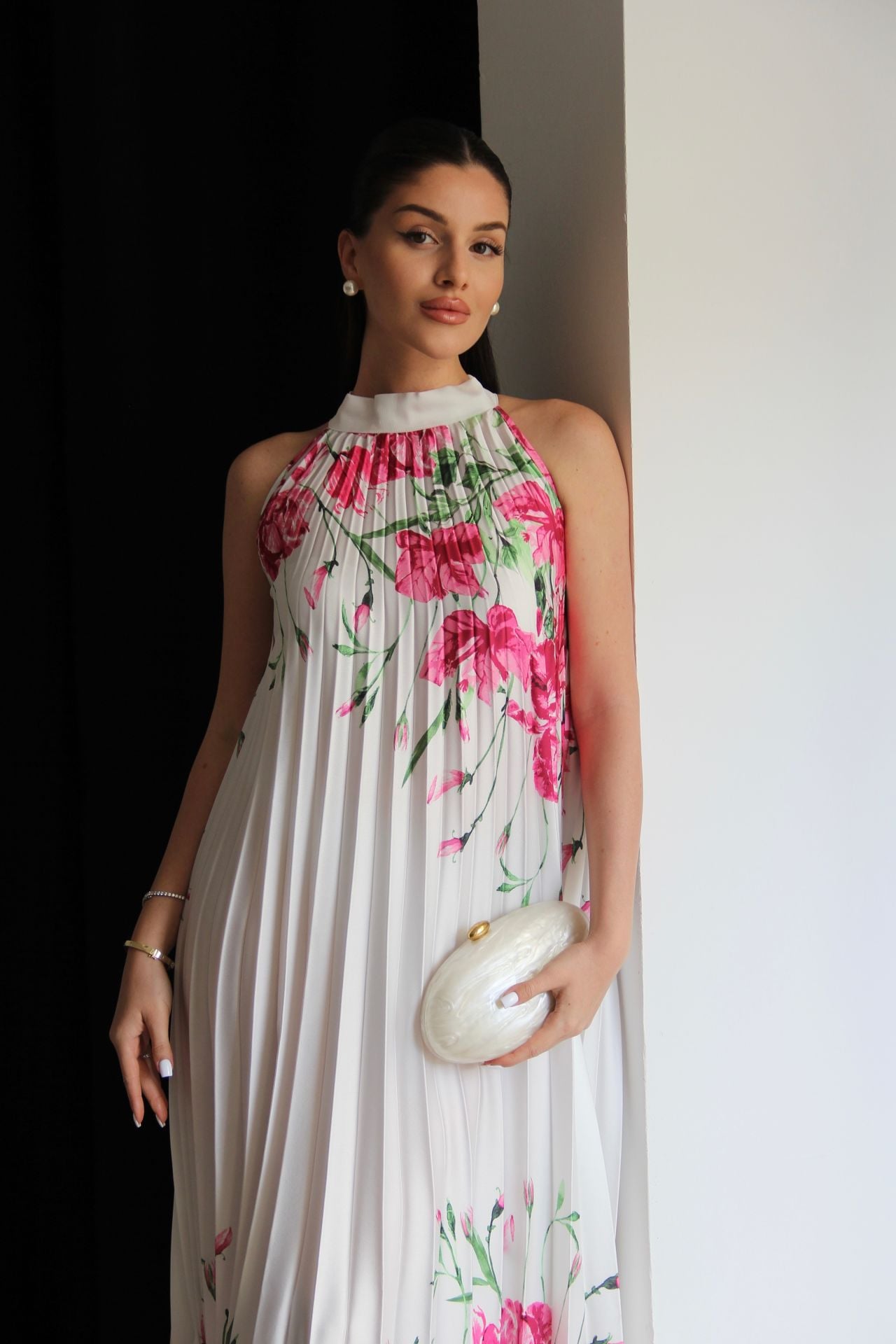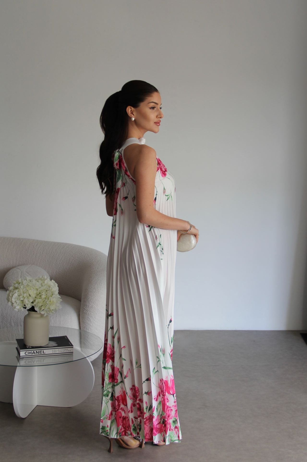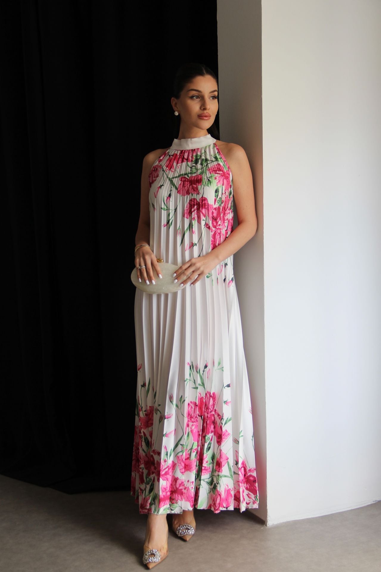 Beyaz Boyundan Bağlamalı Gül Desenli Piliseli Tasarım Saten Elbise