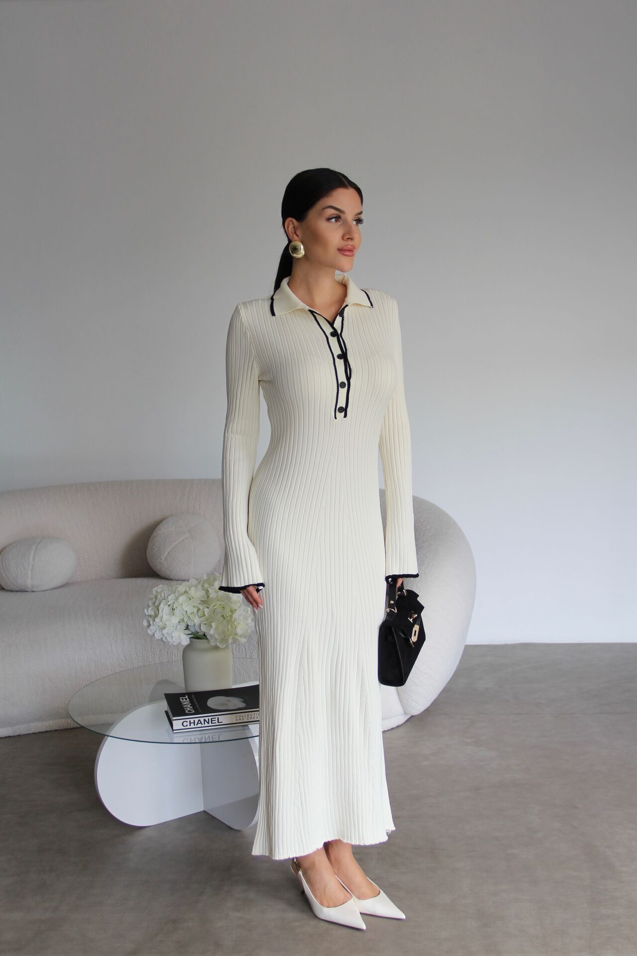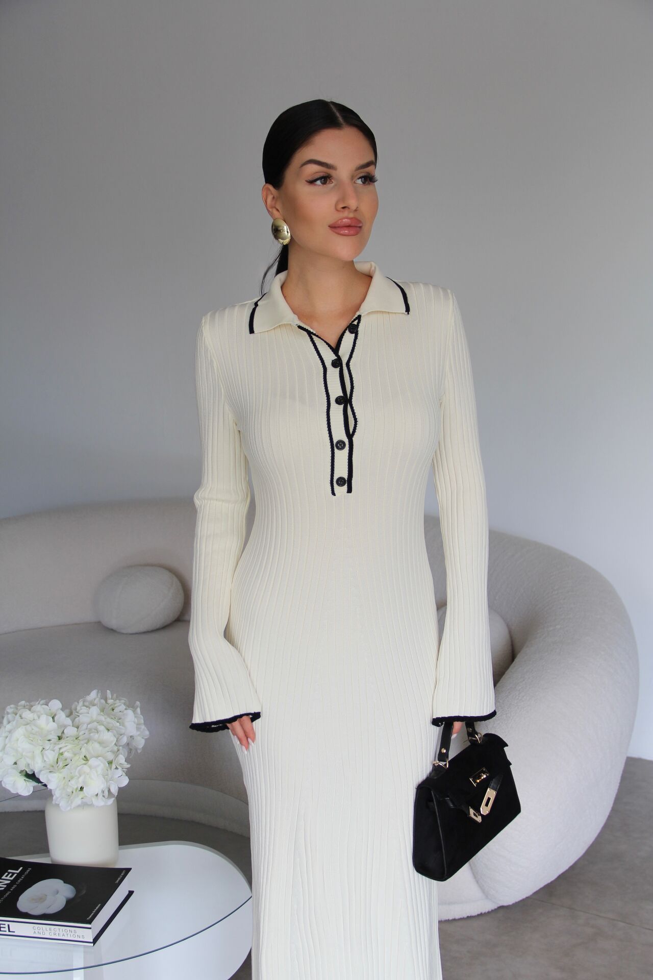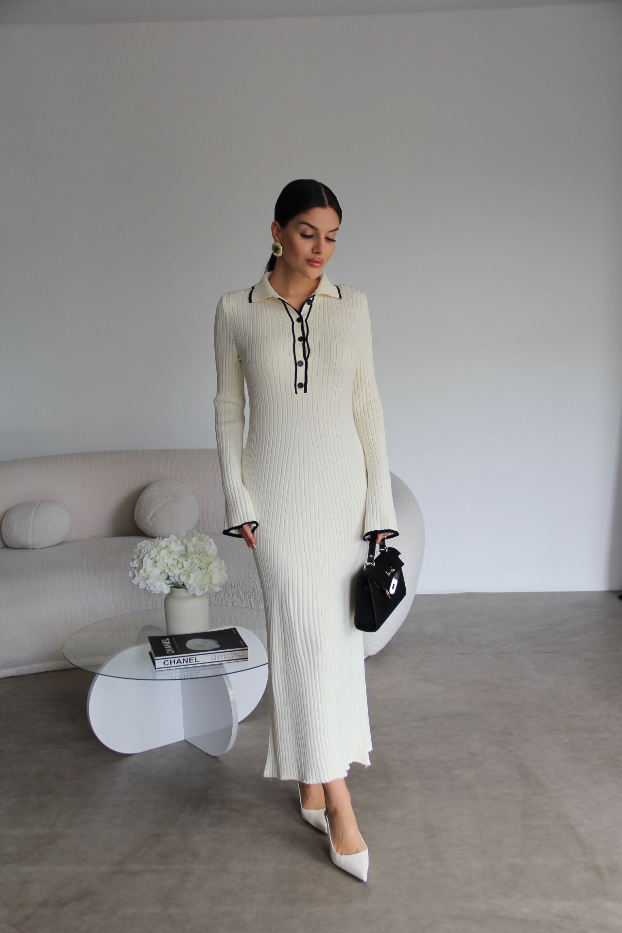 Beyaz Polo Yaka Düğme Detaylı Maxi UZUN Boy Premium Triko Elbise