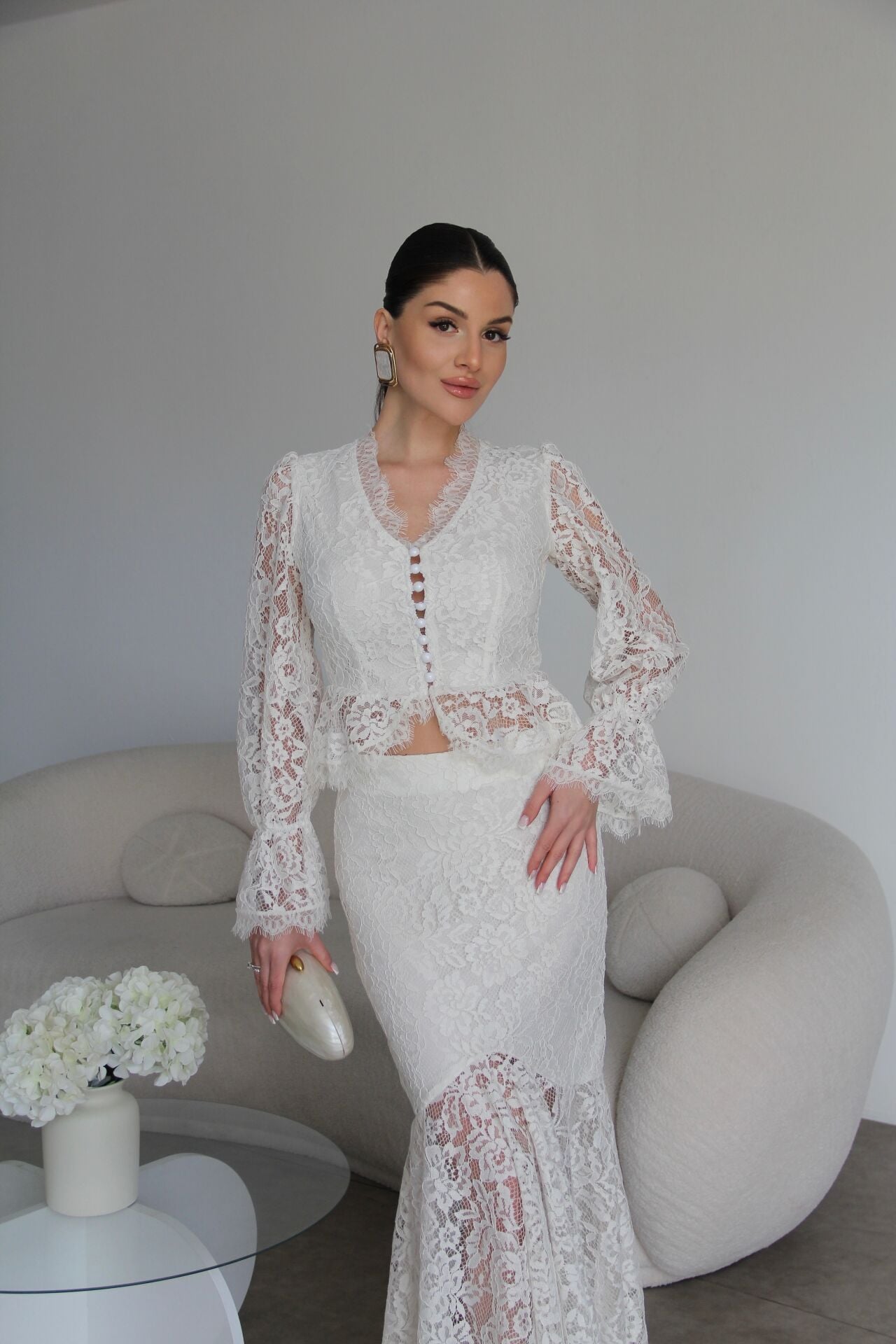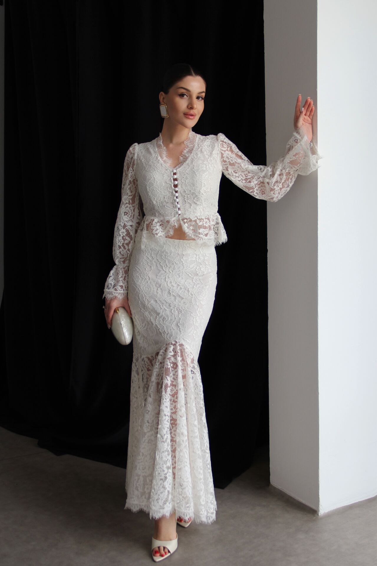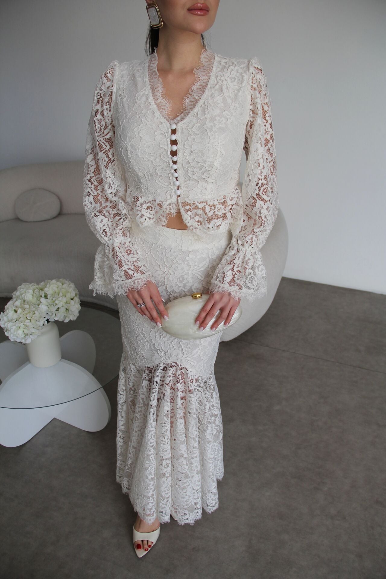 Beyaz V Yaka Astarlı inci düğmeli Bluz ve Maxi Etek Premium Tasarım Dantel Takım