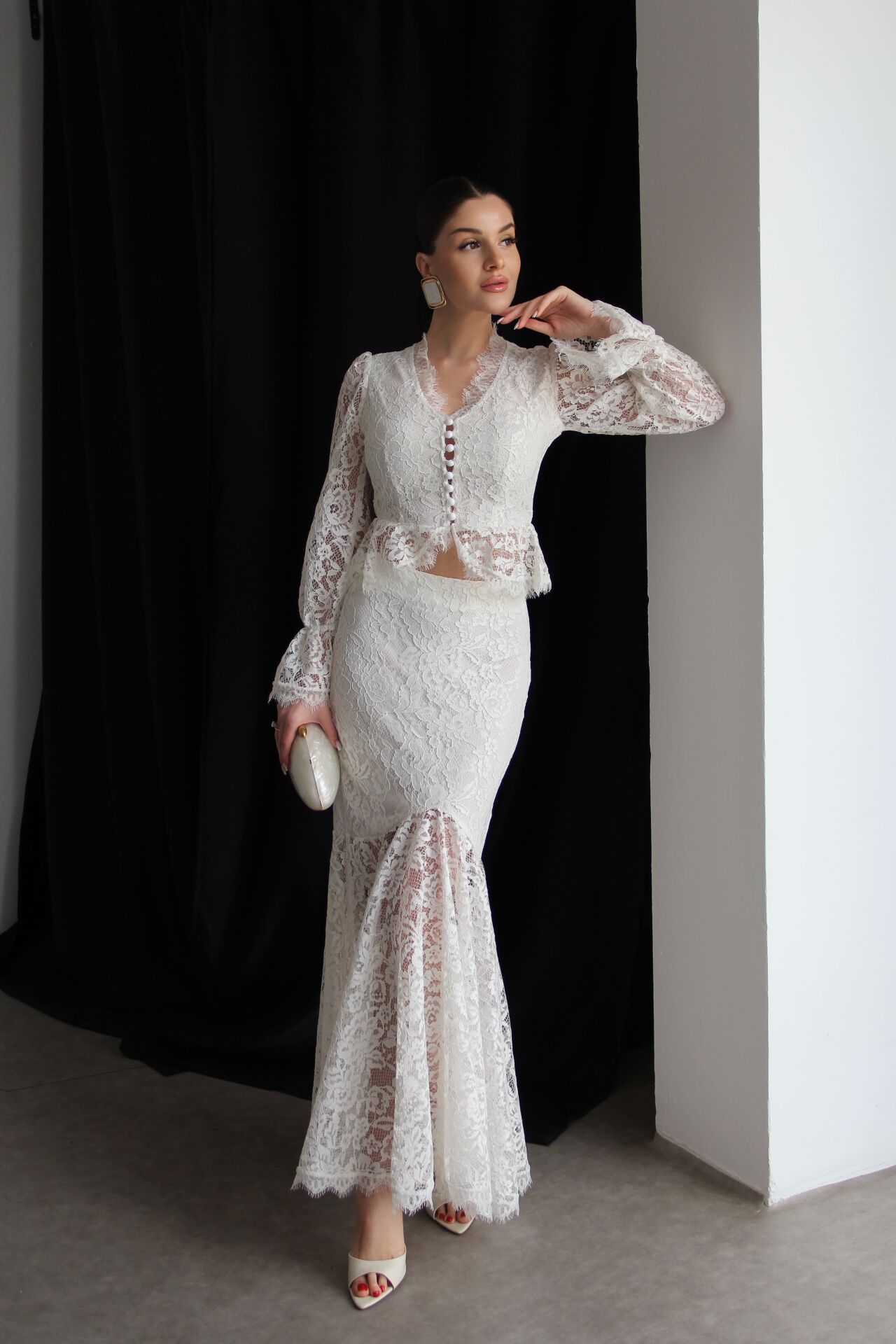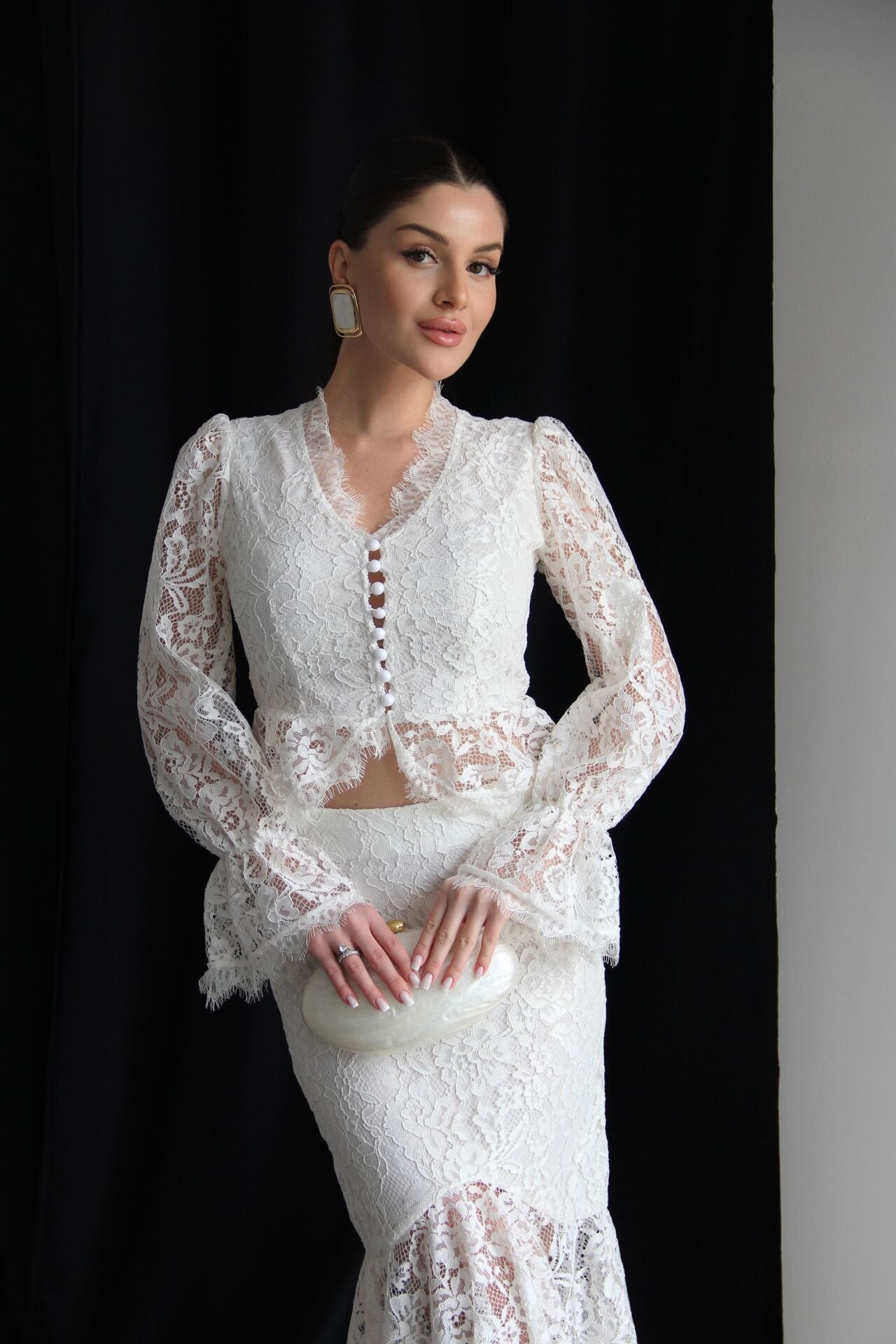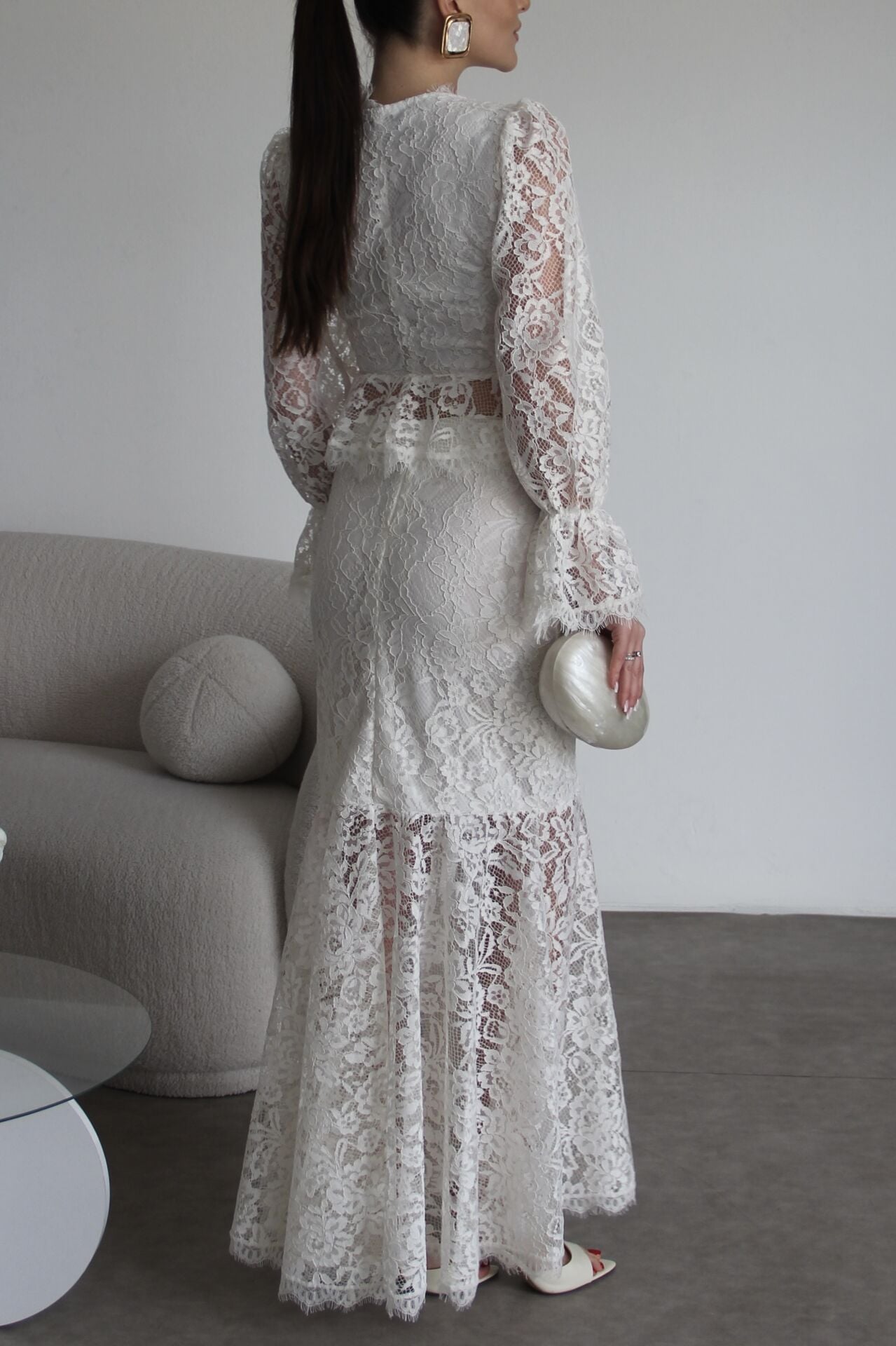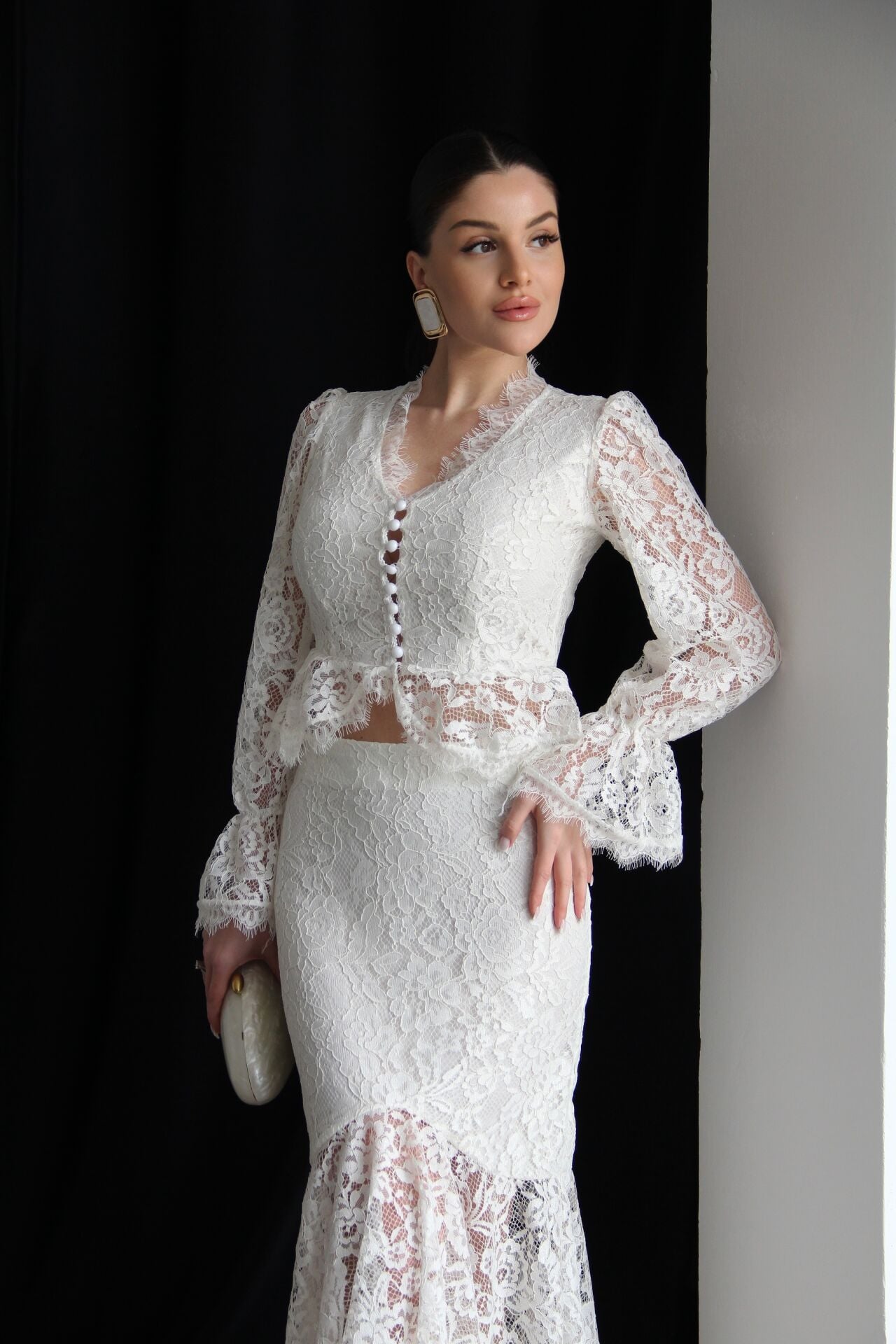 Beyaz V Yaka Astarlı inci düğmeli Bluz ve Maxi Etek Premium Tasarım Dantel Takım