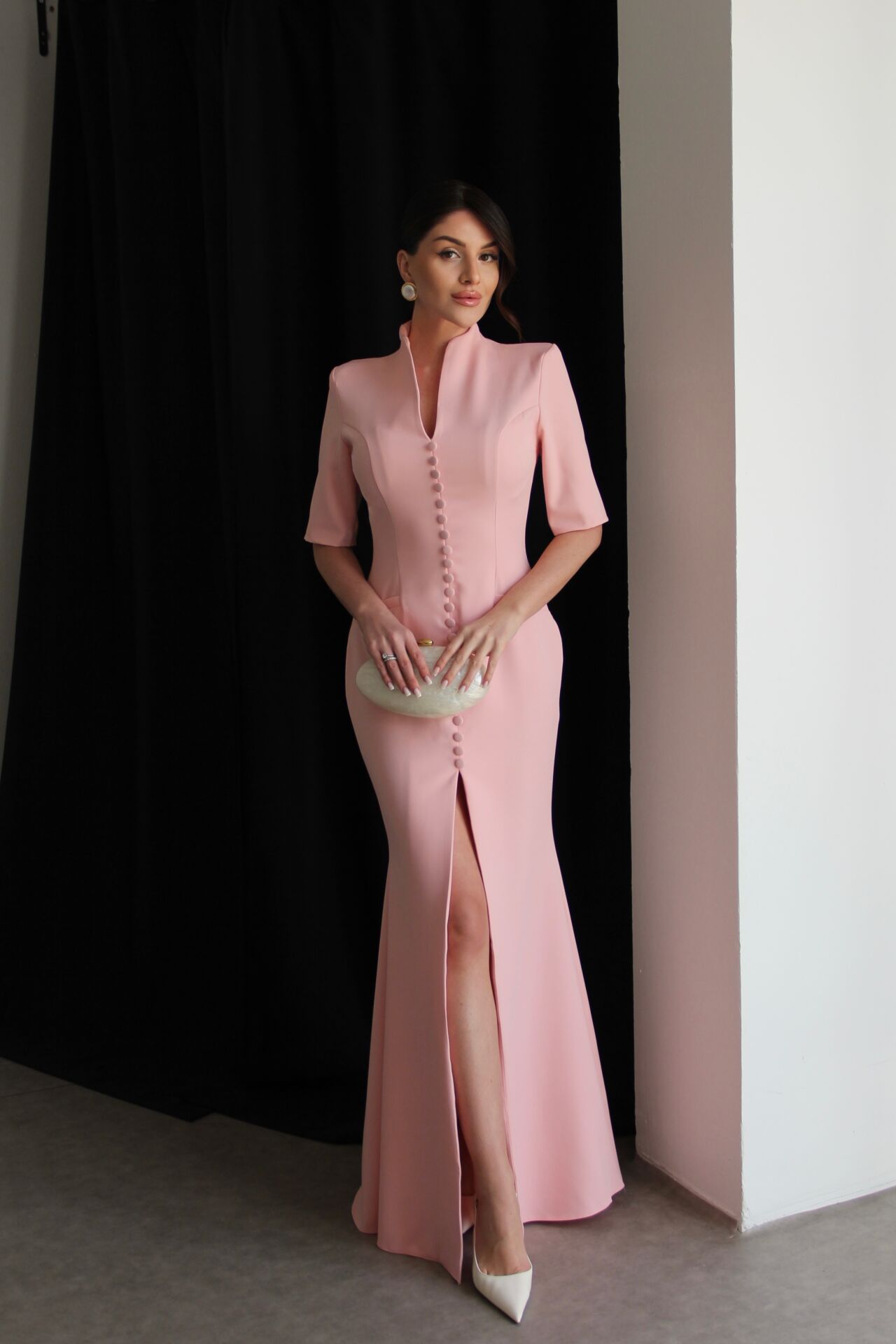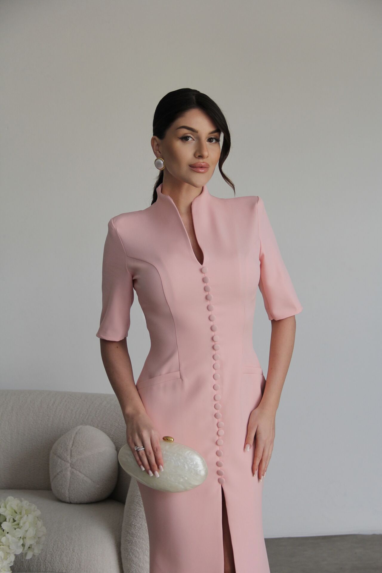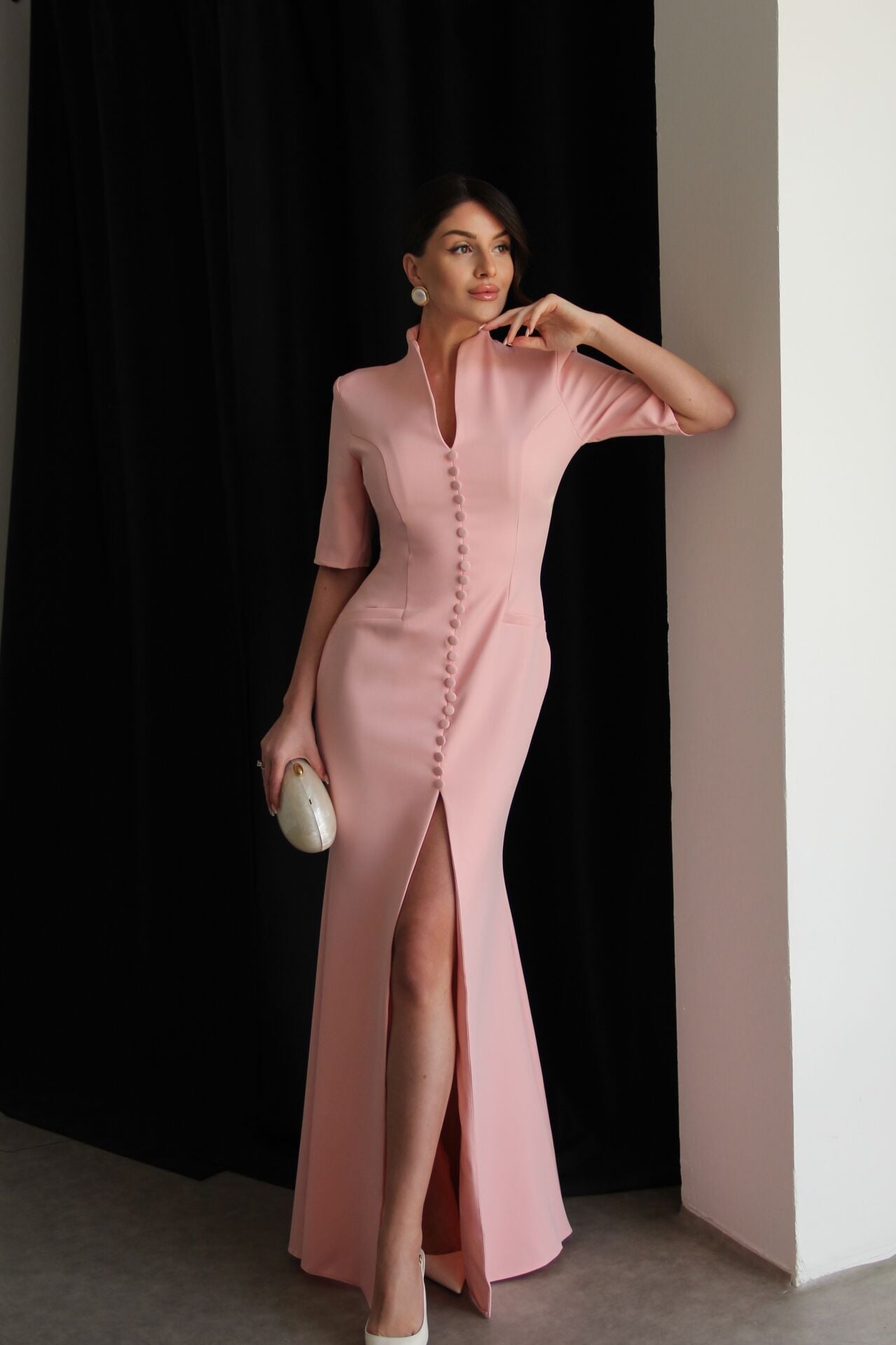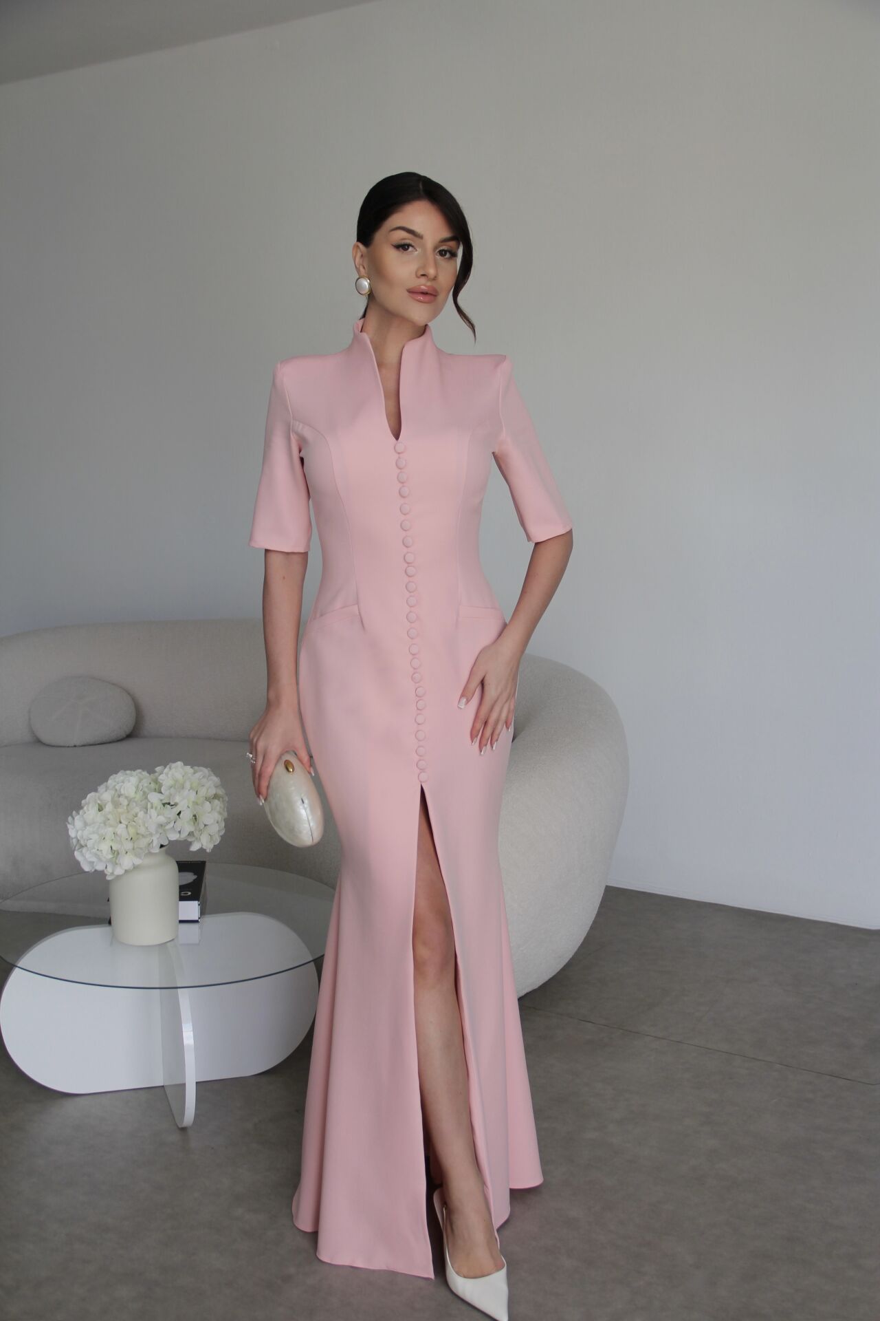 Pembe Vatkalı Boydan Düğme Detaylı V Yaka Yırtmaçlı Premium Maxi Uzun Takım