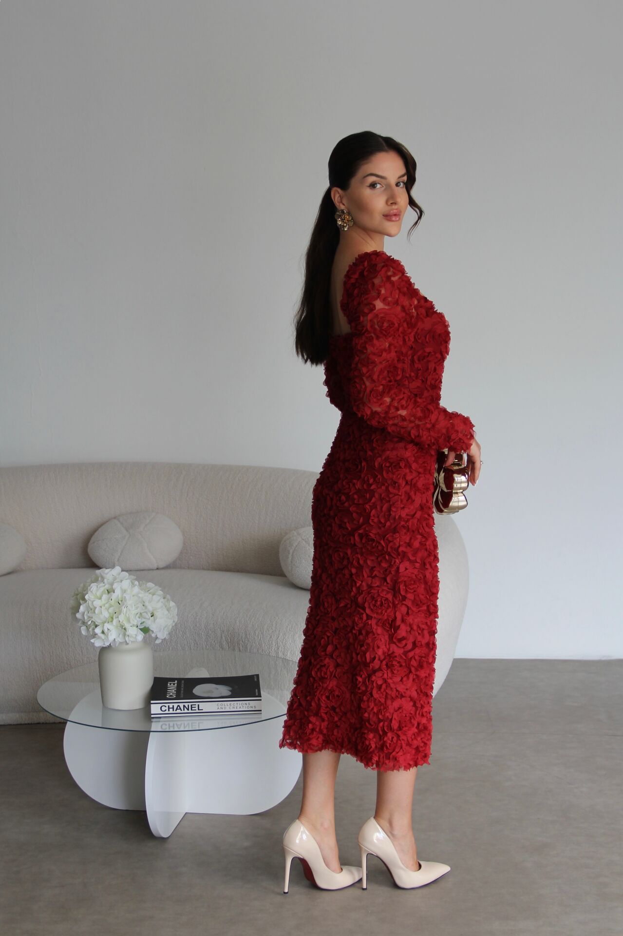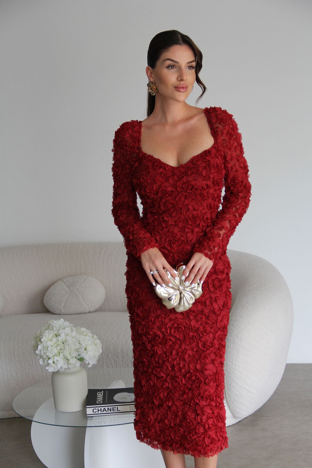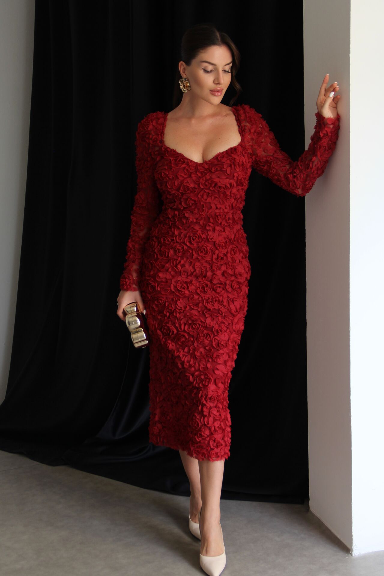 - Julidress Çok Yüksek Kalite 3 Boyutlu Gül Desenli (DAR KESİM) V Yaka Astarlı Midi Boy Premium Tasarım Elbise