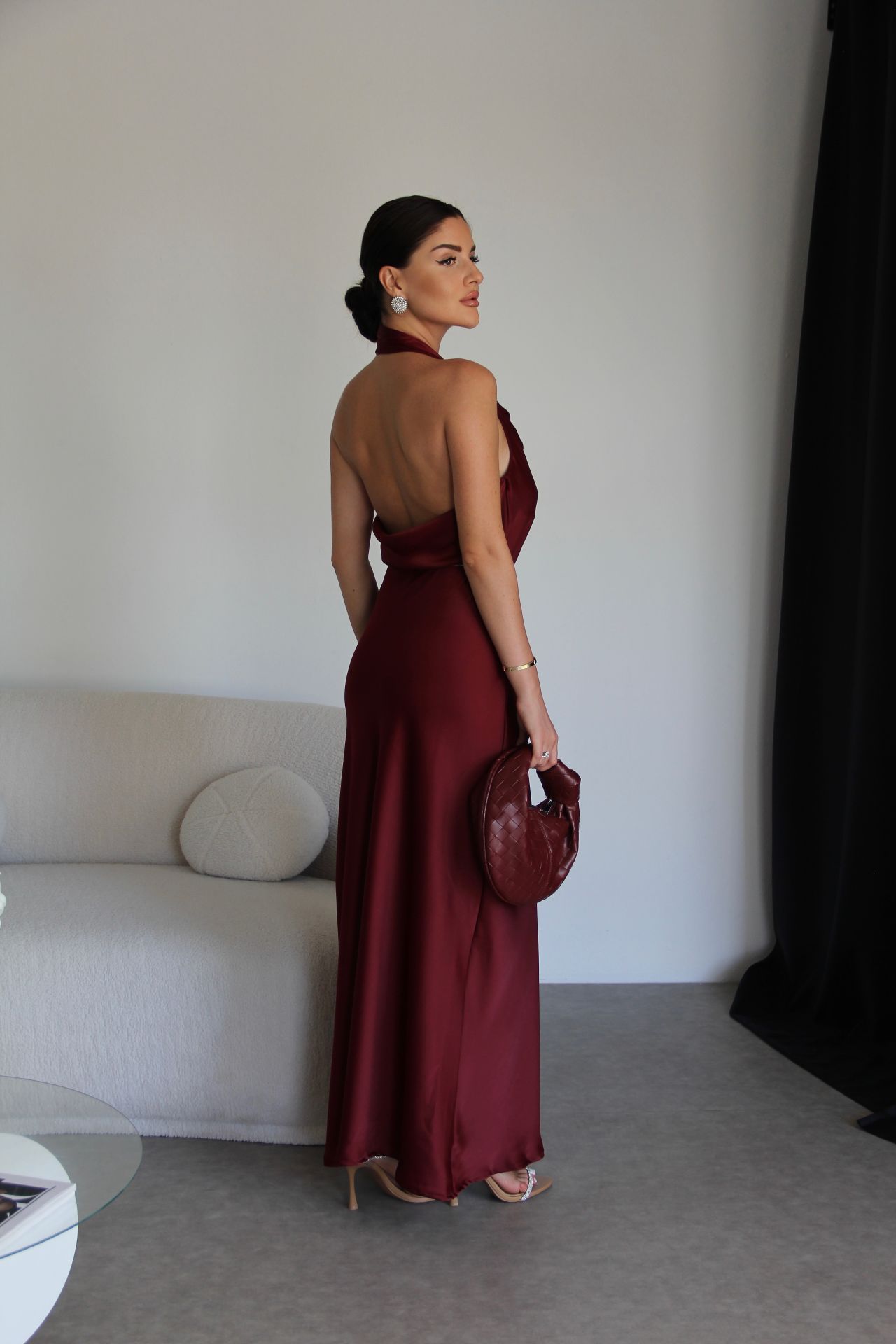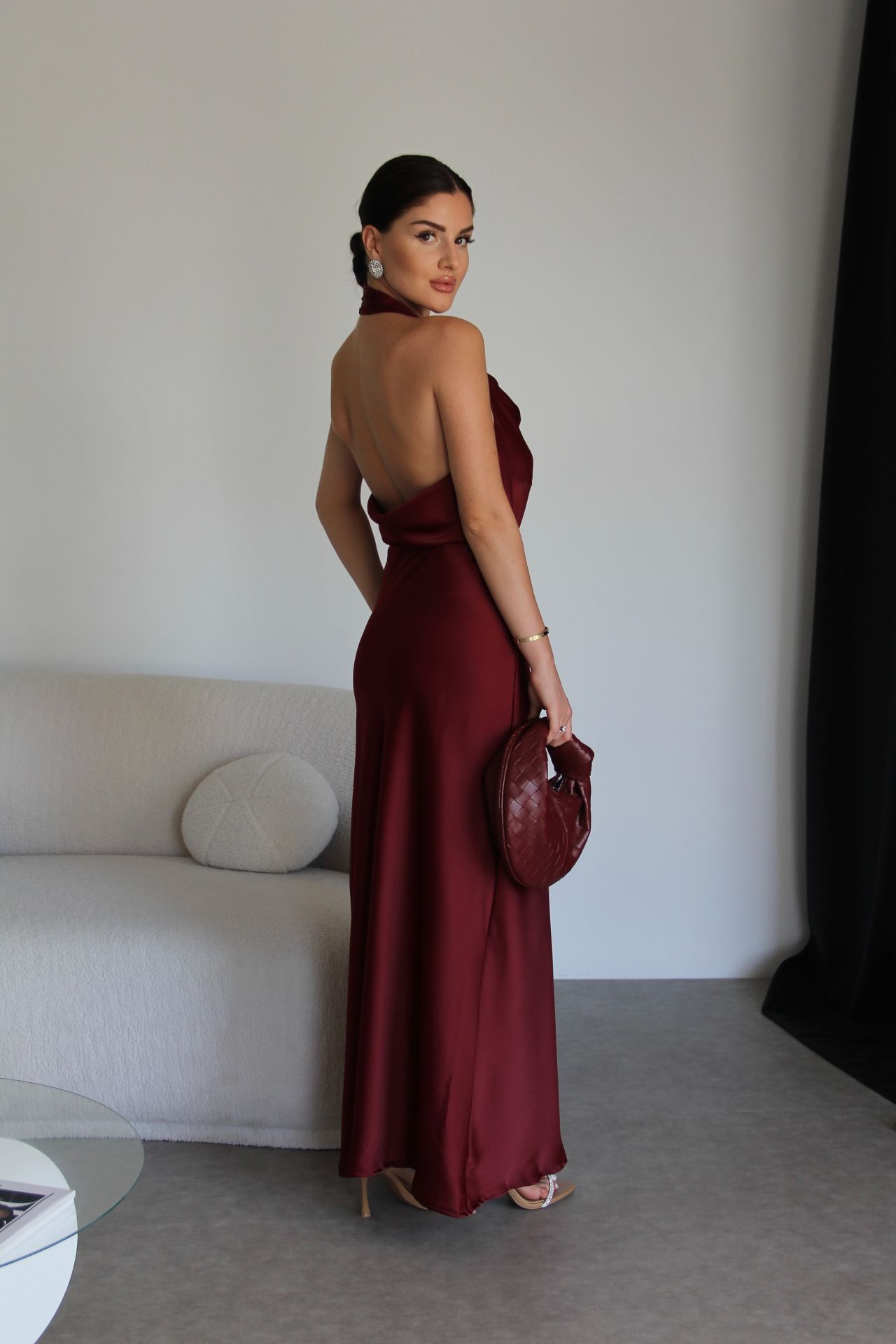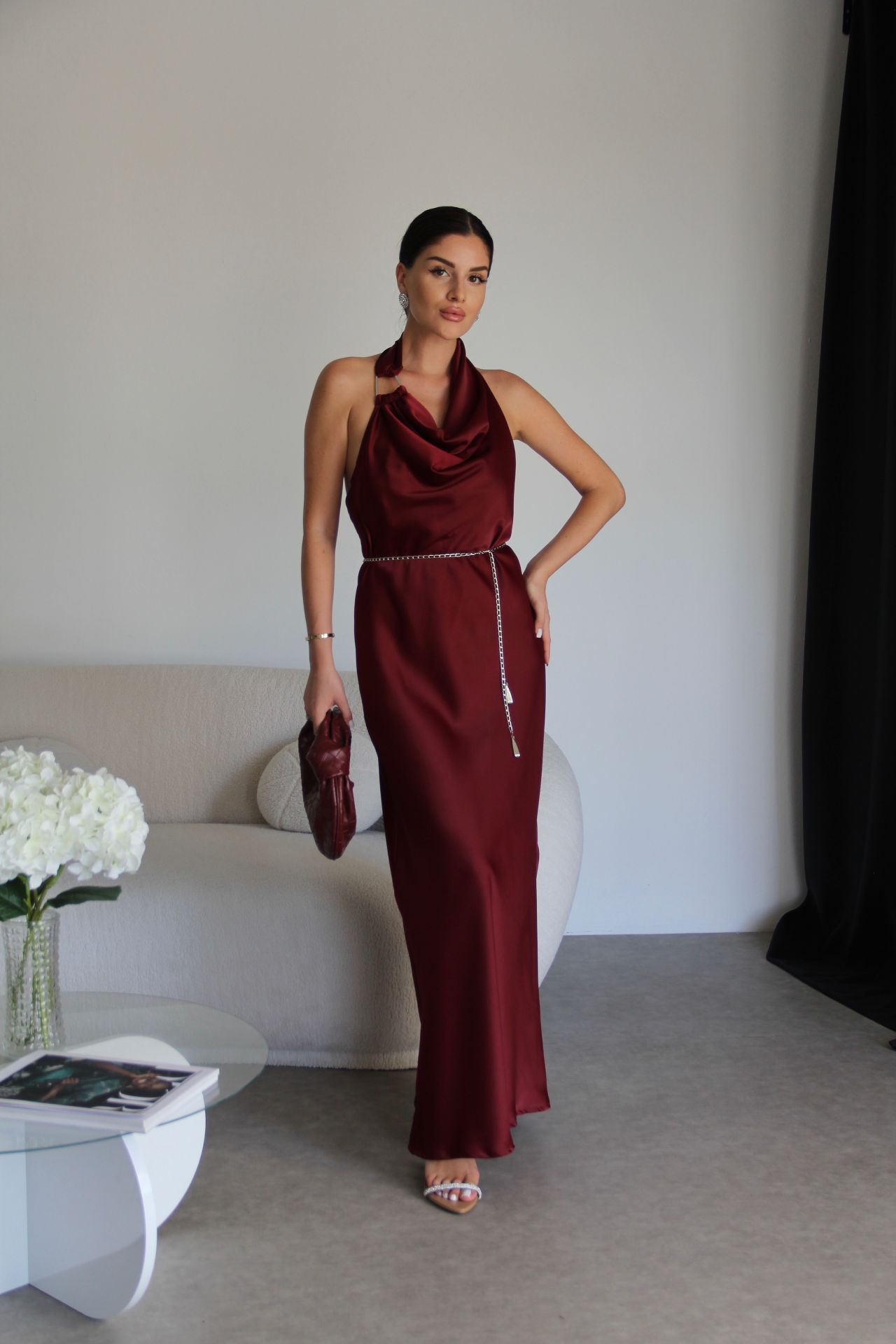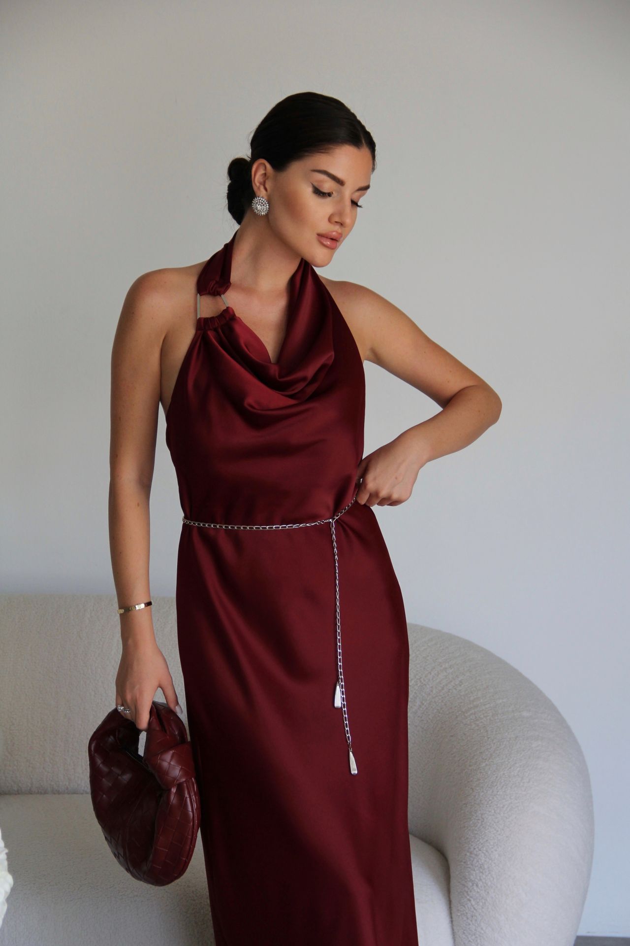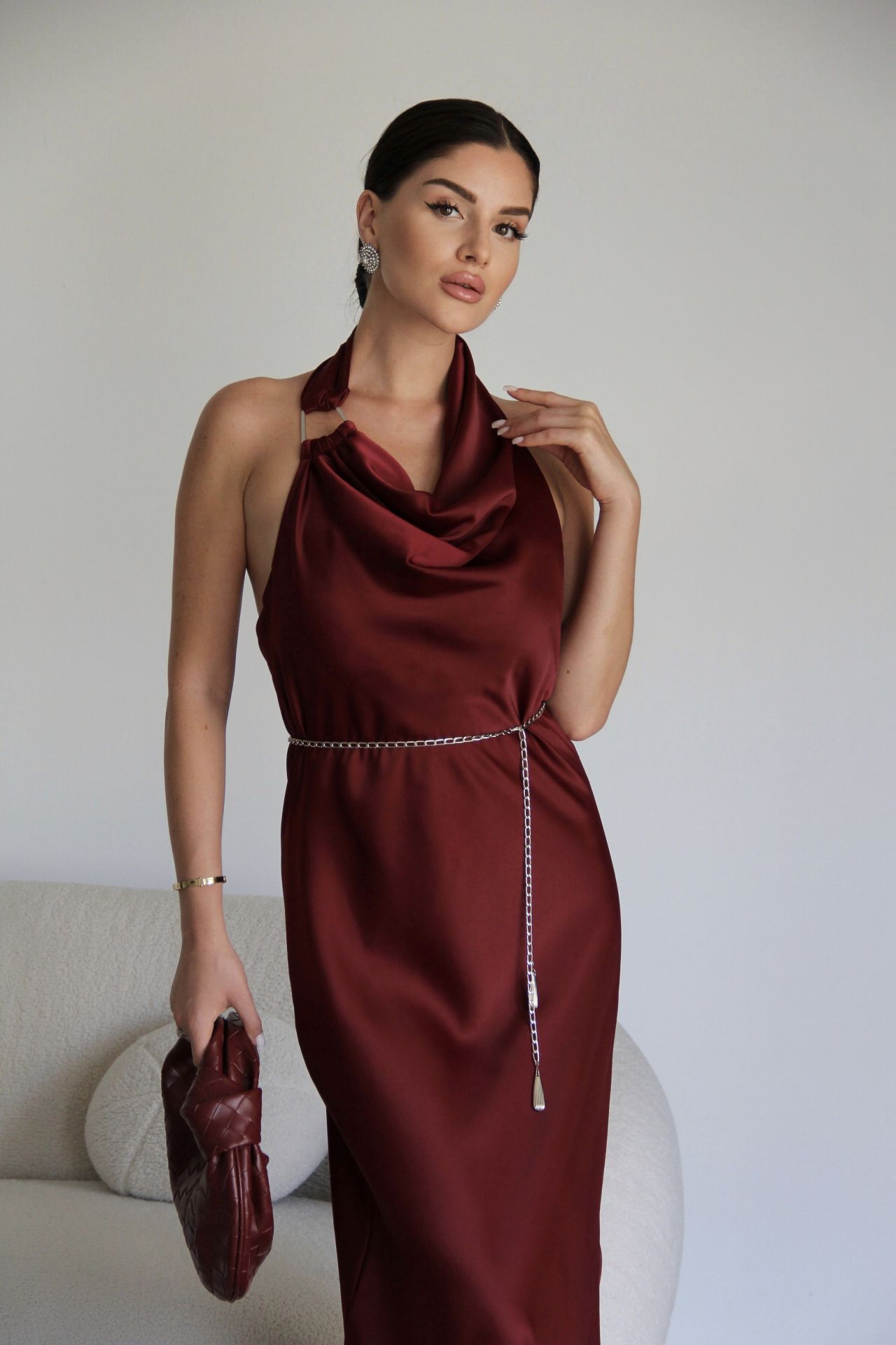 Bordo Boyundan Bağlamalı Gold Aksesuar Detaylı Maxi Uzun Boy Premium Saten Elbise