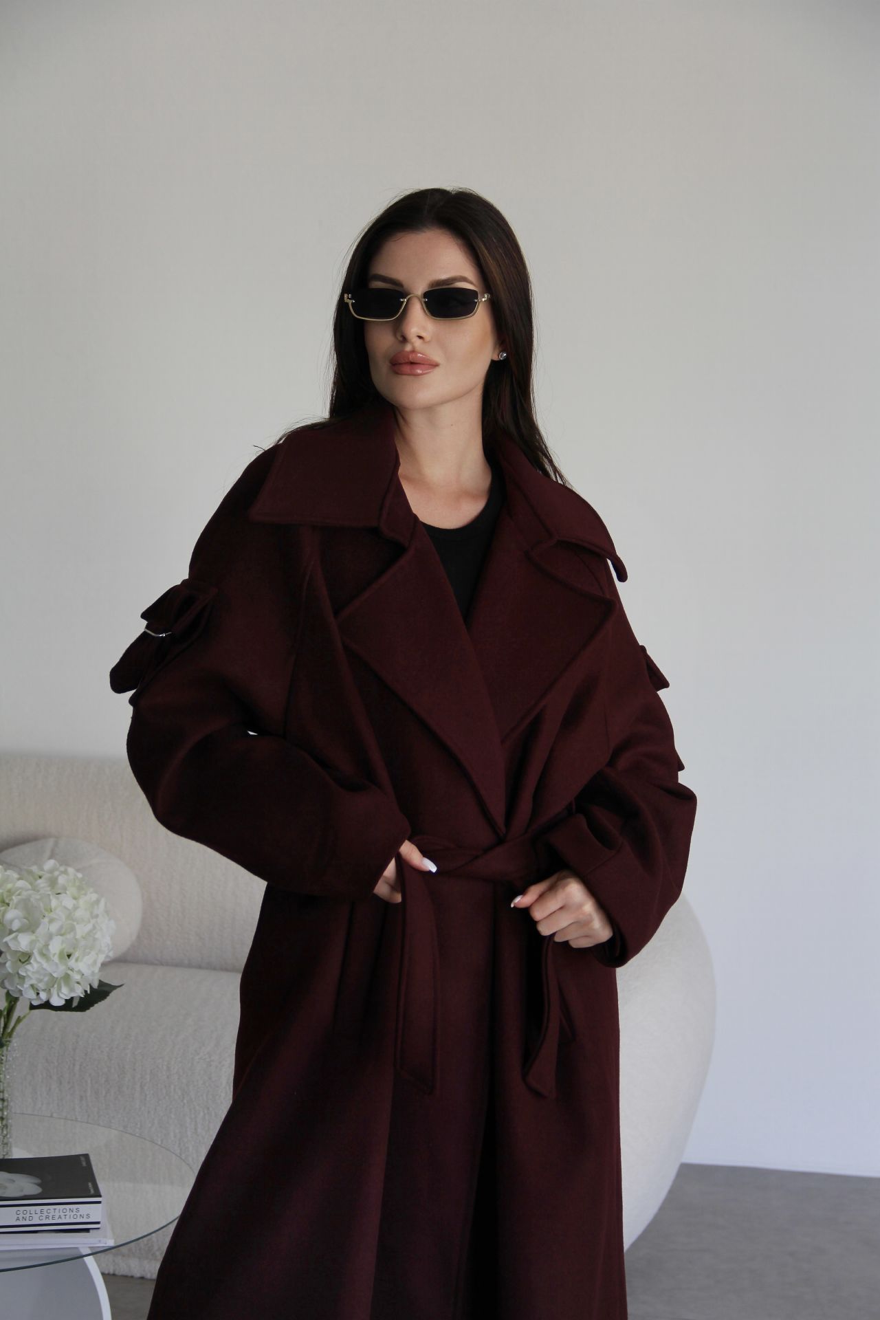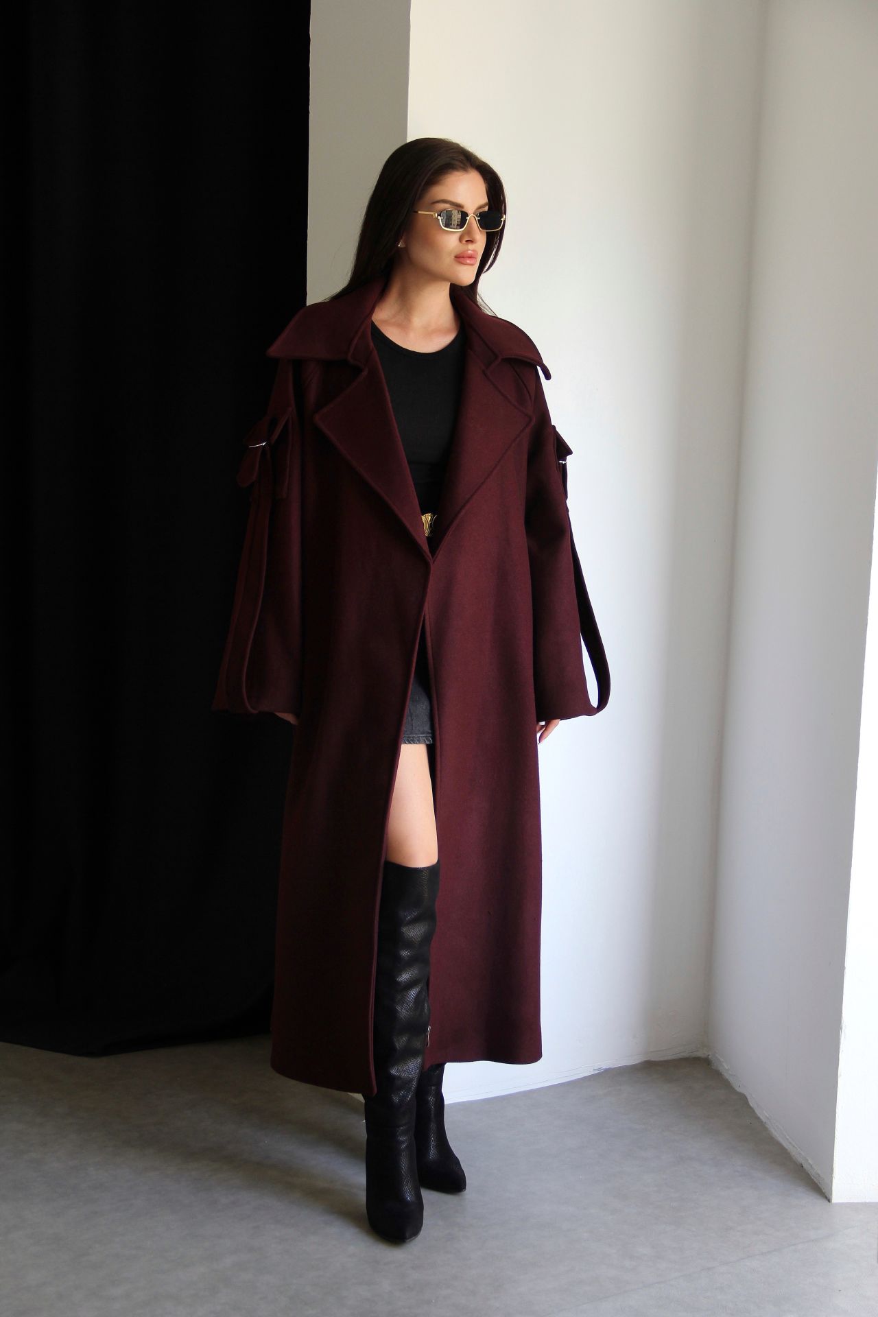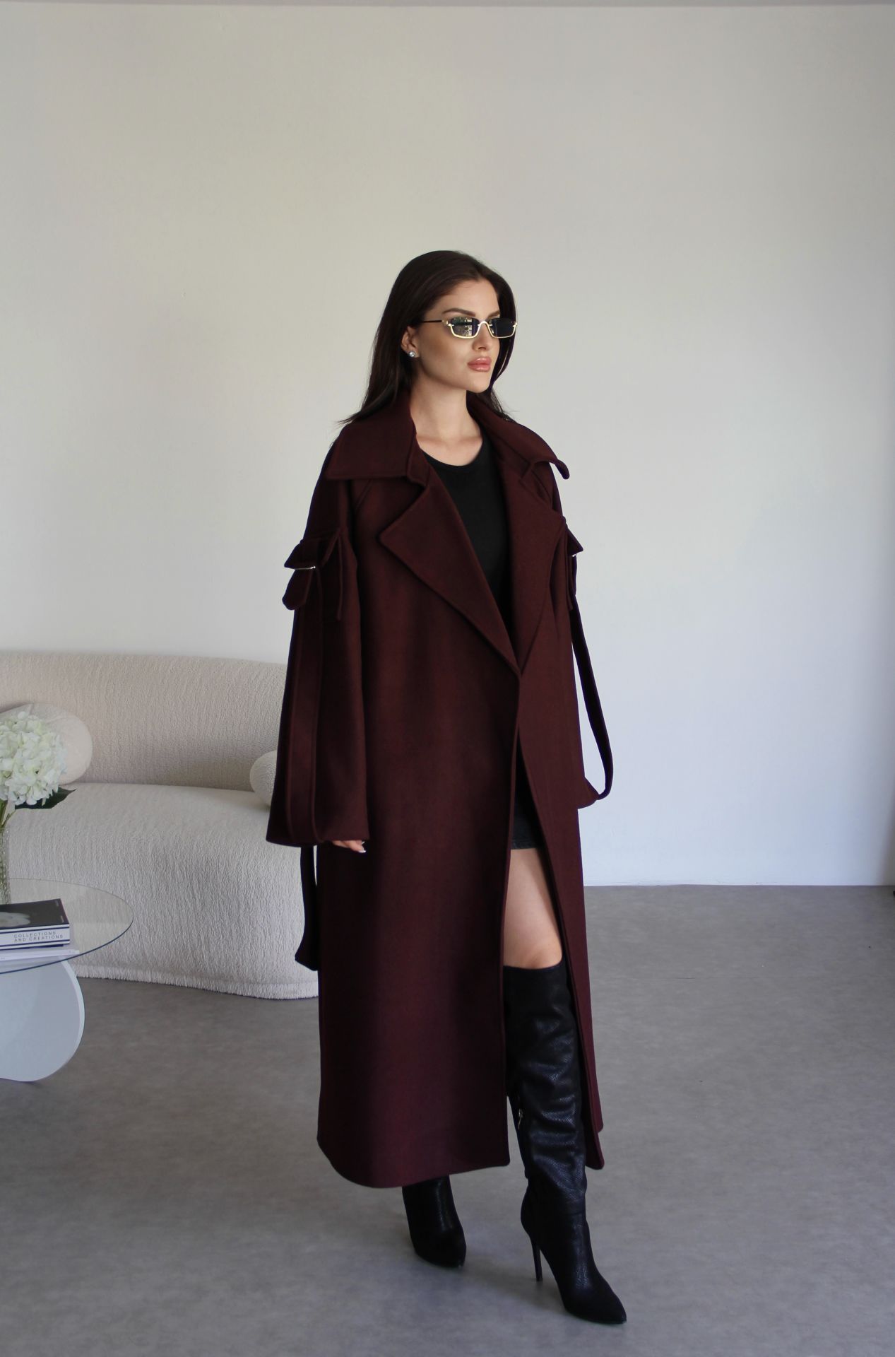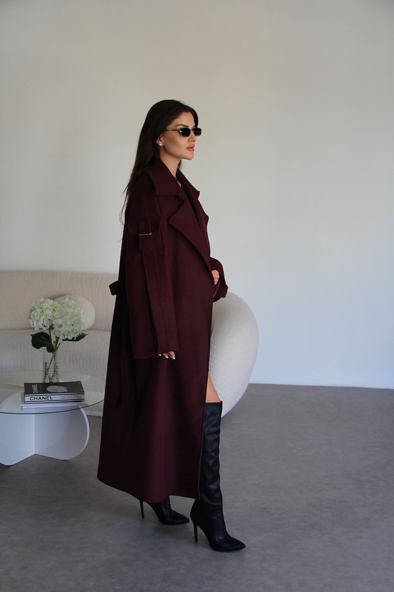 Bordo Kuşaklı Kol Detaylı Astarlı Premium Uzun Kaban