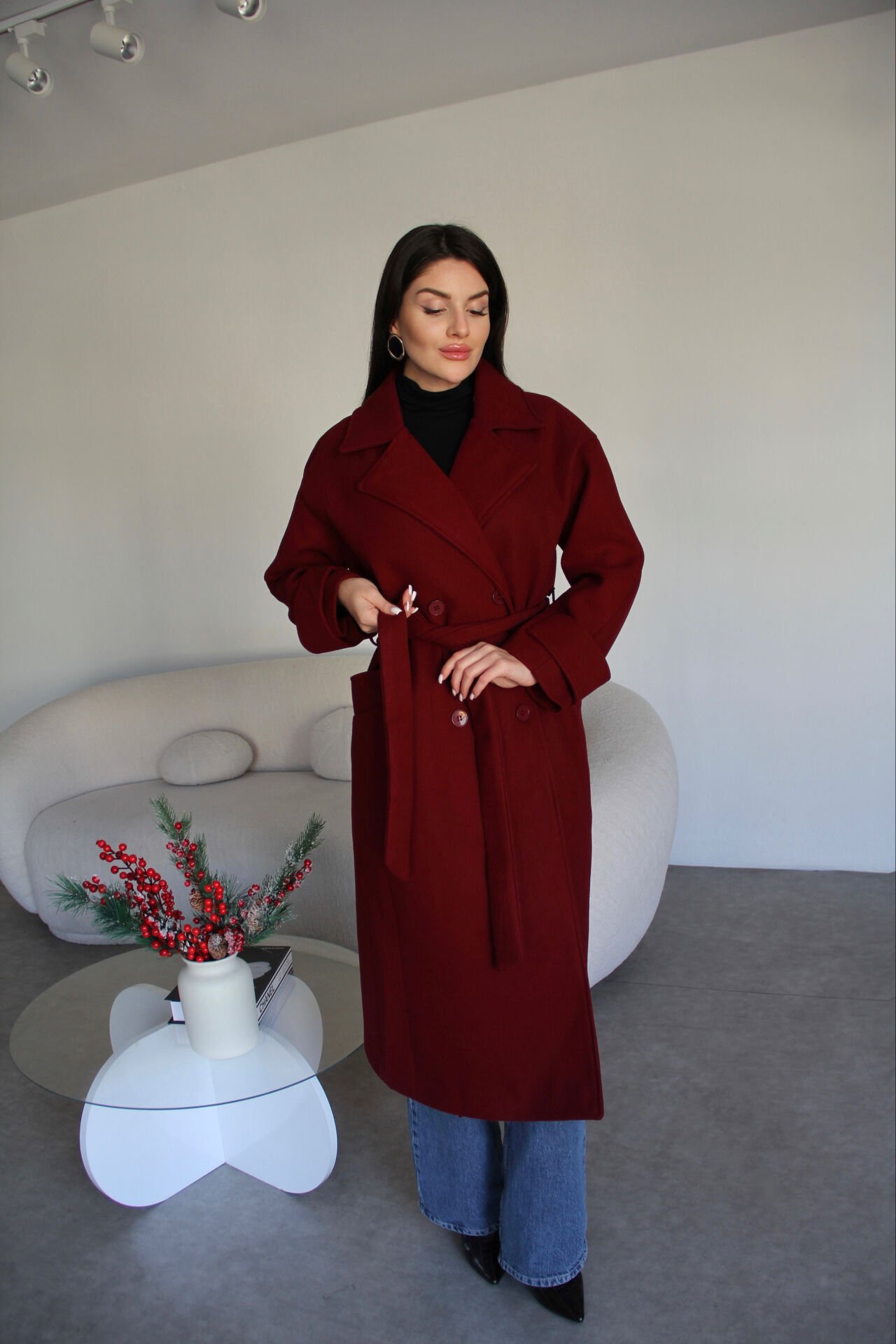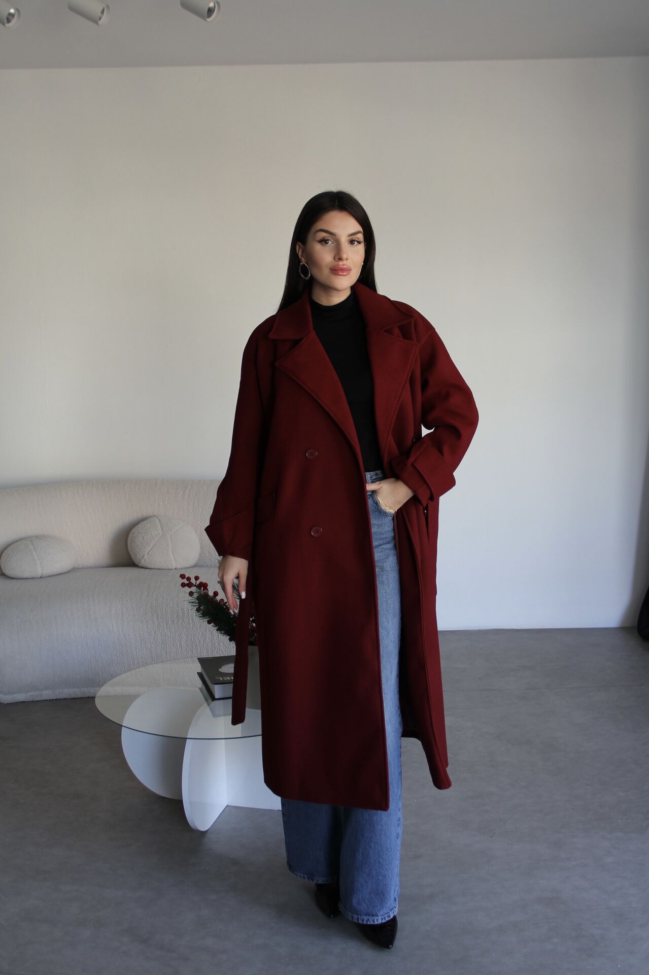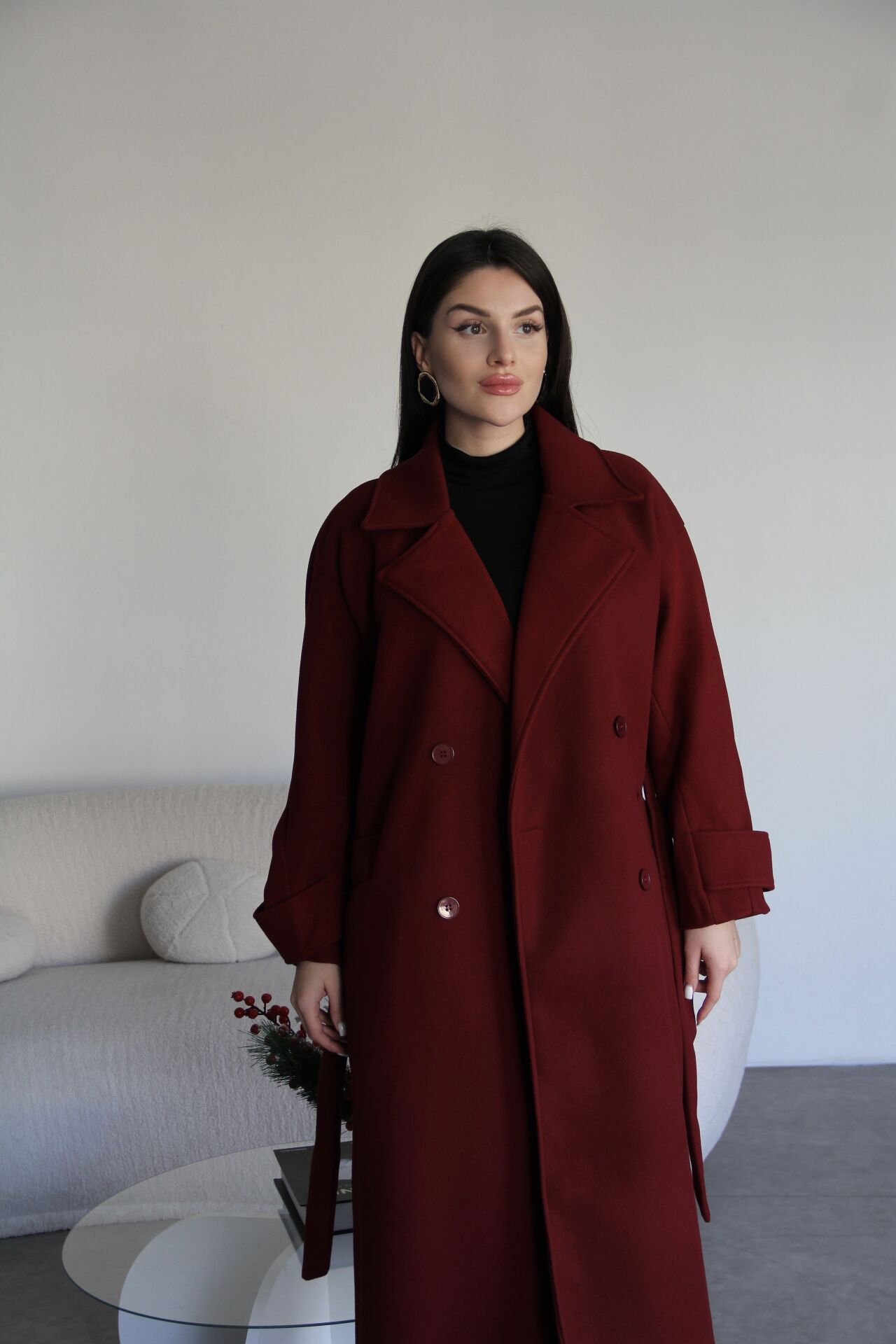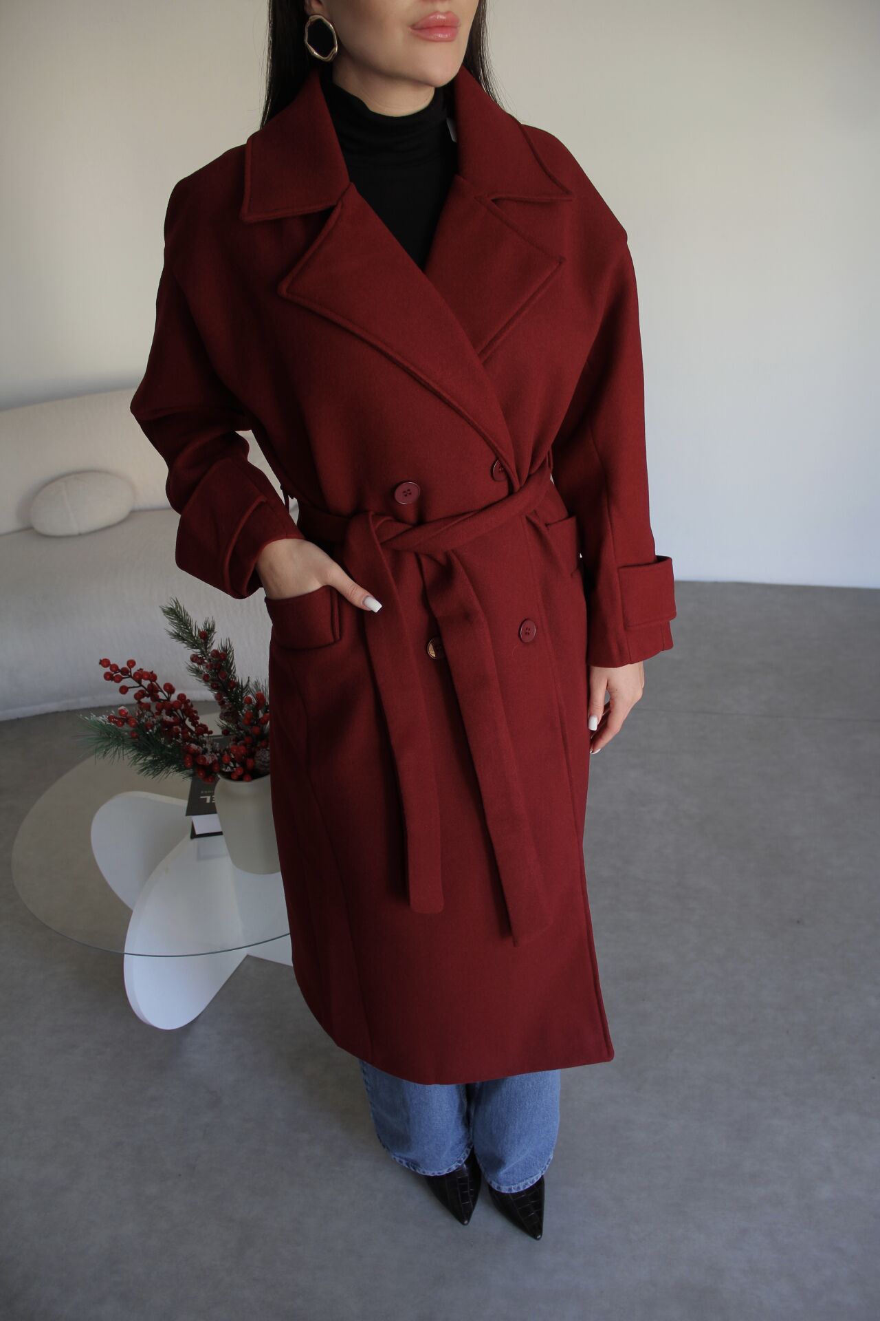 Bordo kuşaklı oversize astarlı kaşe kaban