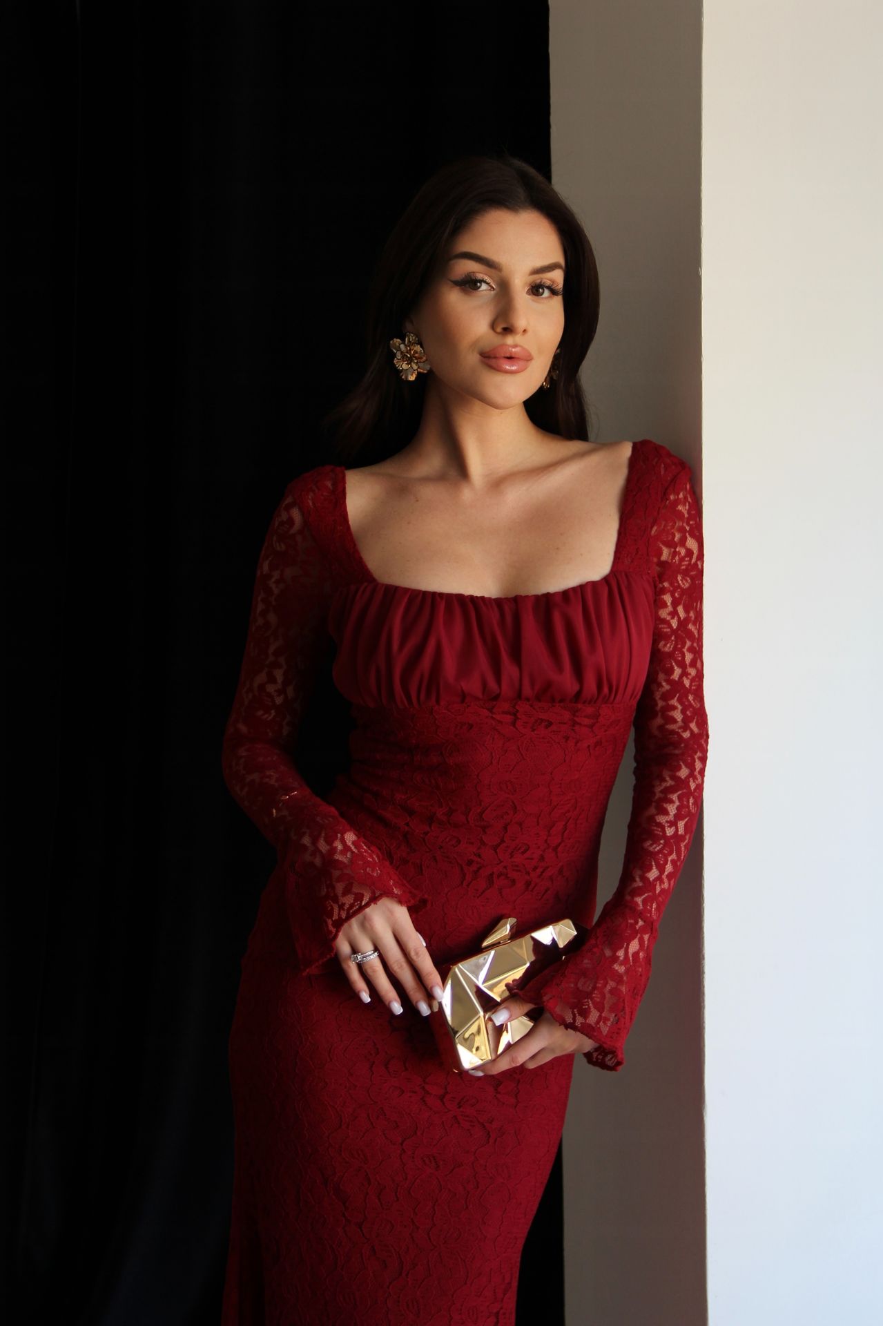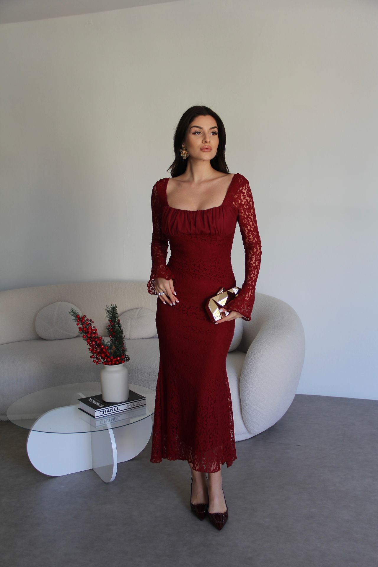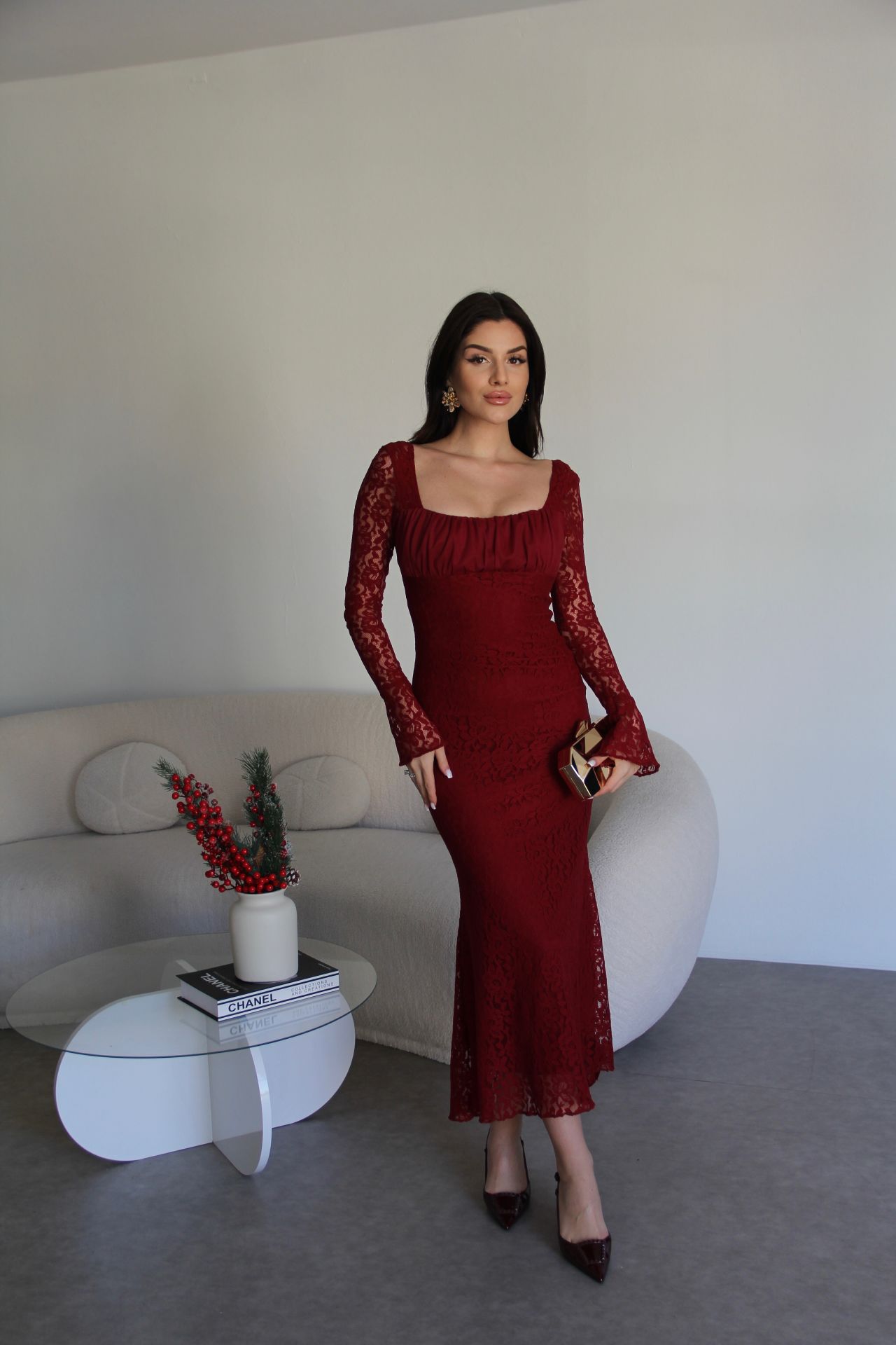 Bordo Tül Yaka Astarlı Maxi Uzun Boy Premium Tasarım Dantel Elbise