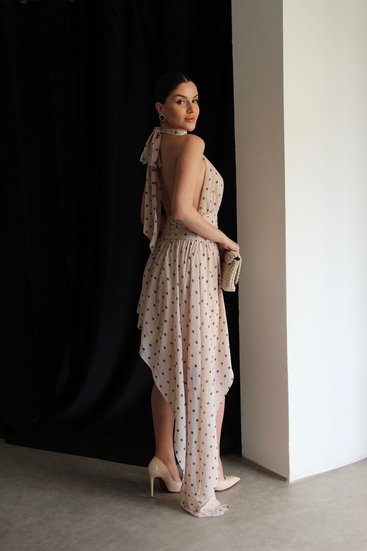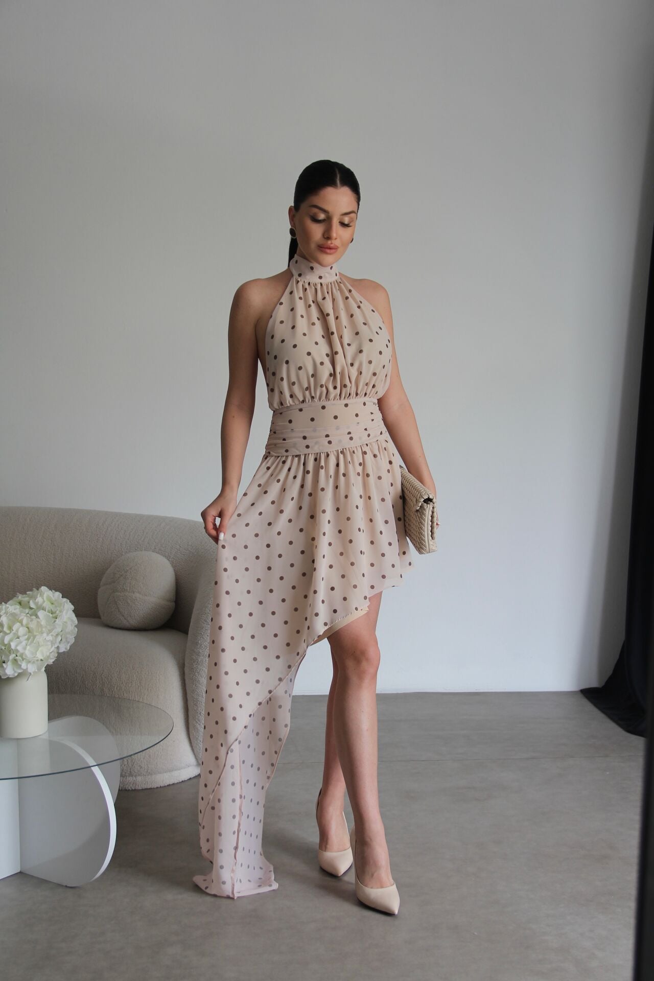 Boyundan Bağlamalı Asimetrik Kesim Maxi Uzun Premium Puantiyeli Şifon Elbise.