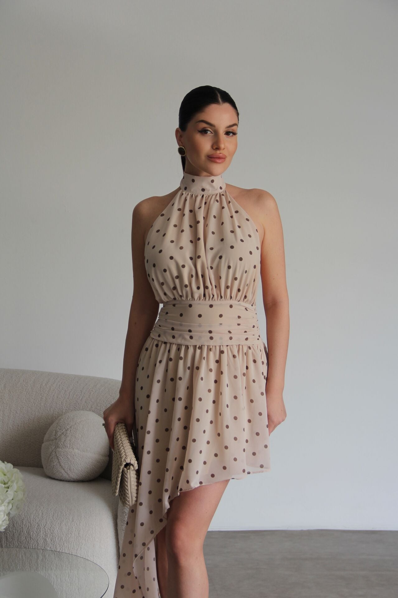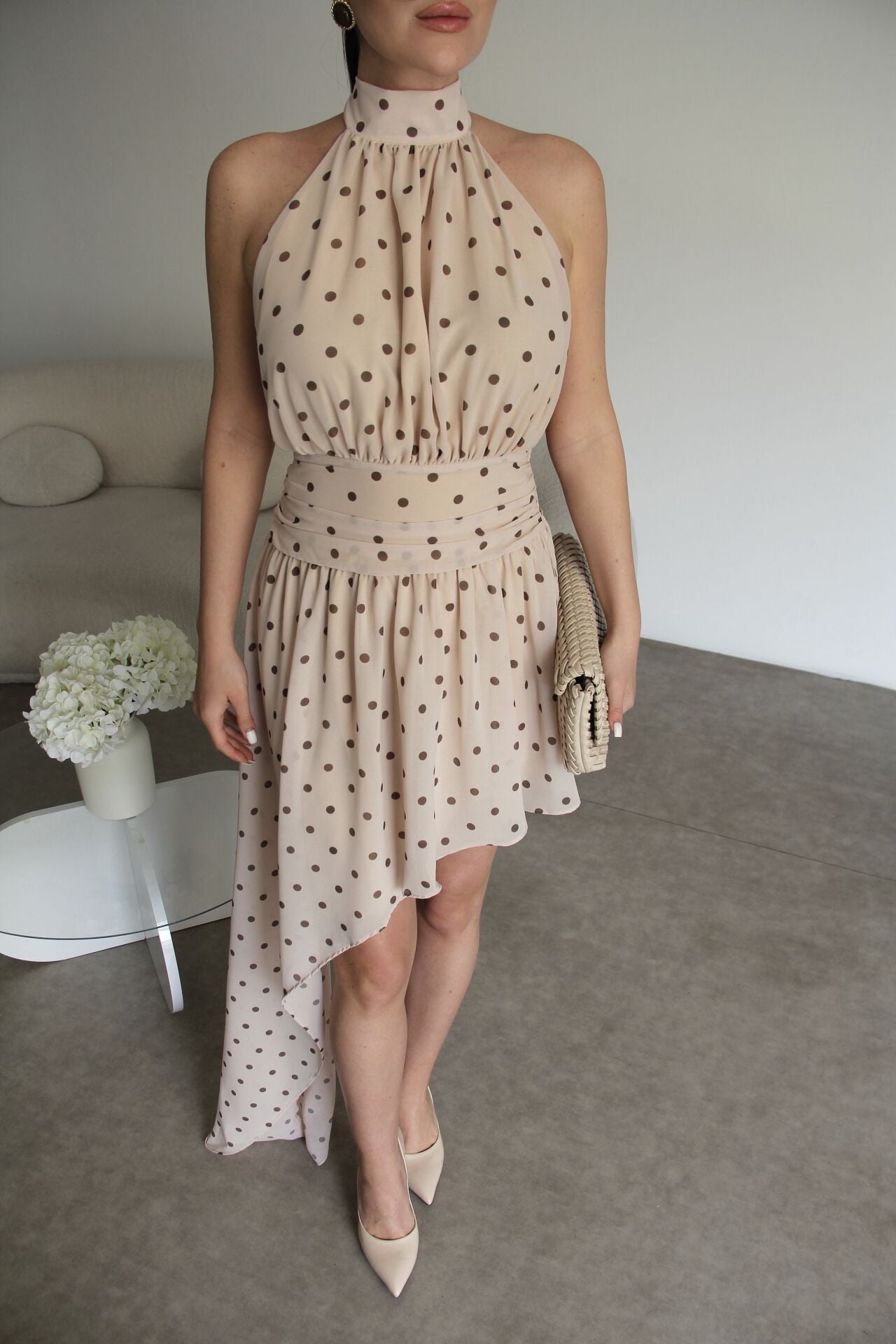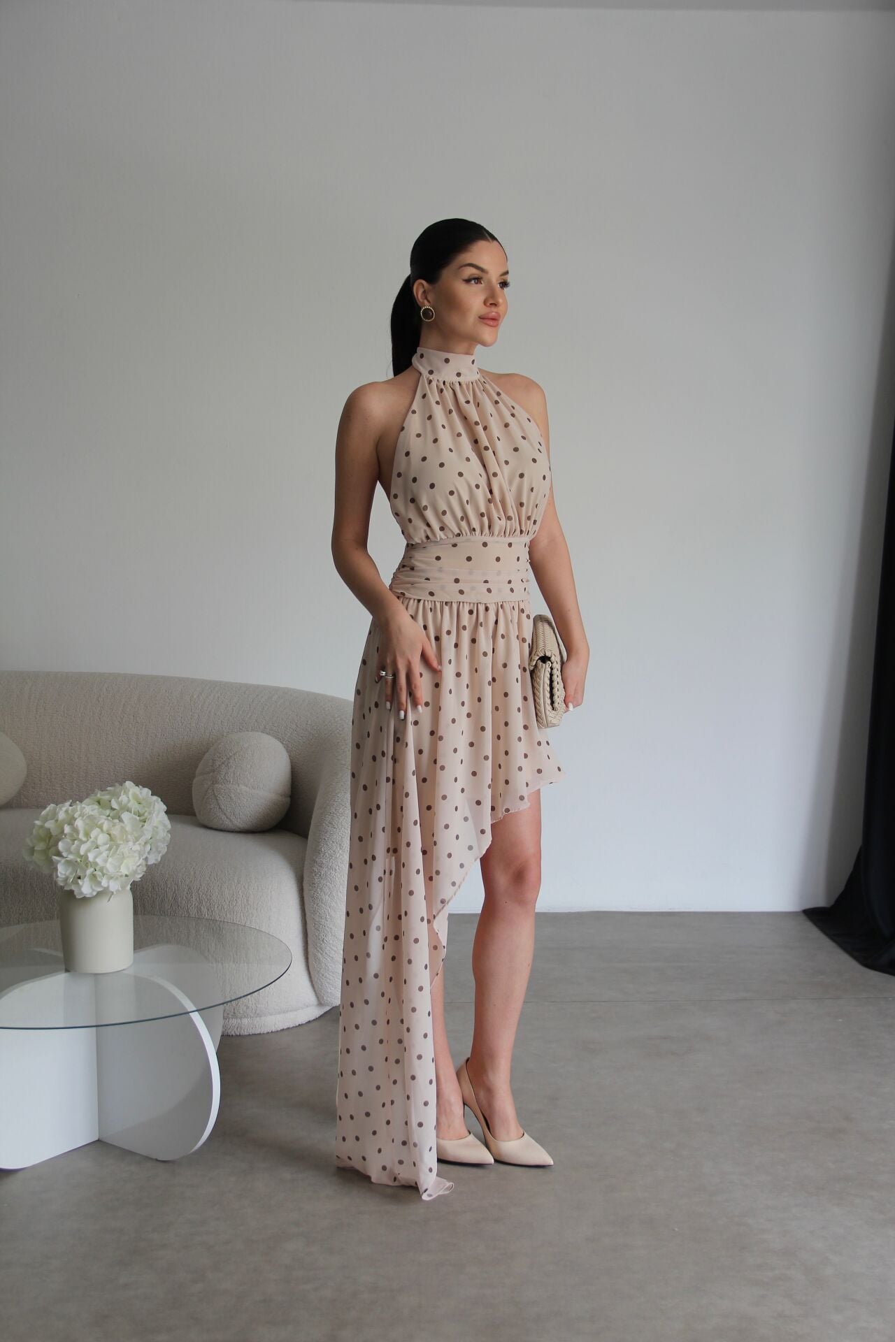 Boyundan Bağlamalı Asimetrik Kesim Maxi Uzun Puantiyeli Şifon Elbise