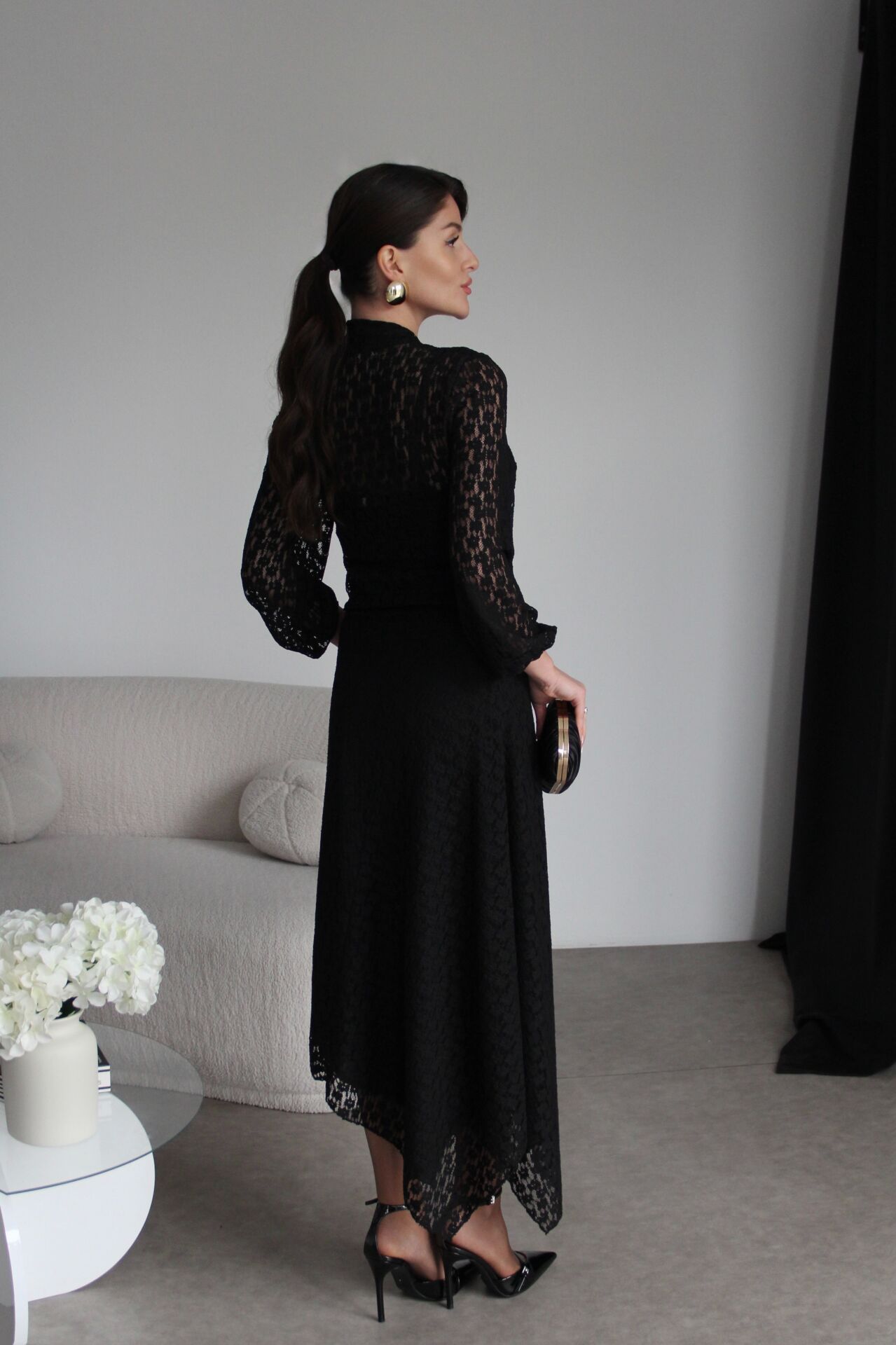 Asimetrik kesim etek boyu boyu: uzun yeri 98cm, kısa yer 75cm .