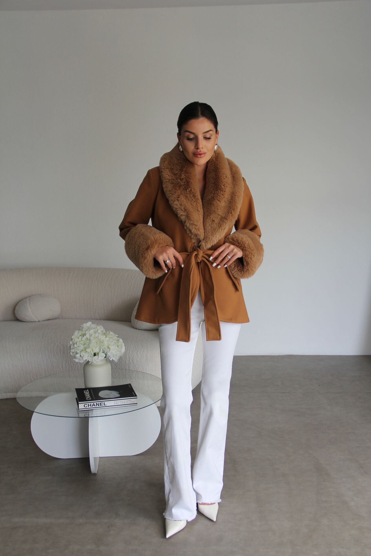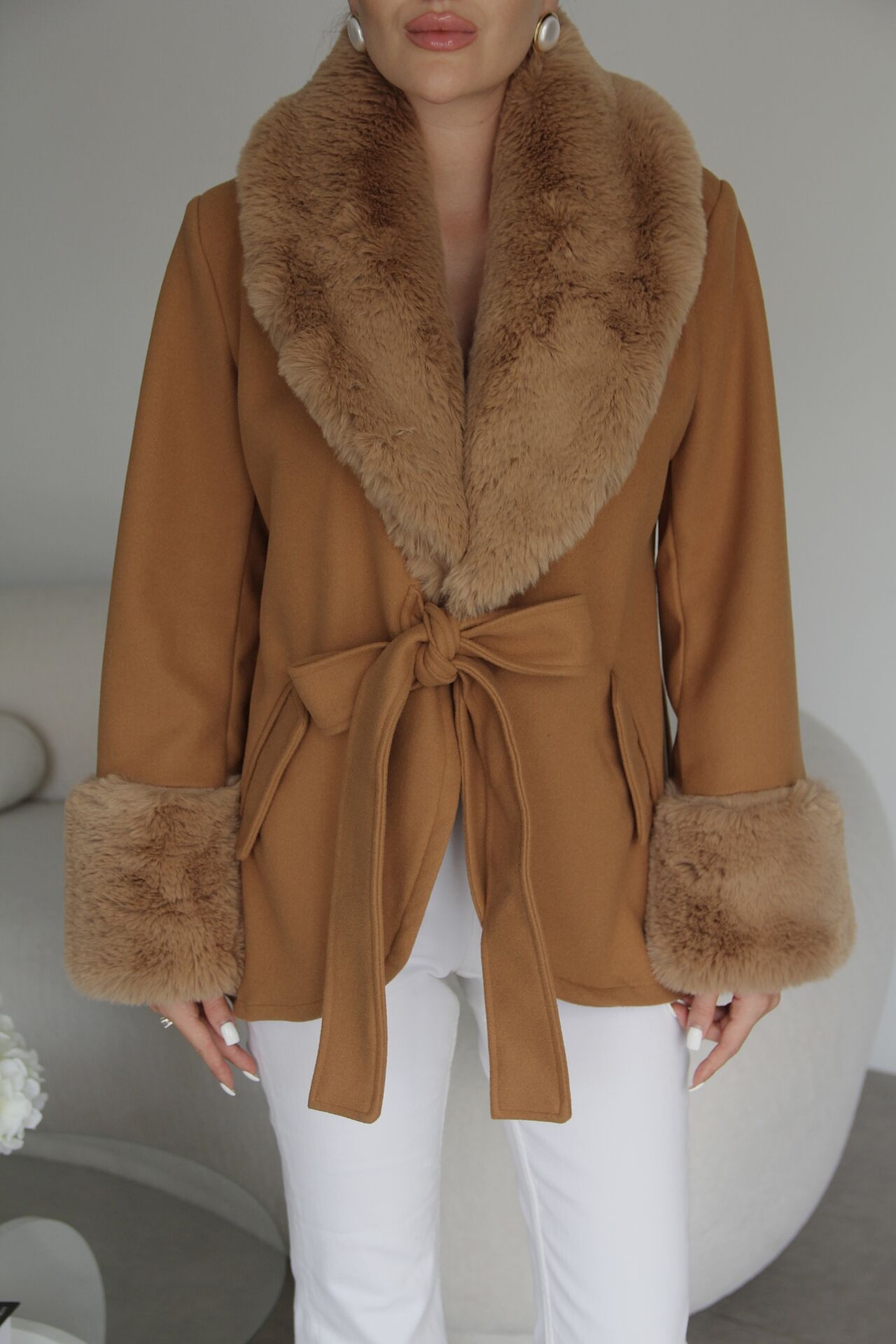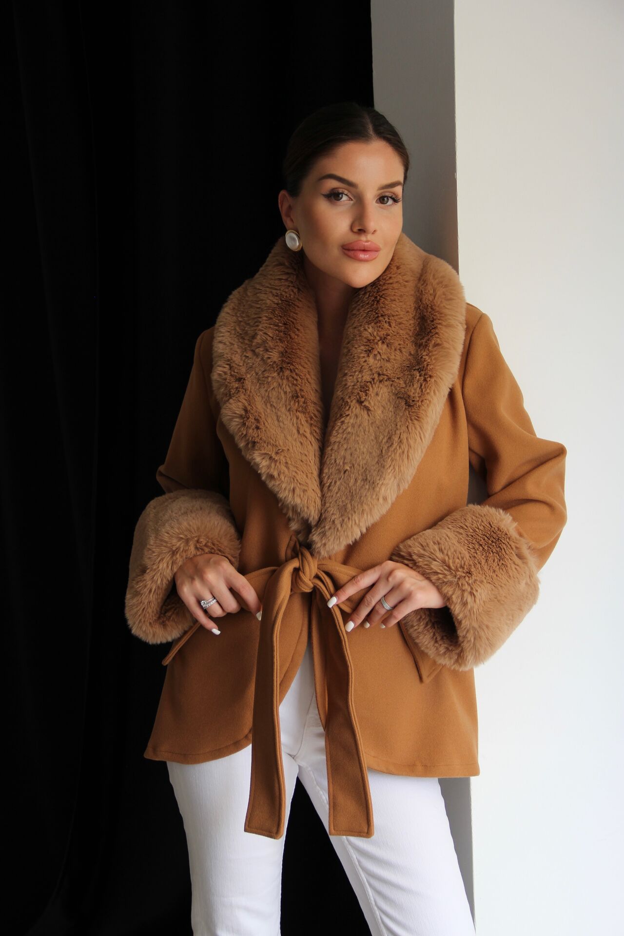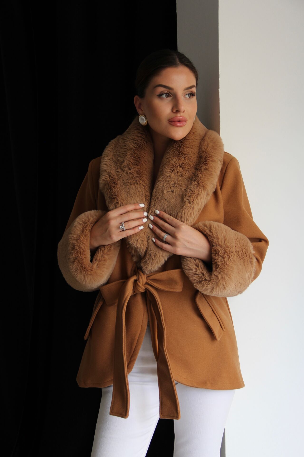 Camel Kolları ve Yakası Tüy Detaylı Bağlamalı Premium Tasarım Kaşe Kaban