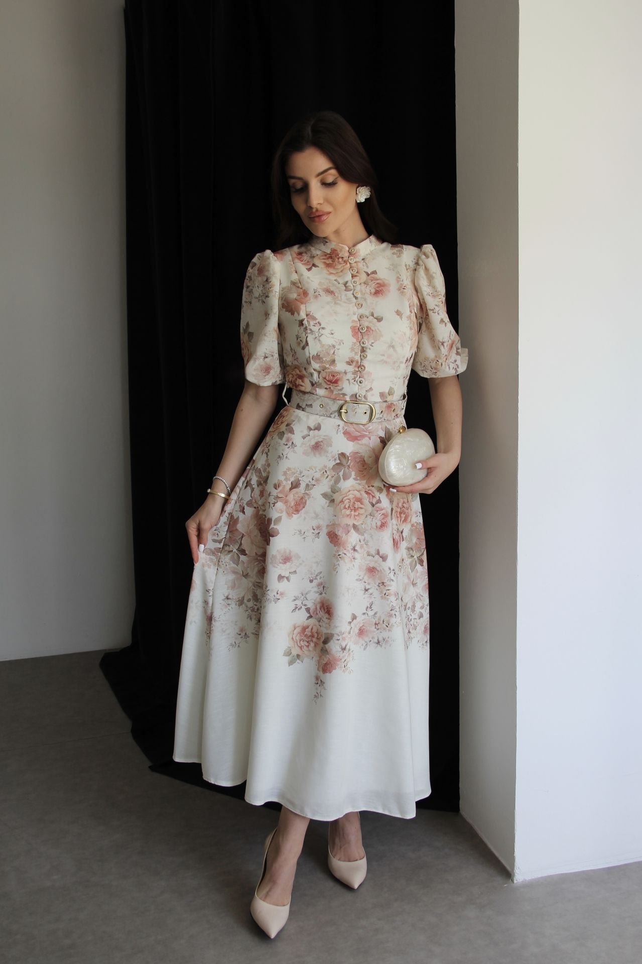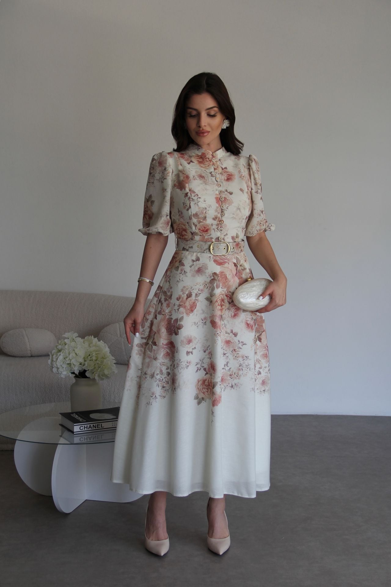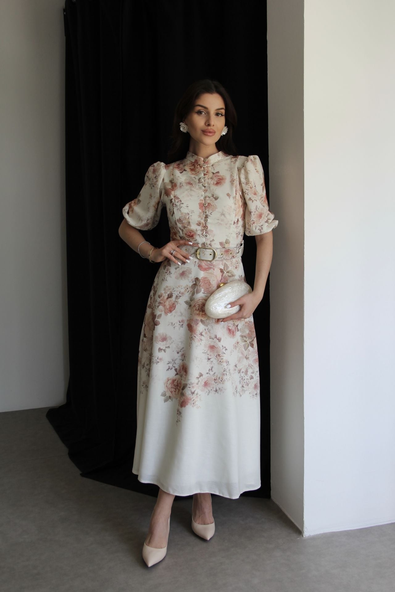 Çiçek Desenli Boydan Düğmeli Dik Yaka KEMERLİ Kısa Kol Midi Boy Premium Tasarım Keten Elbise