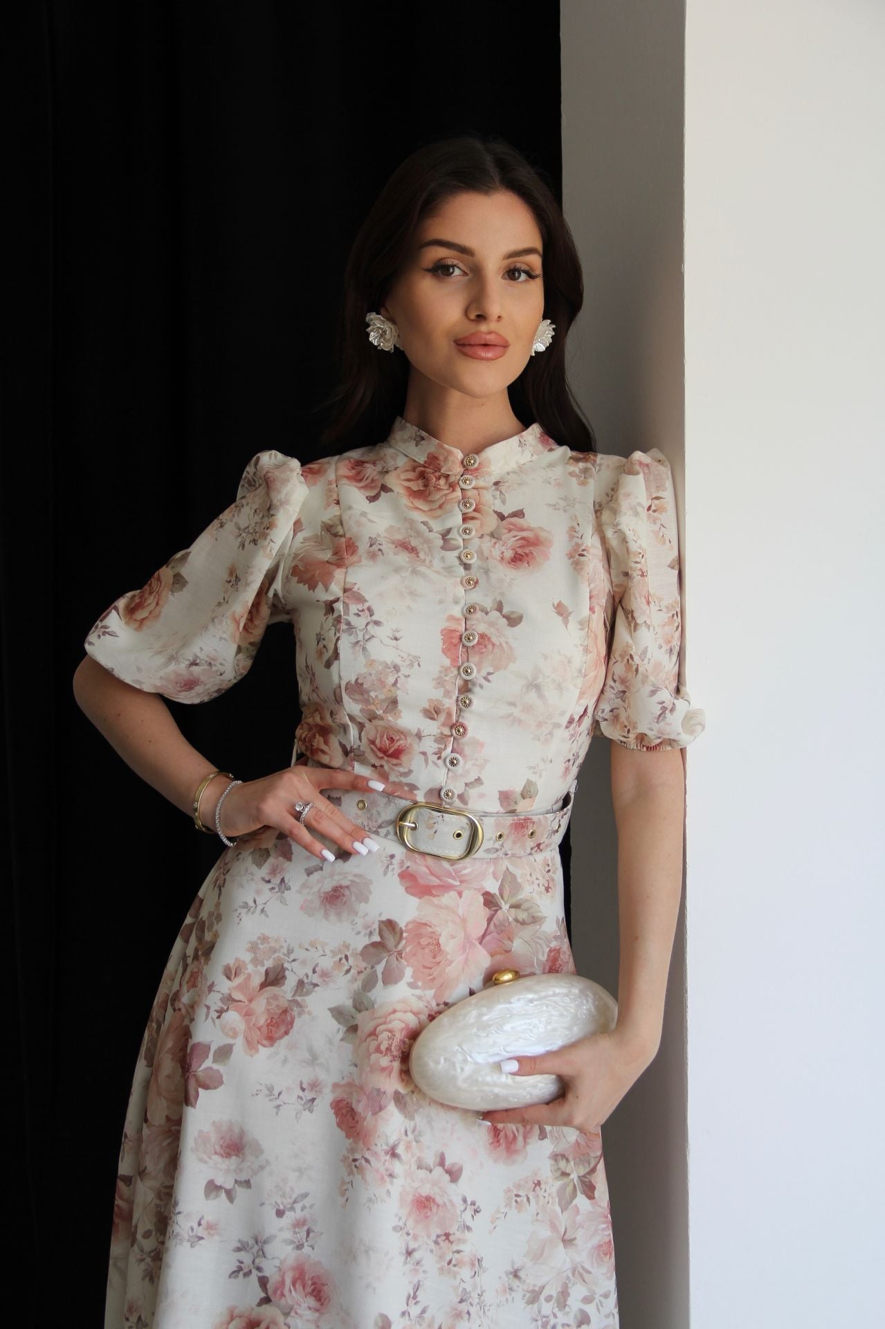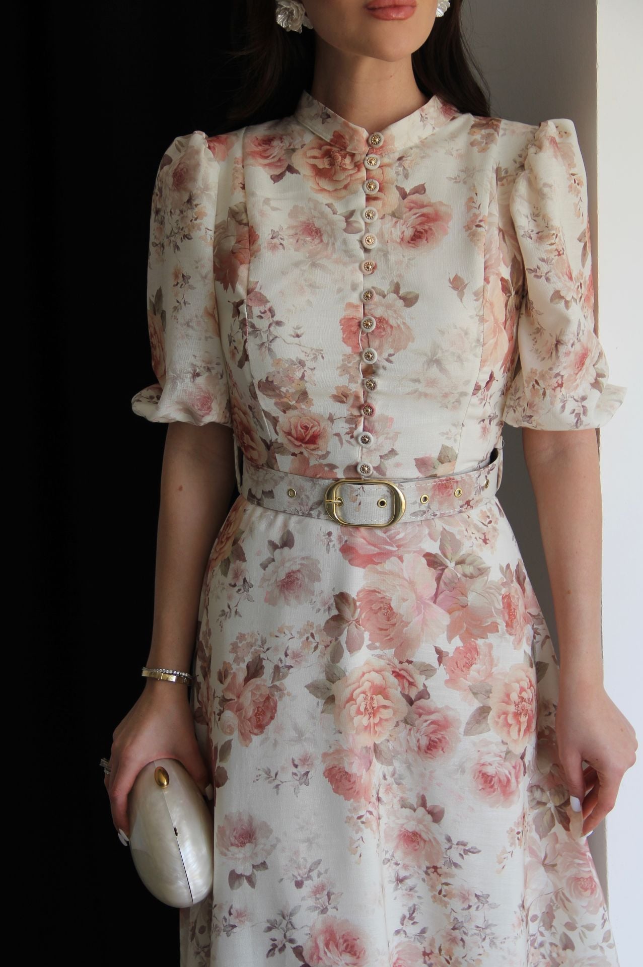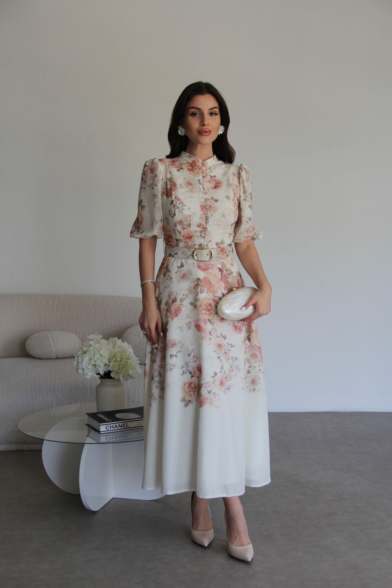 Çiçek Desenli Boydan Düğmeli Dik Yaka KEMERLİ Kısa Kol Midi Boy Premium Tasarım Keten Elbise