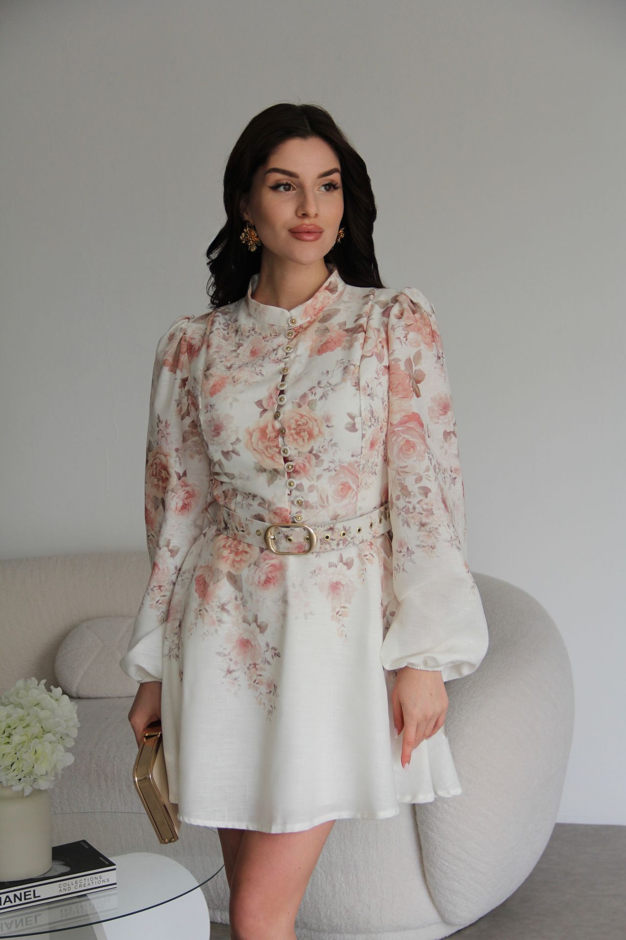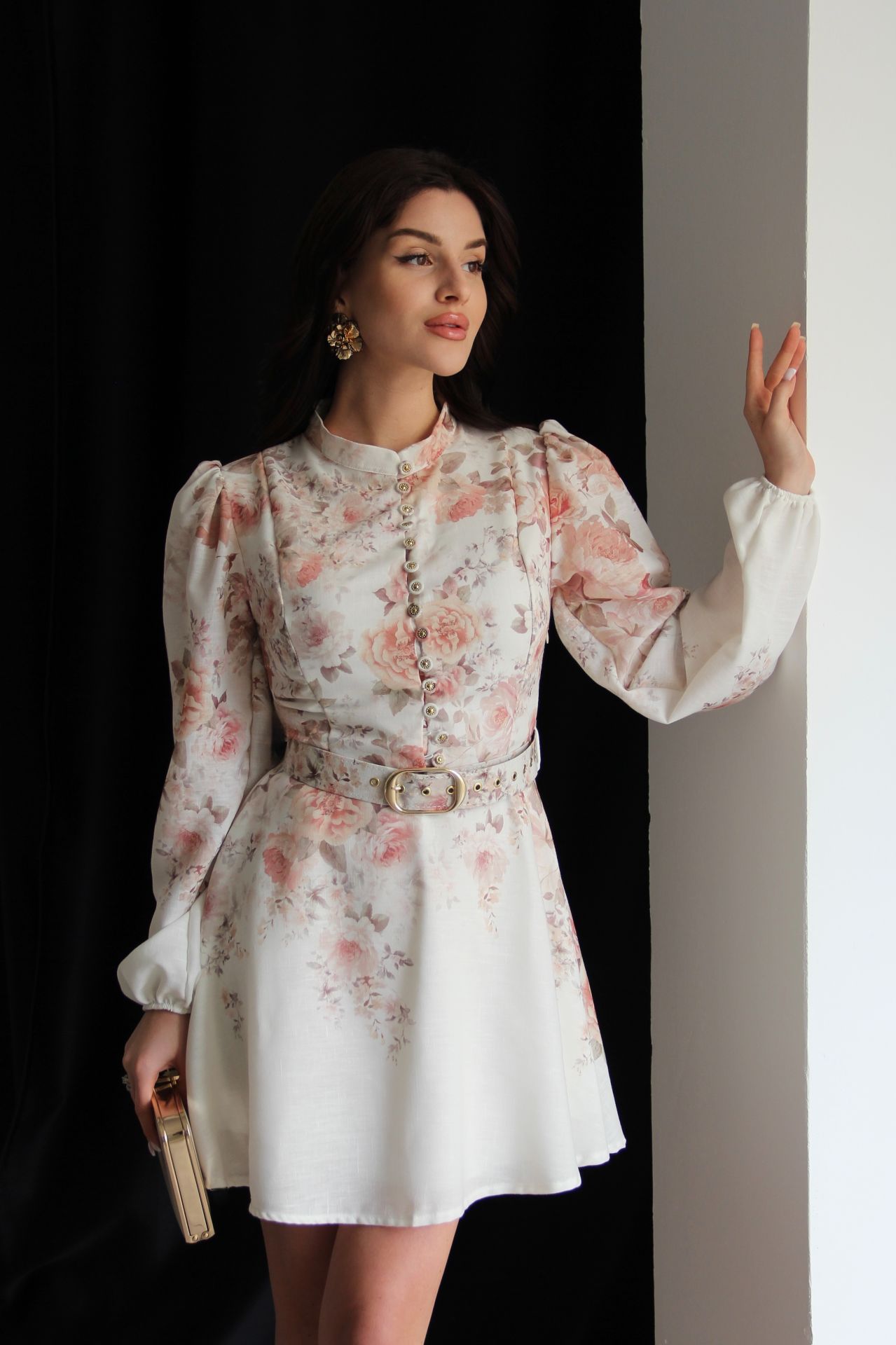 - Yüksek Kalite, Yeni Sezon Çiçek Desenli Kemerli Düğme Detaylı Mini Premium Elbise
