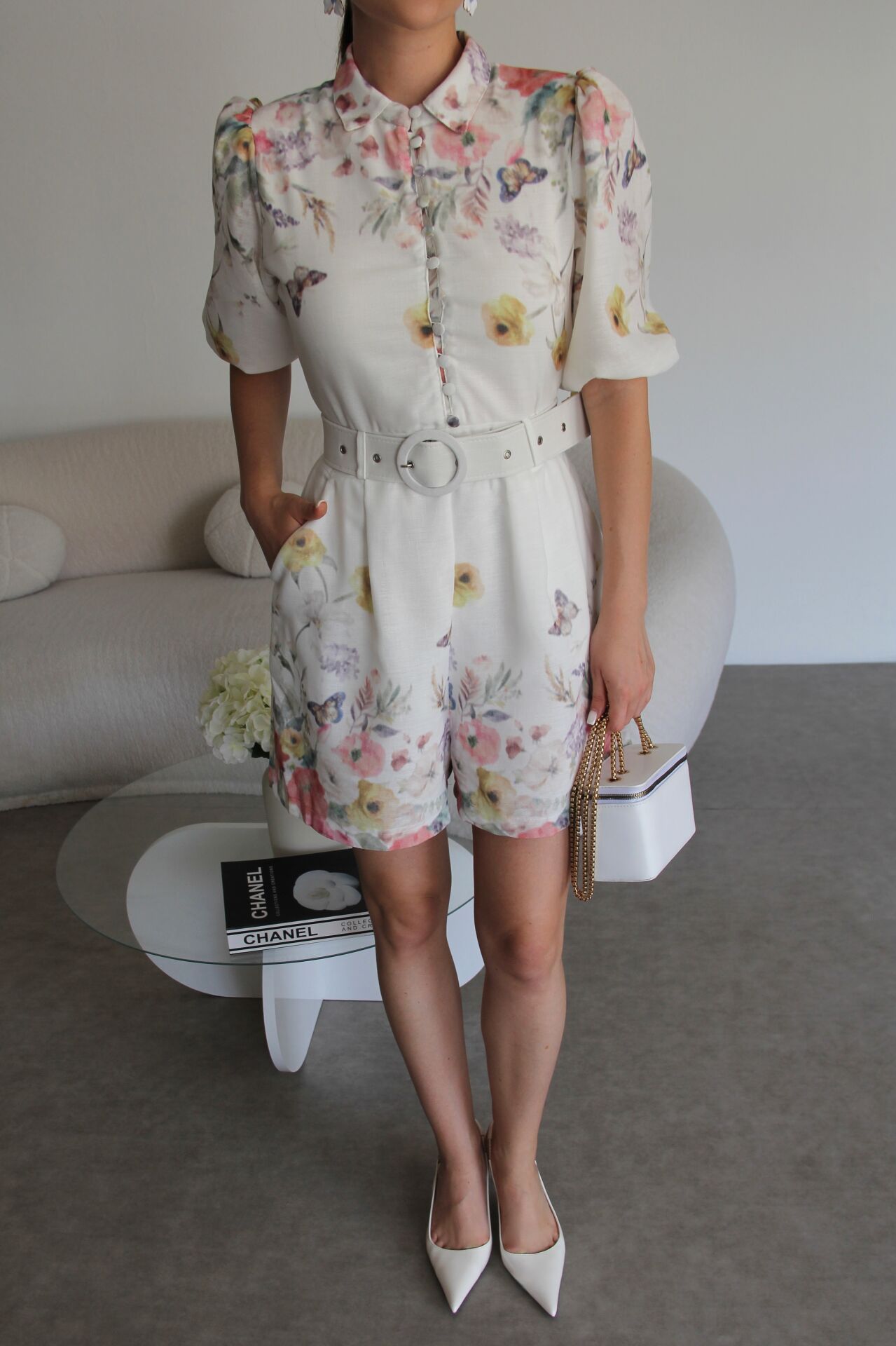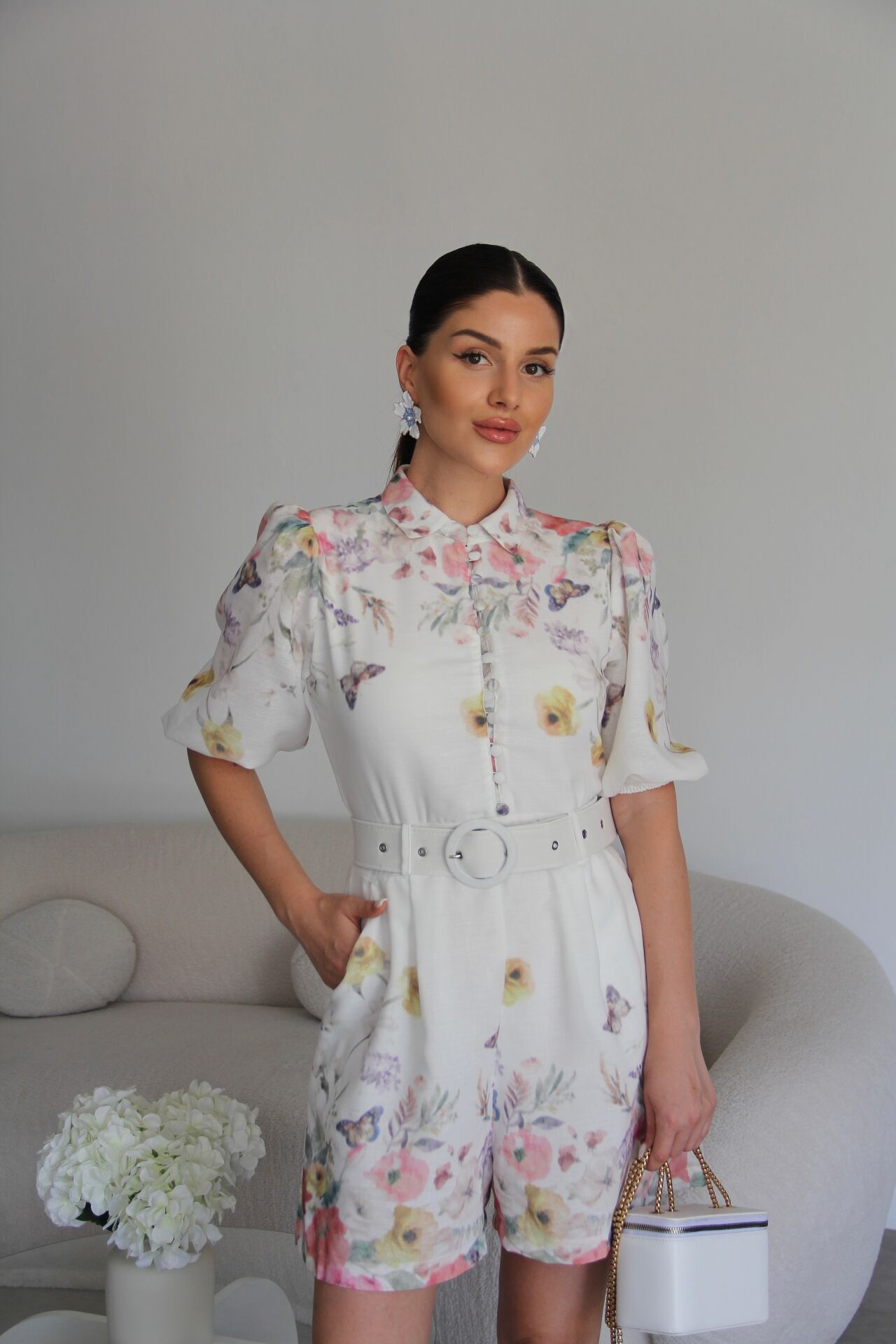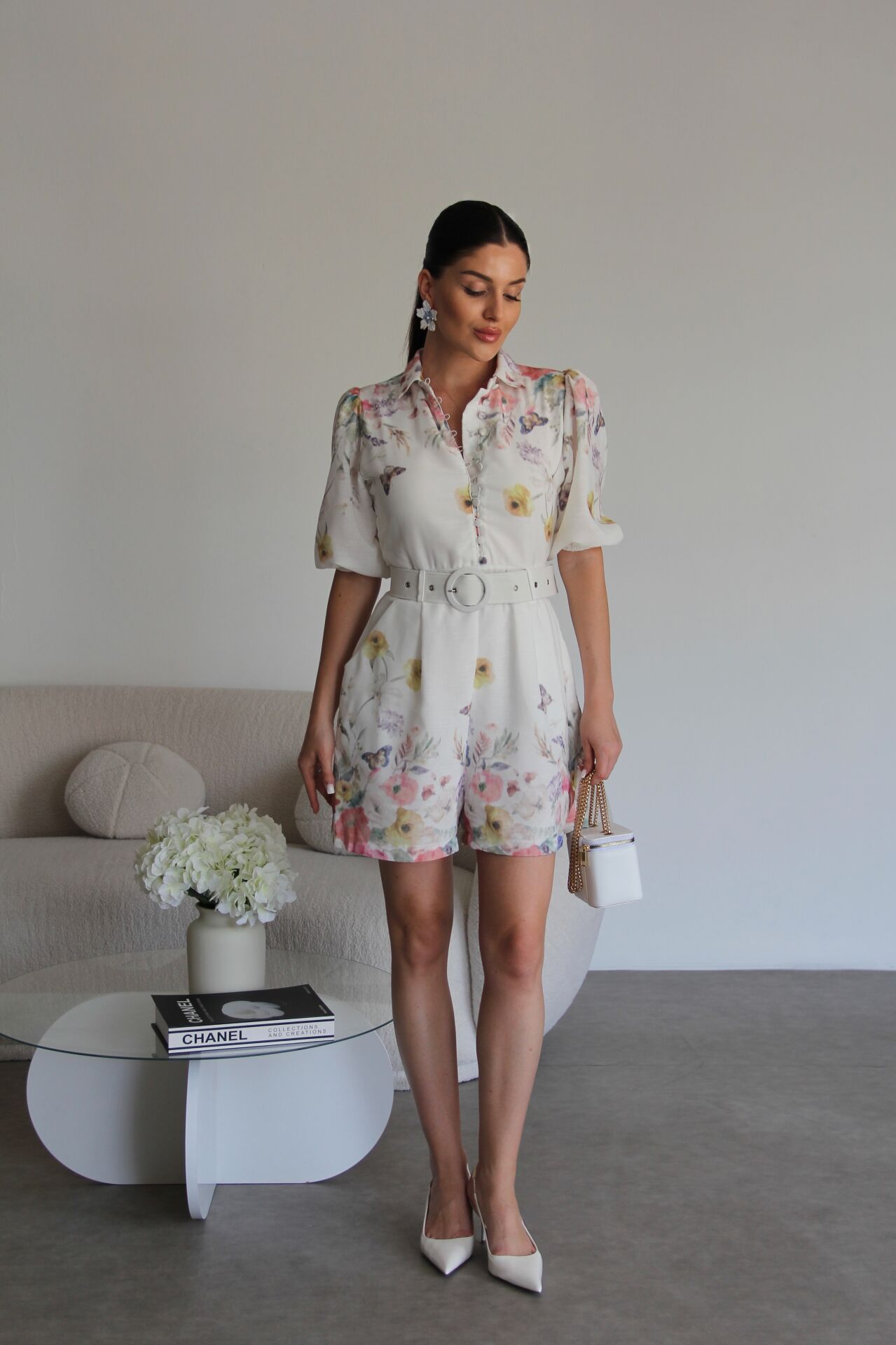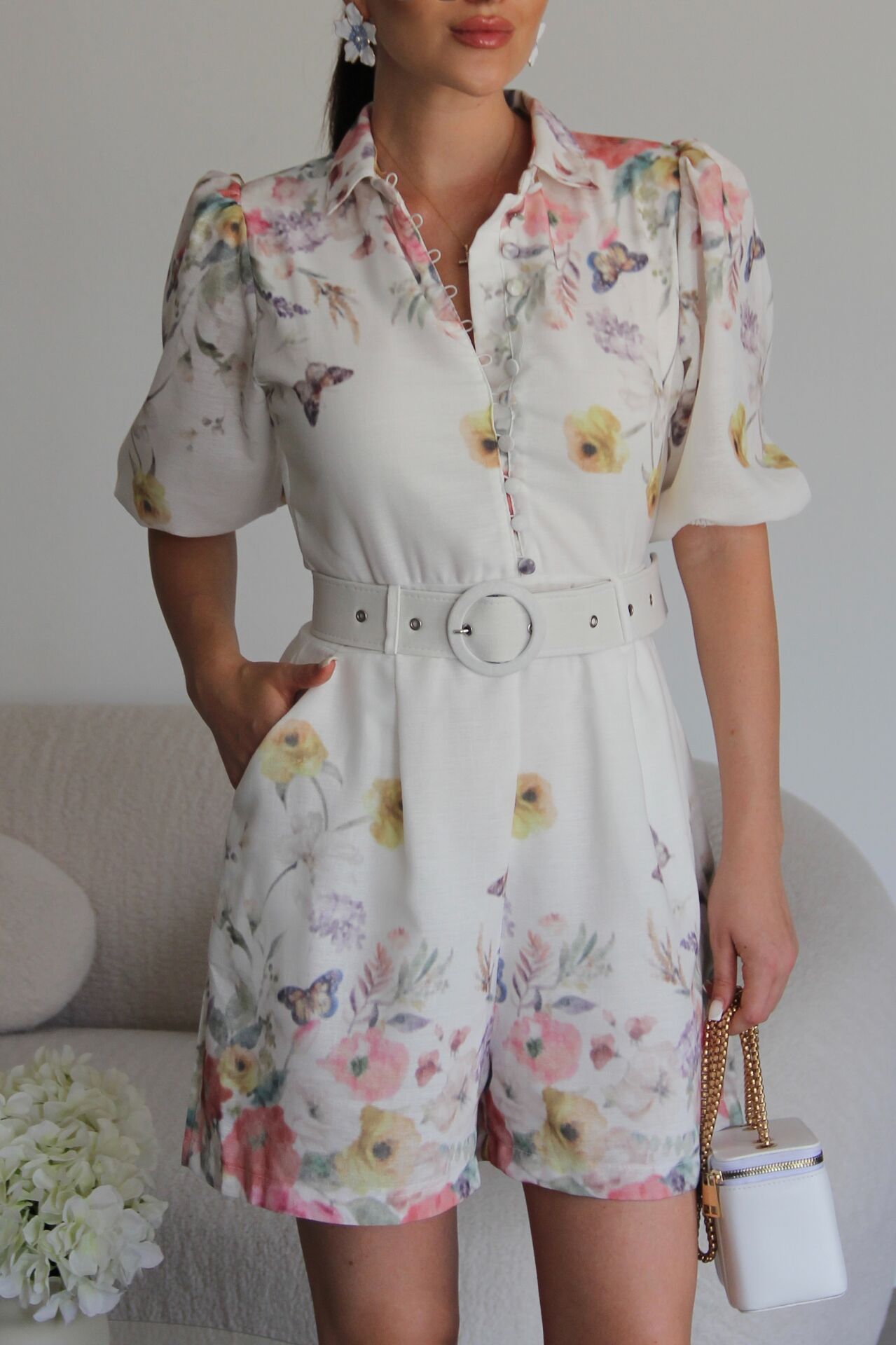 Çiçek Desenli KEMERLİ Düğme Detaylı Astarlı Mini Premium Keten Tulum
