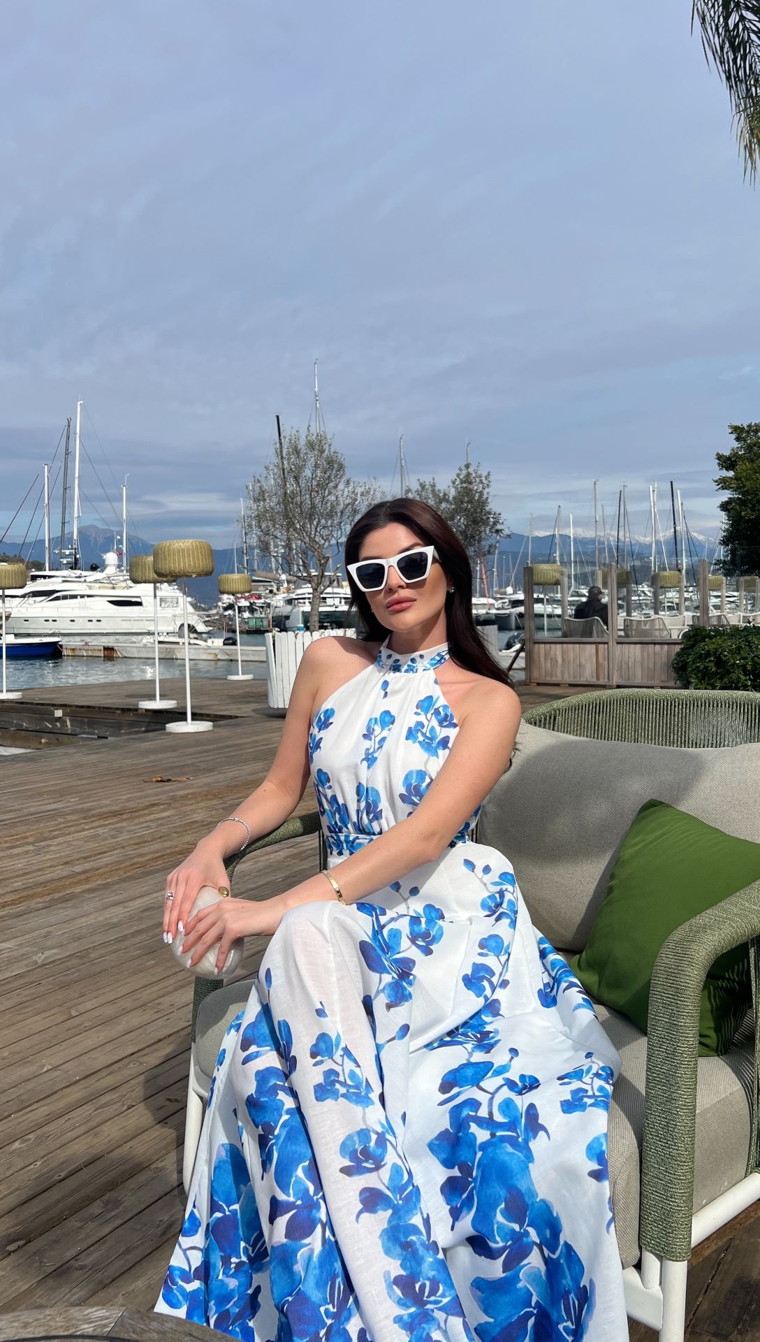 Çiçek Desenli Mavi Beyaz Boyundan Bağlama Detaylı Maxi Uzun Premium Elbise