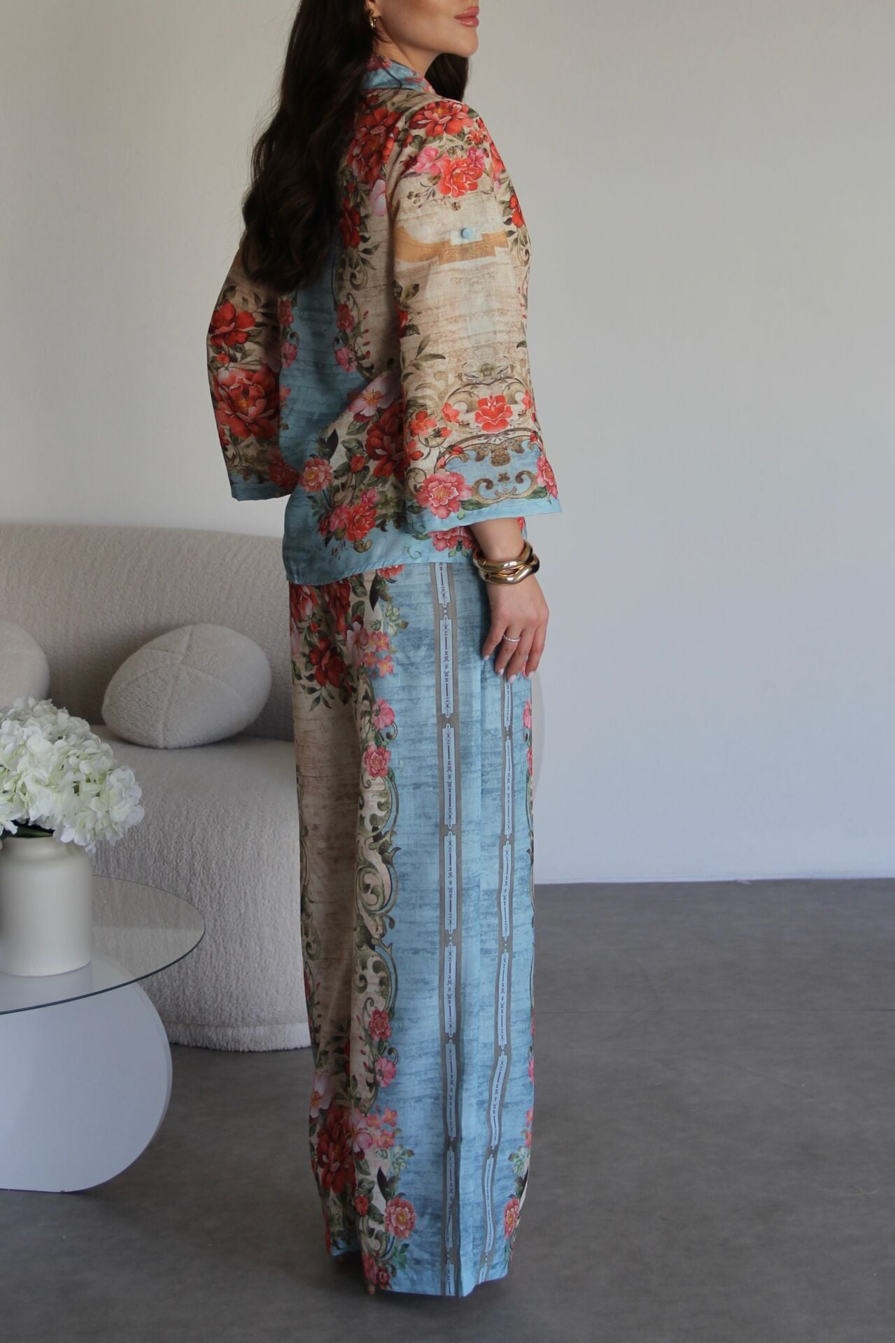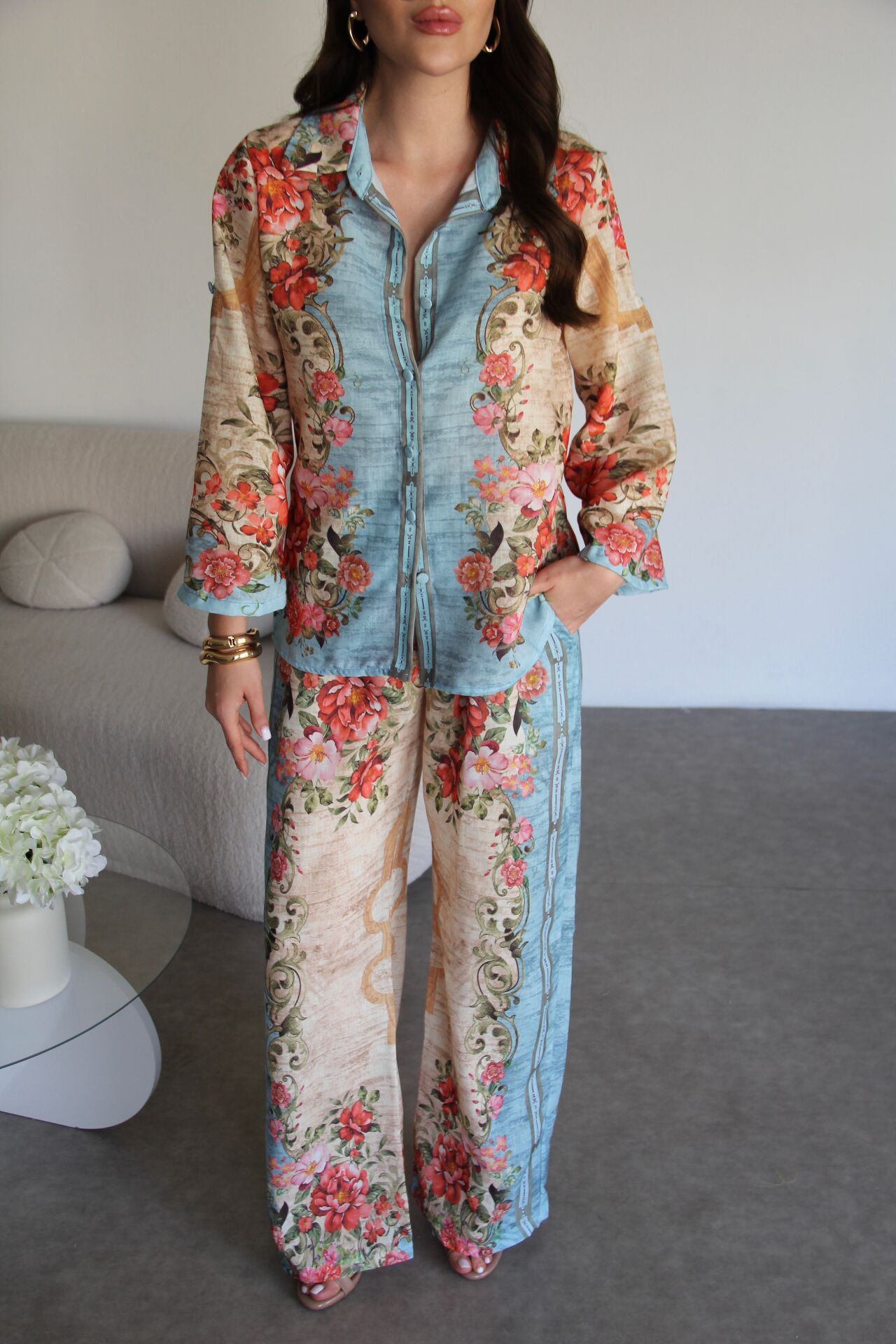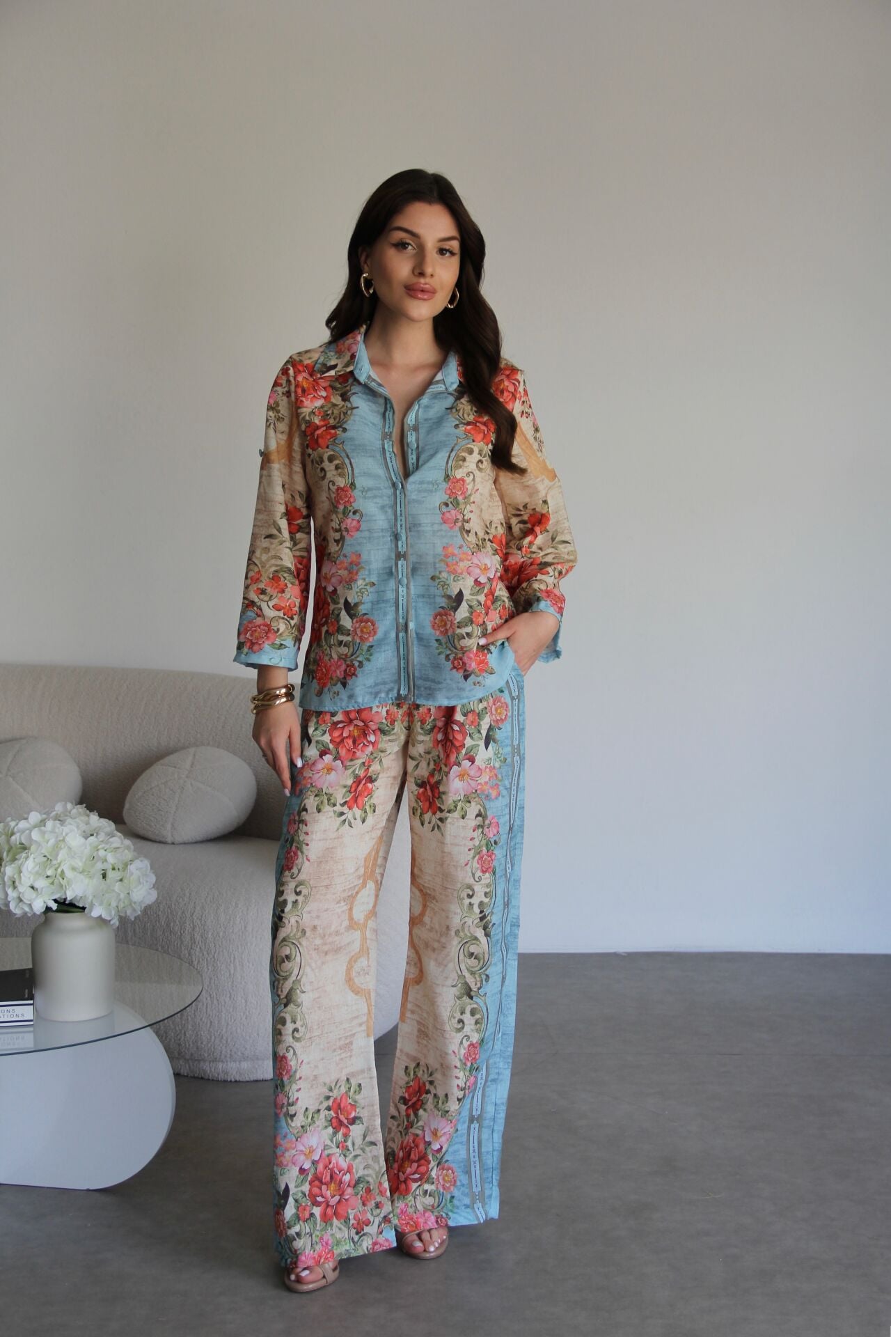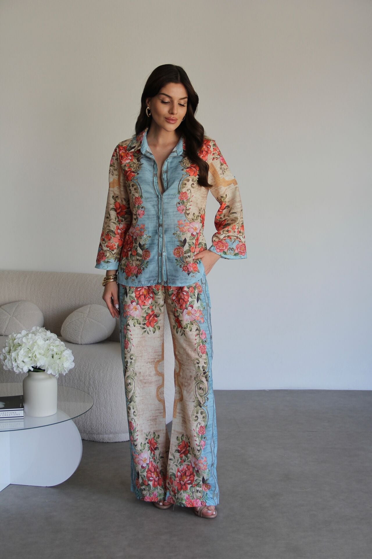 Çok Renkli Desenli Gömlek Pantolon Alt Üst Premium Keten Takım