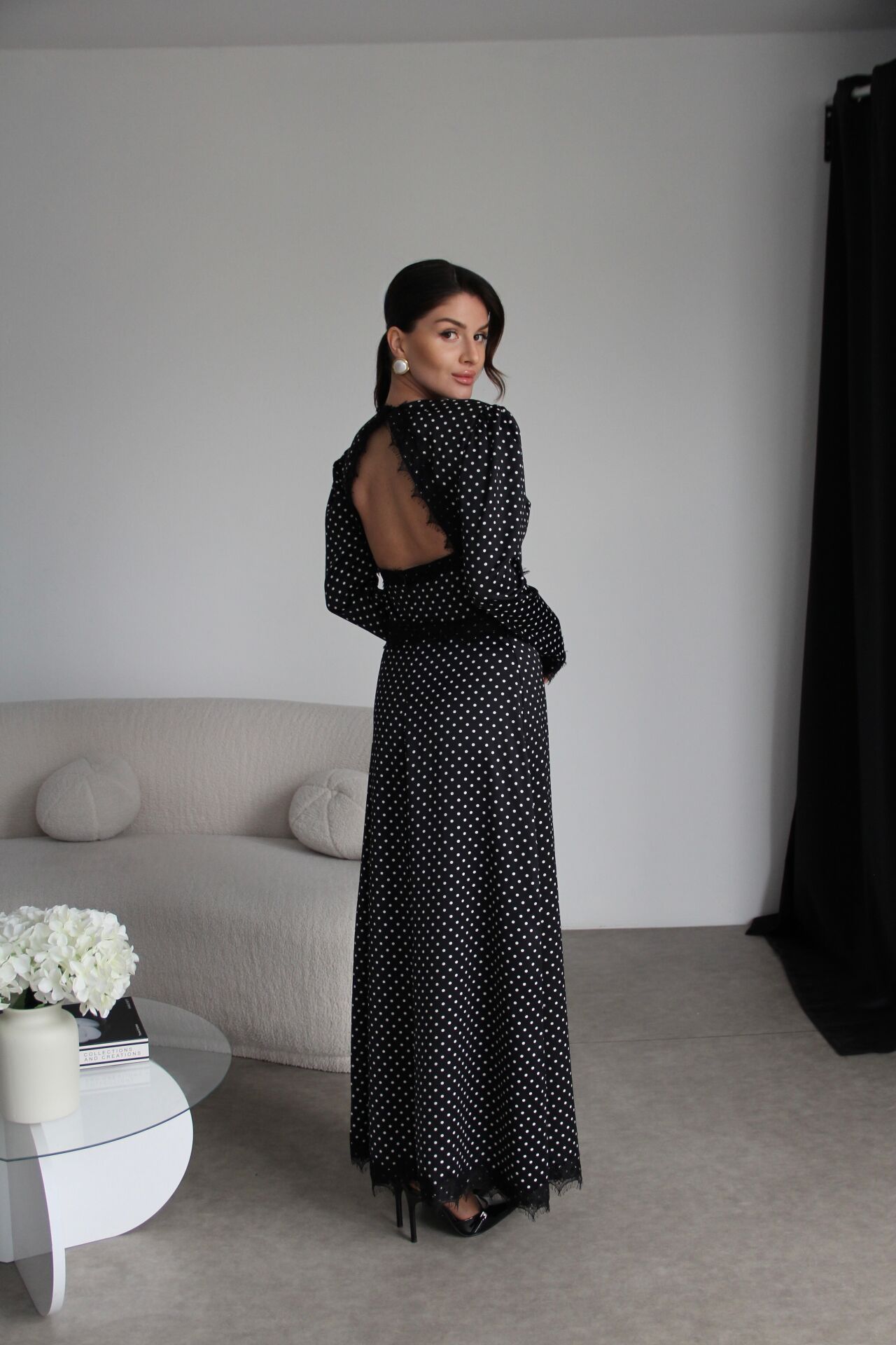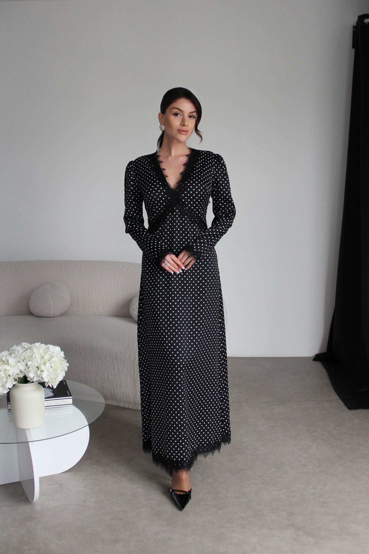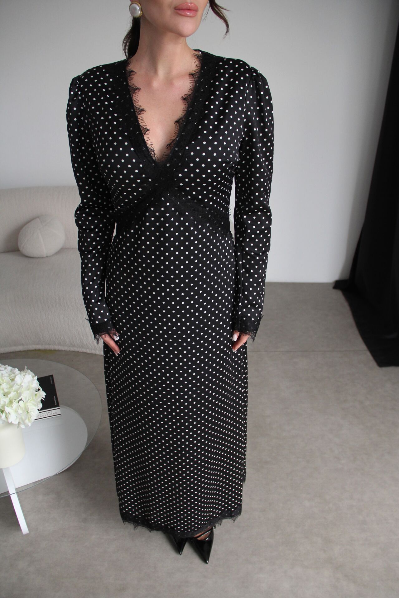 Dantel Detaylı Sırt Dekolteli Premium Maxi Uzun Puantiyeli Saten Elbise.
