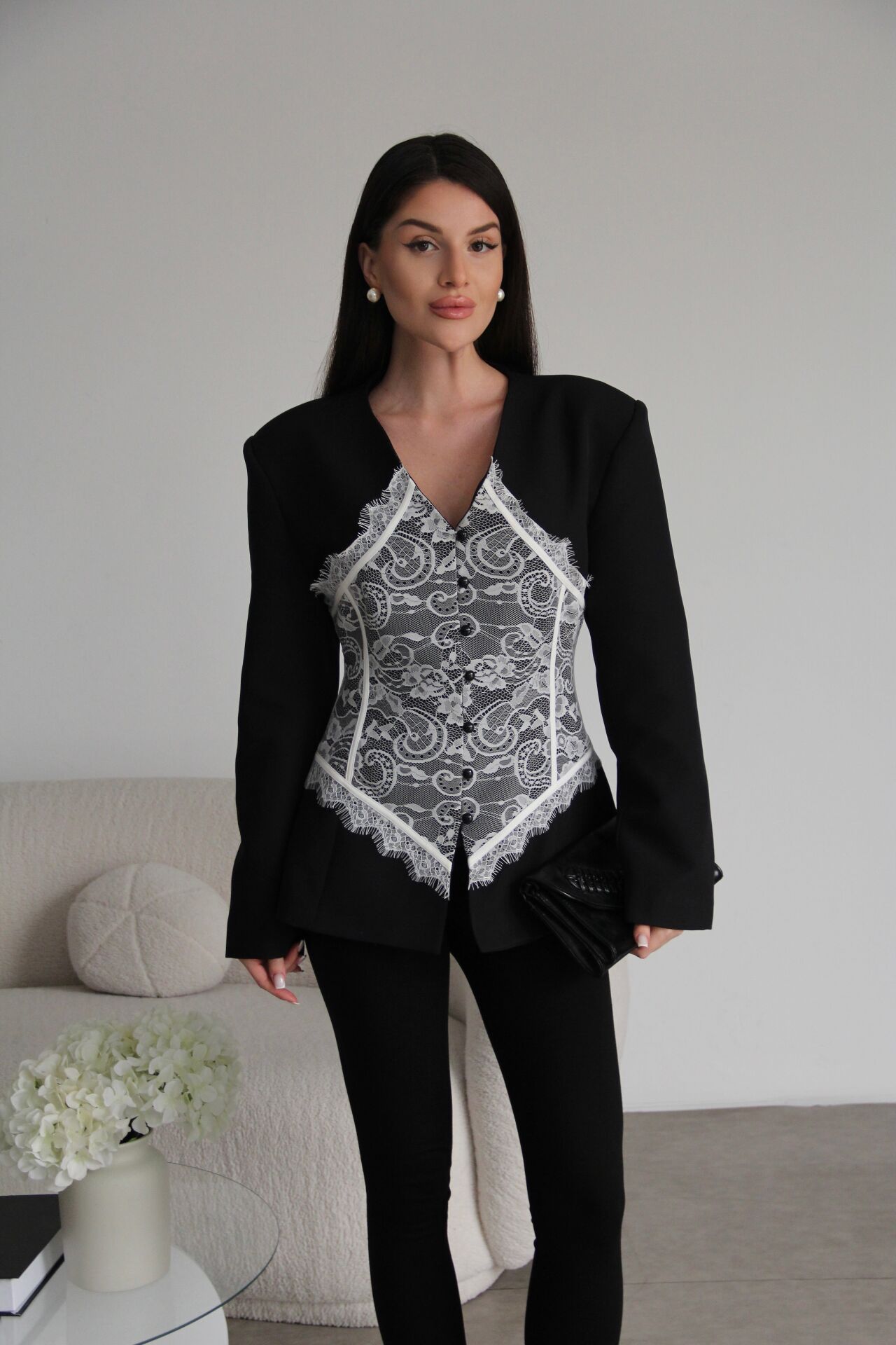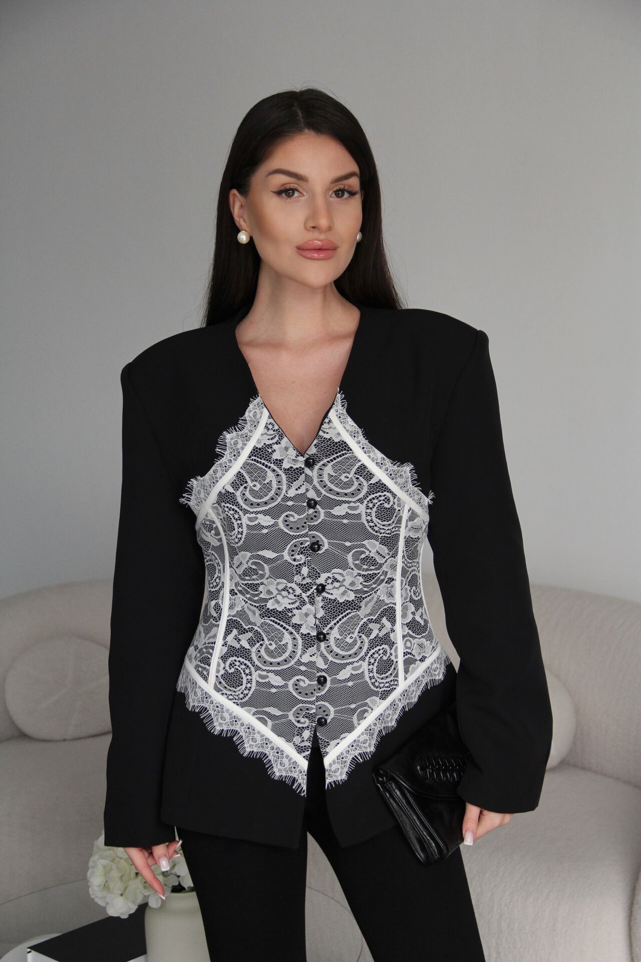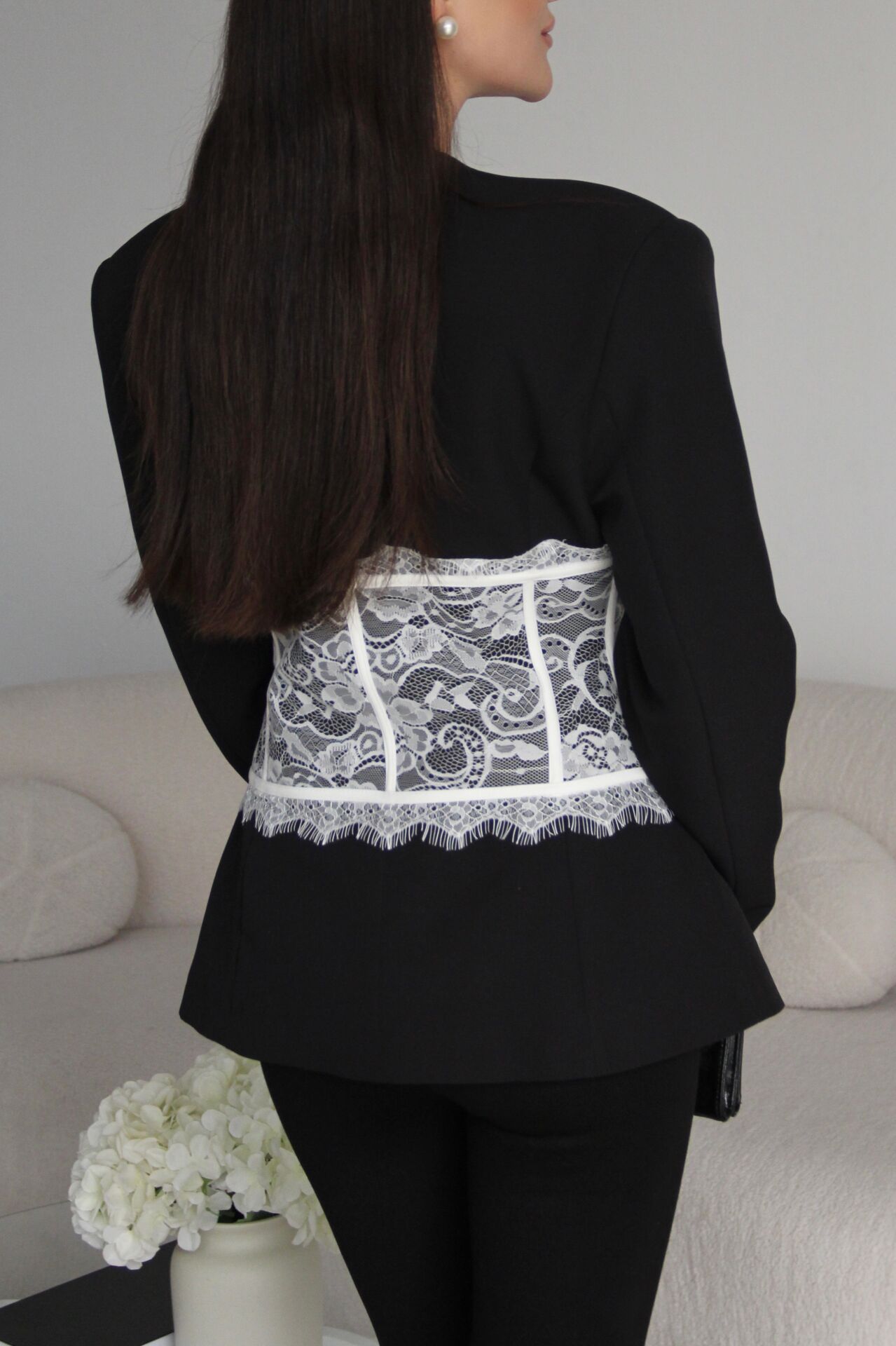 Premium kaliteye sahip, dantel detaylarıyla zenginleştirilmiş ceket, zarif tasarımıyla dikkat çeker.