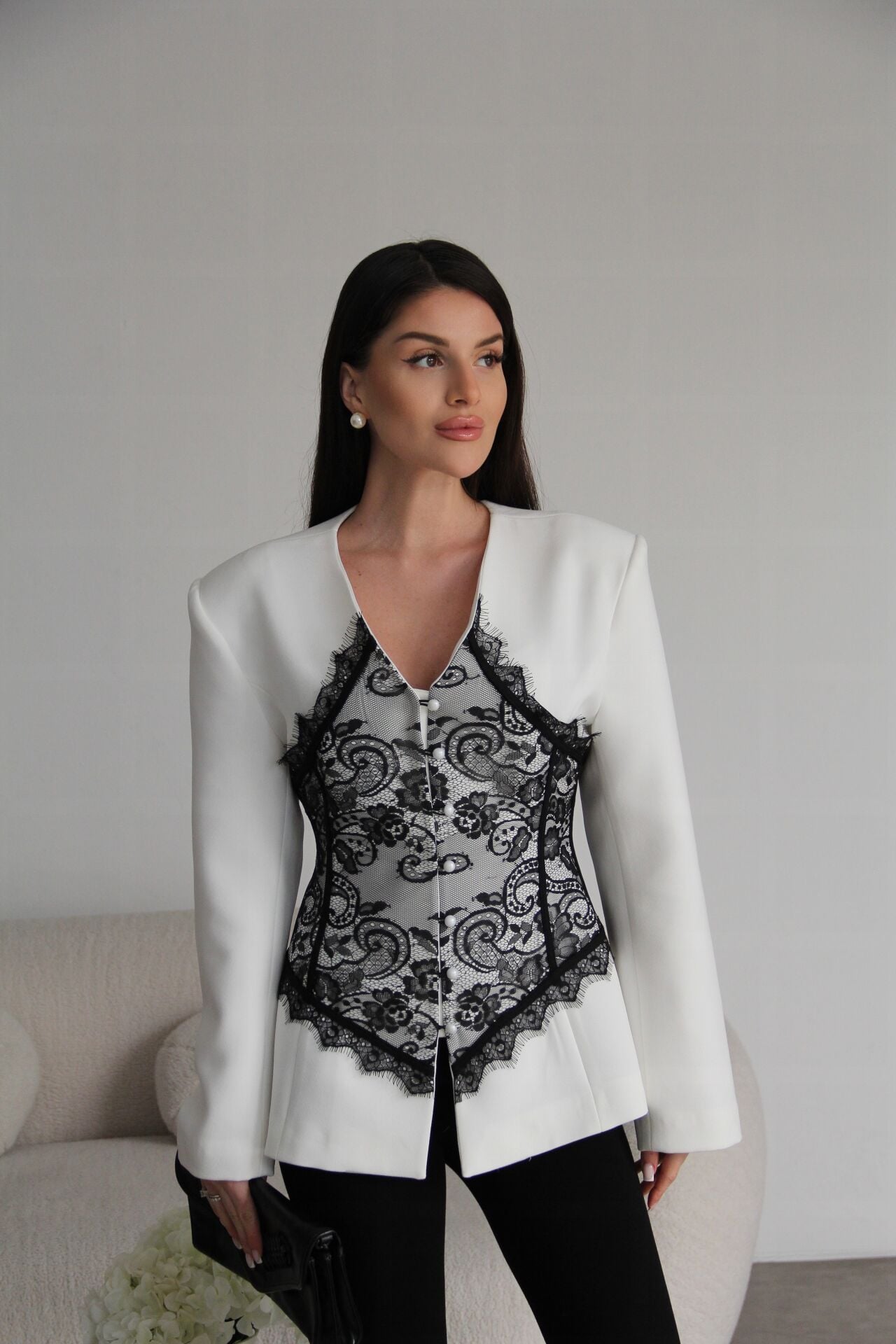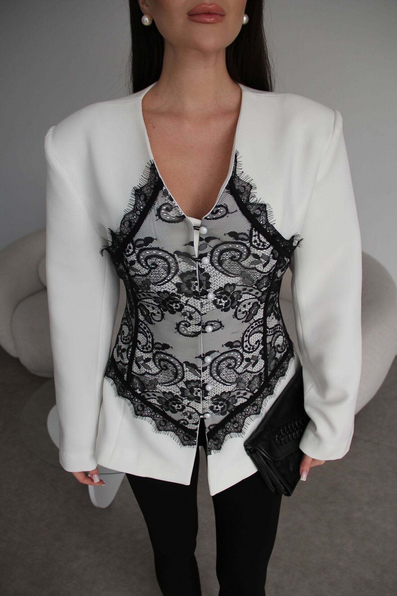 Premium kaliteye sahip, dantel detaylarıyla zenginleştirilmiş ceket, zarif tasarımıyla dikkat çeker.