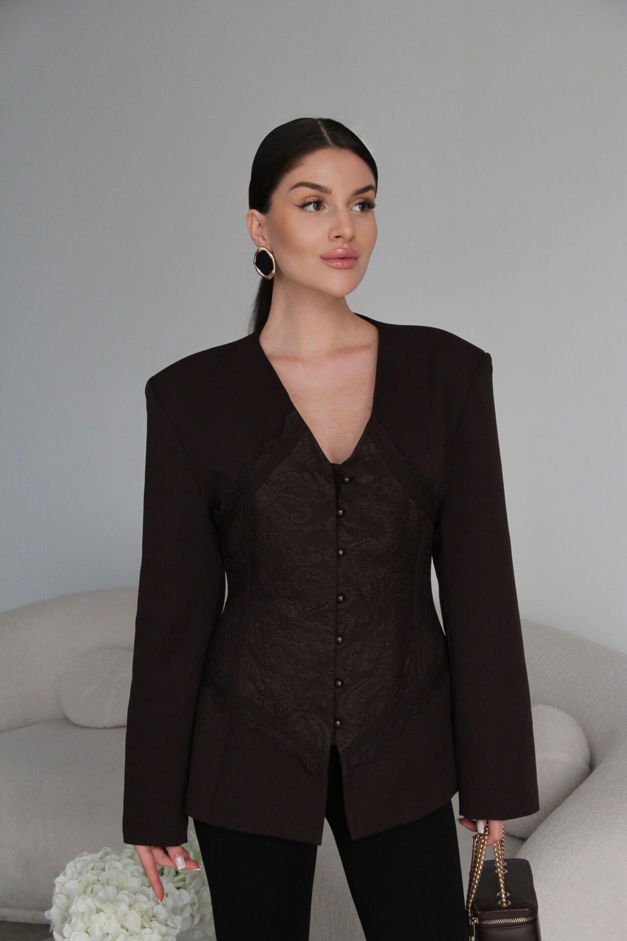 Dantel Detaylı V Yaka Tasarım Premium Kahve Blazer Ceket