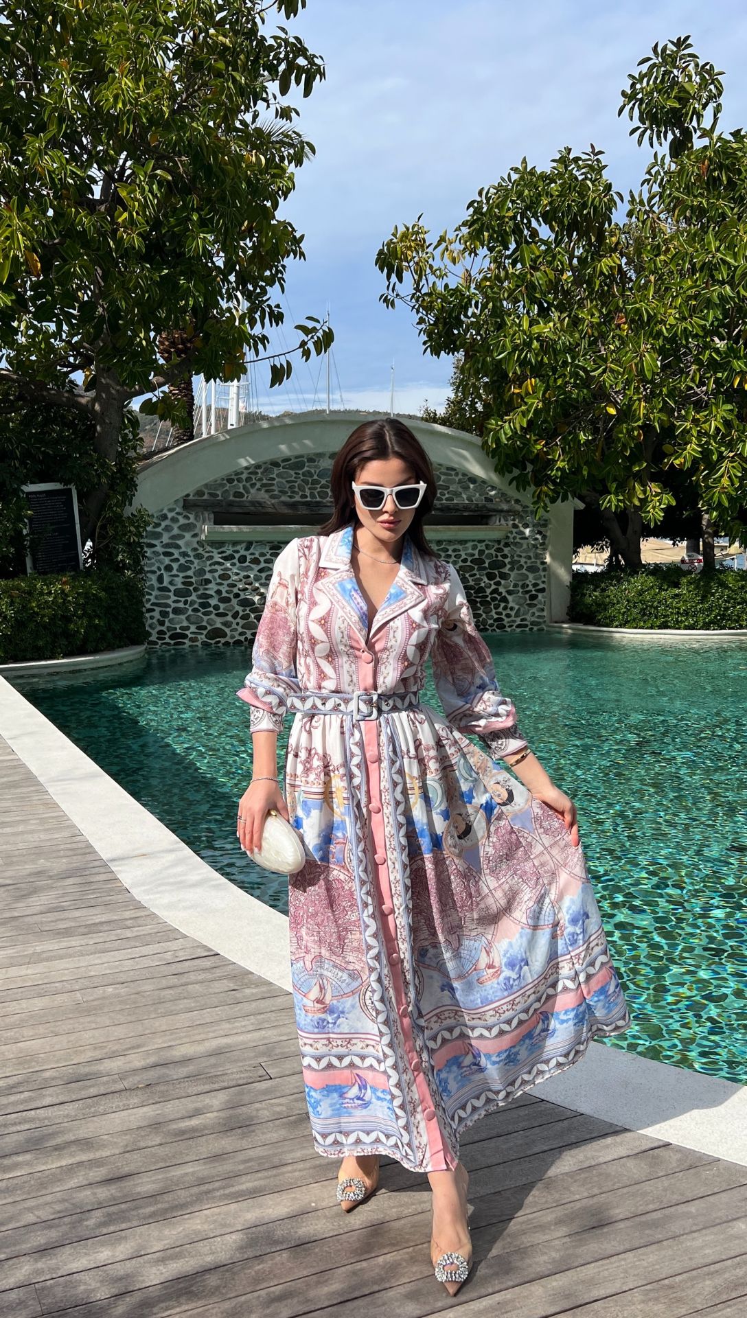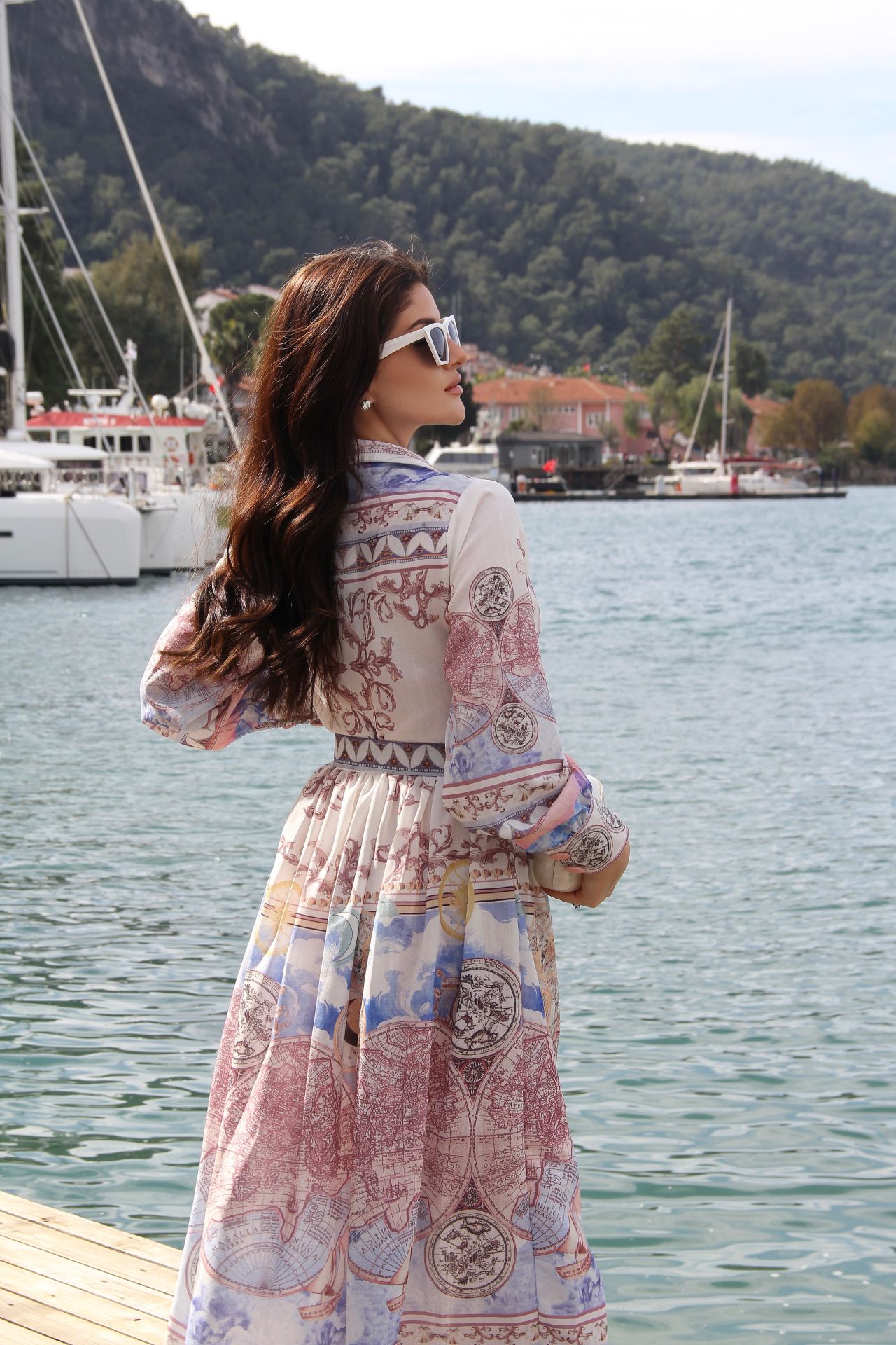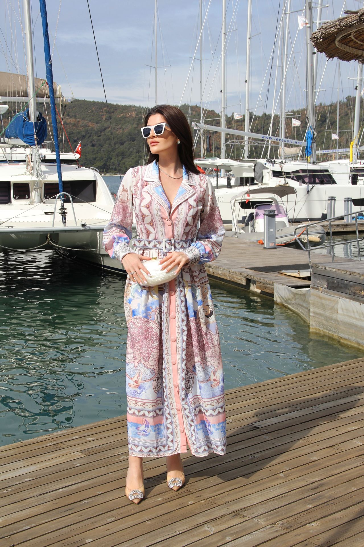 - Yüksek Kalite, Yeni Sezon Desenli Kemerli Boydan Düğme Detaylı Premium Uzun Keten Elbise