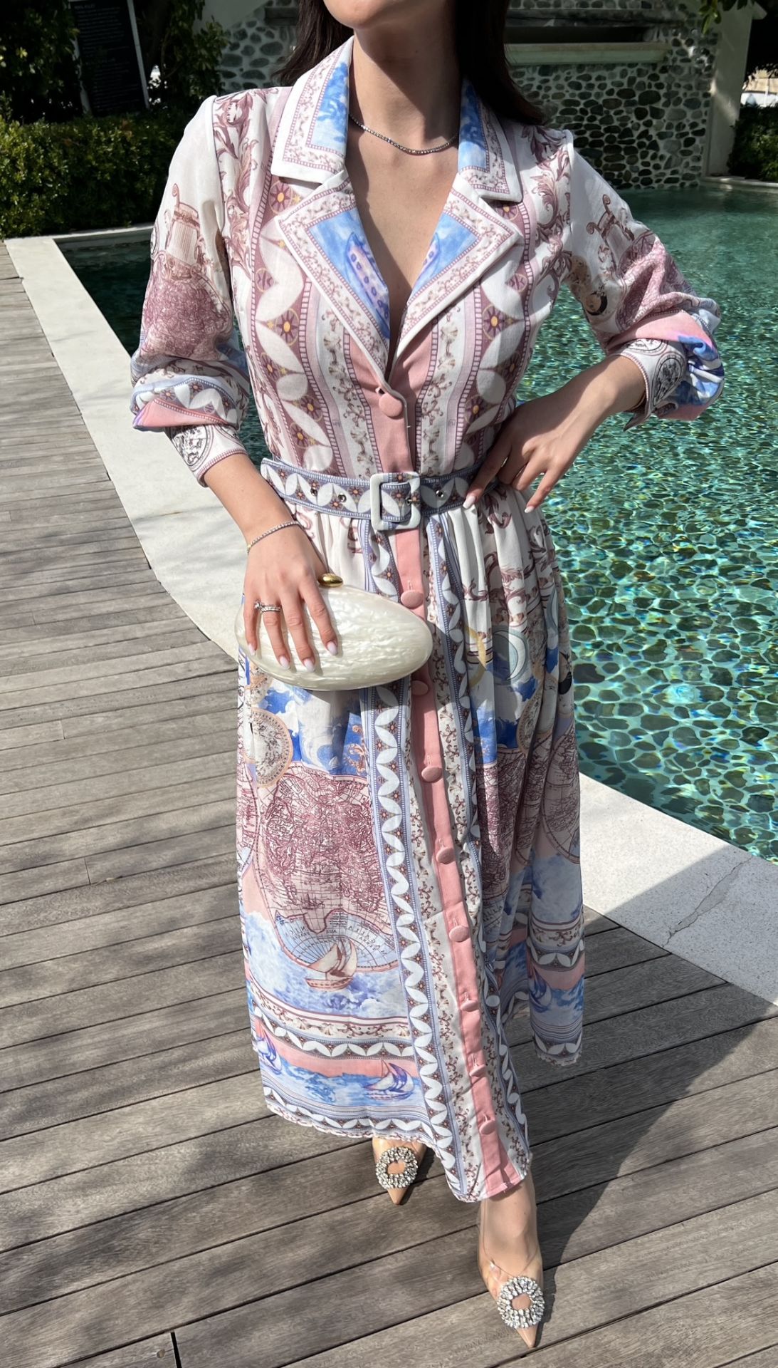 Desenli Kemerli Boydan Düğme Detaylı Premium Uzun Keten Elbise