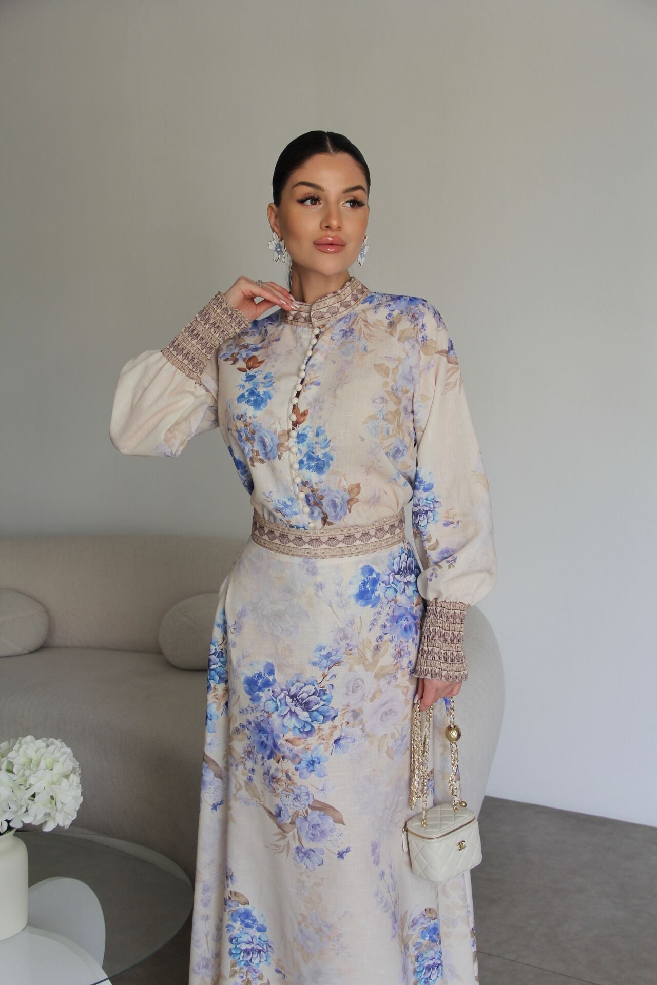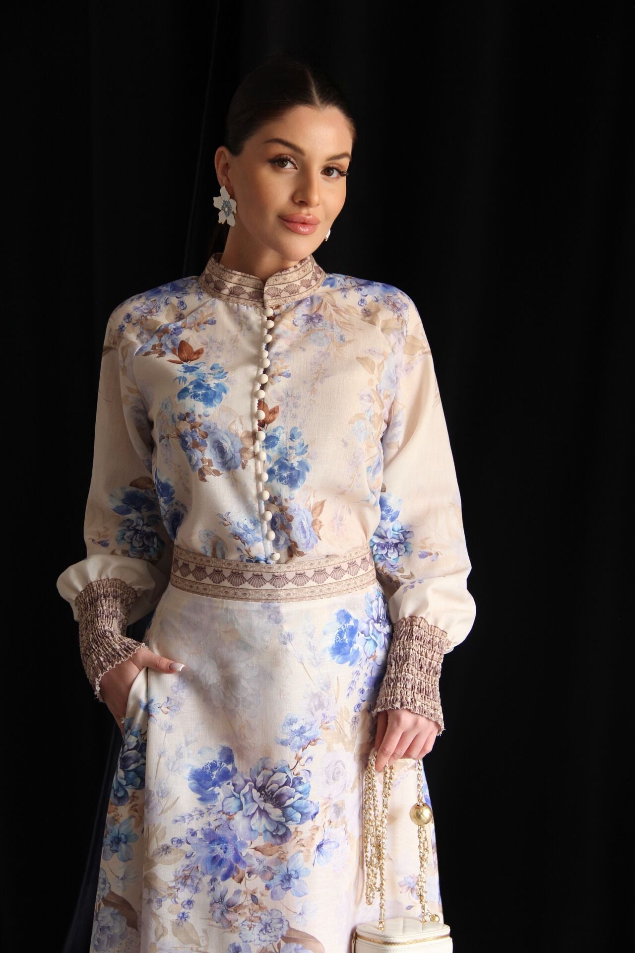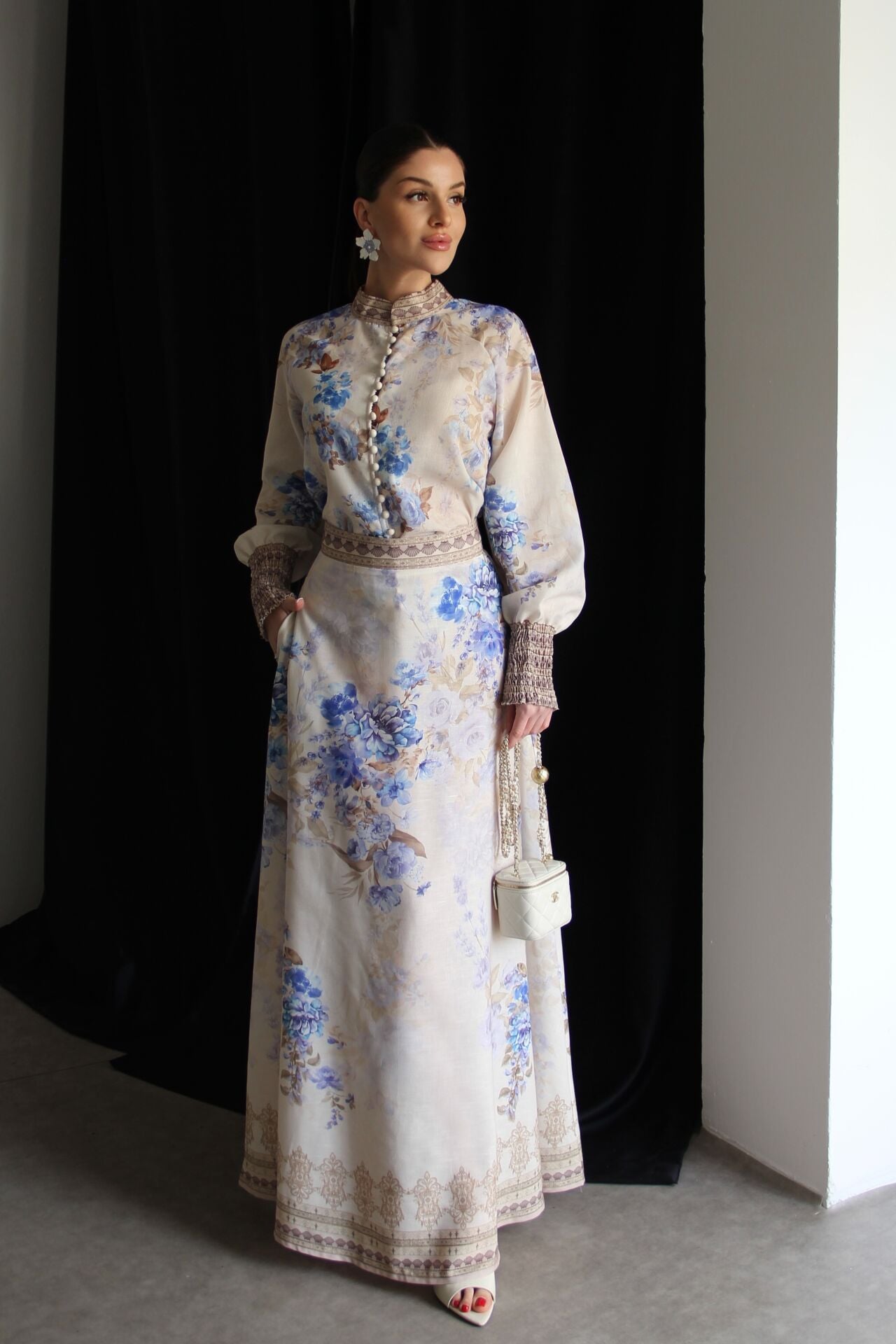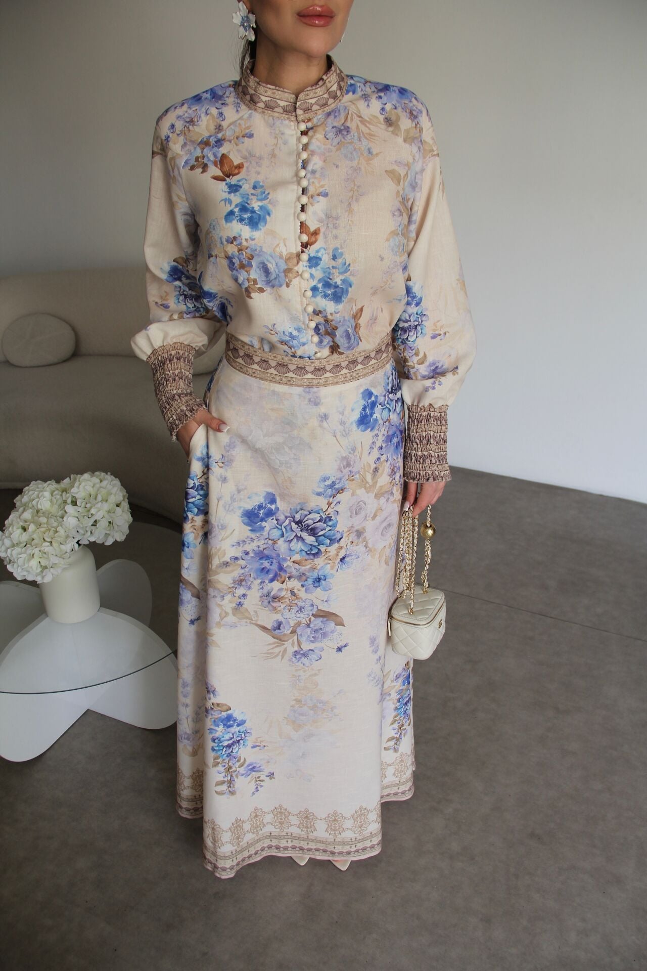 Desenli Kollar Gipe Detaylı Gömlek ve Maxi Etek Premium Tasarım Keten Takım