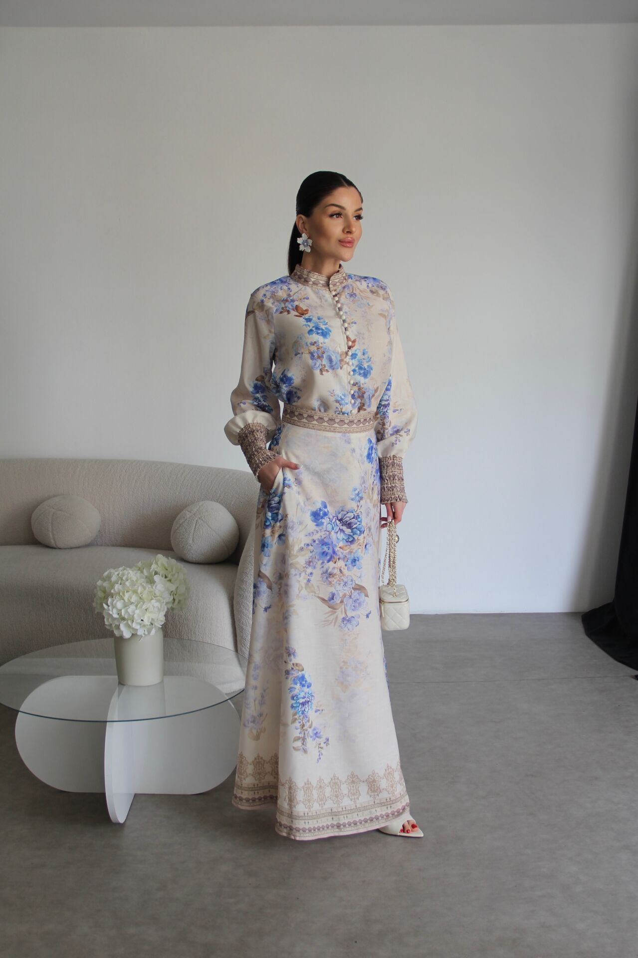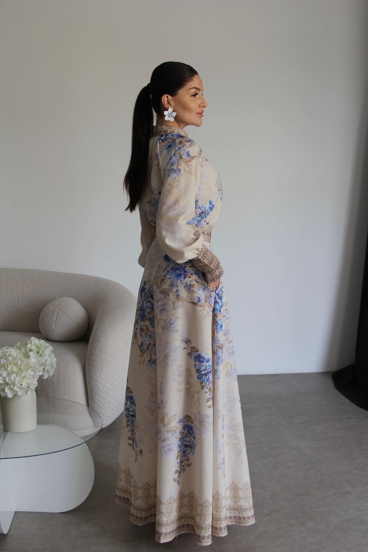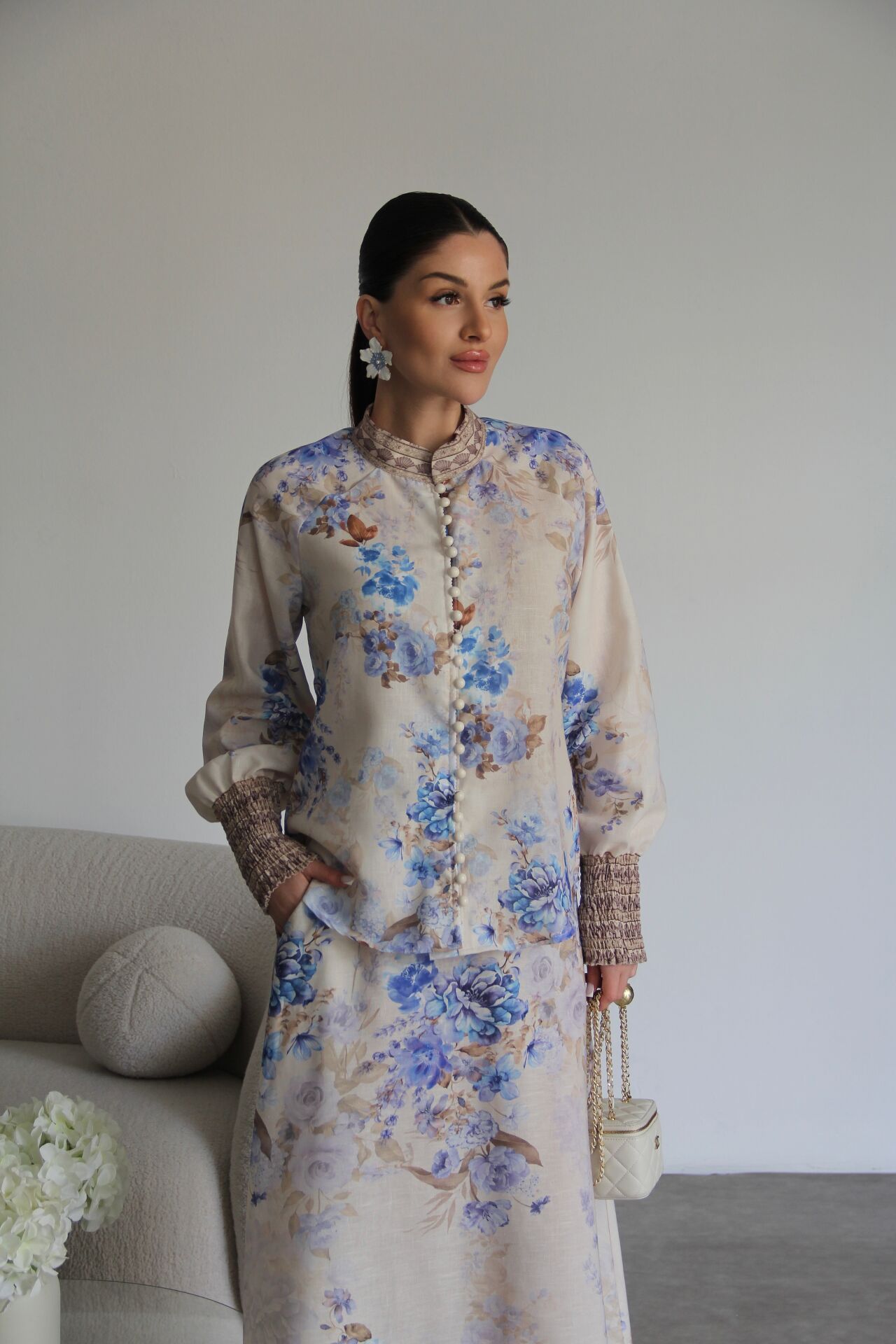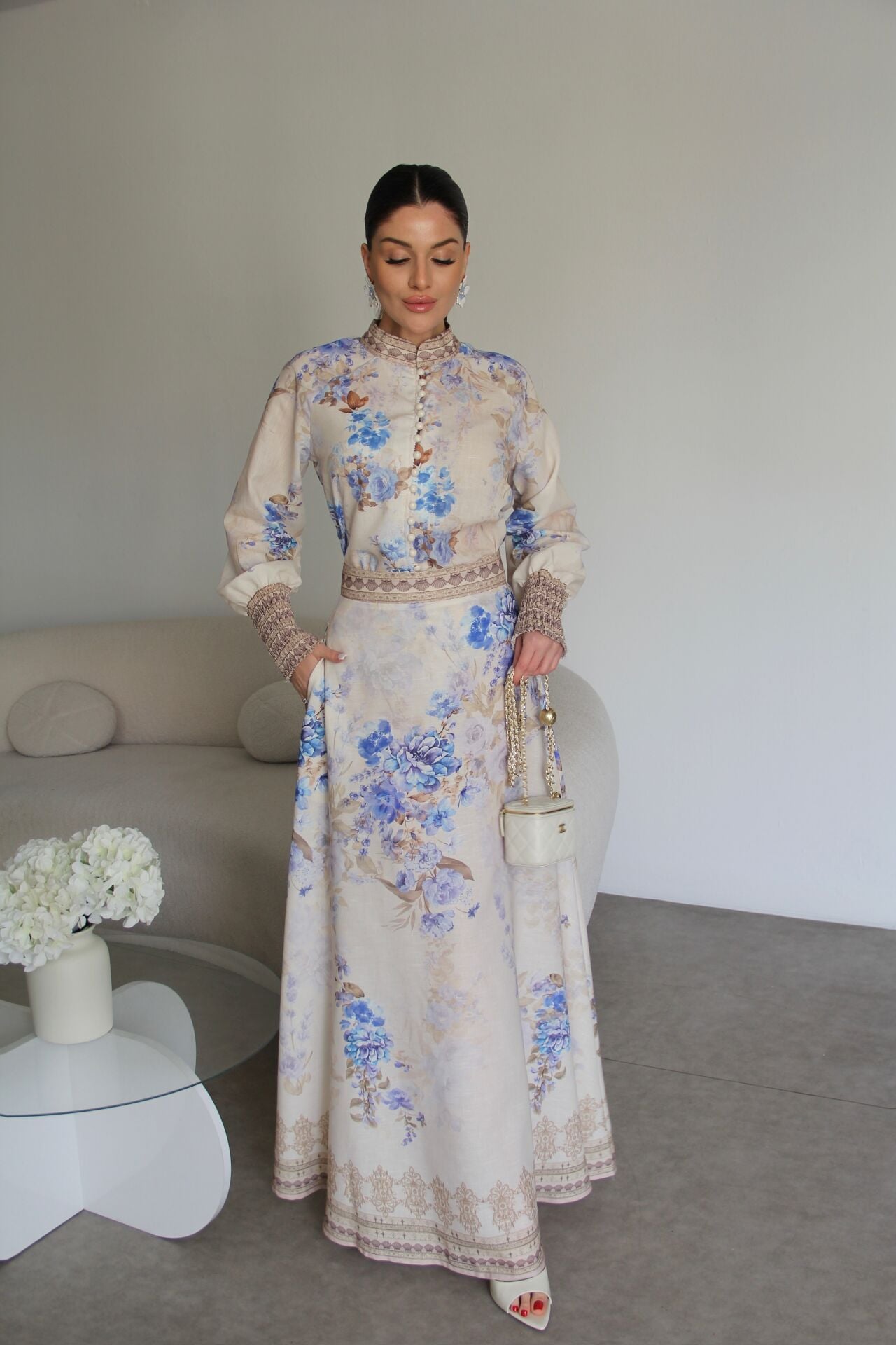 Desenli Kollar Gipe Detaylı Gömlek ve Maxi Etek Premium Tasarım Keten Takım