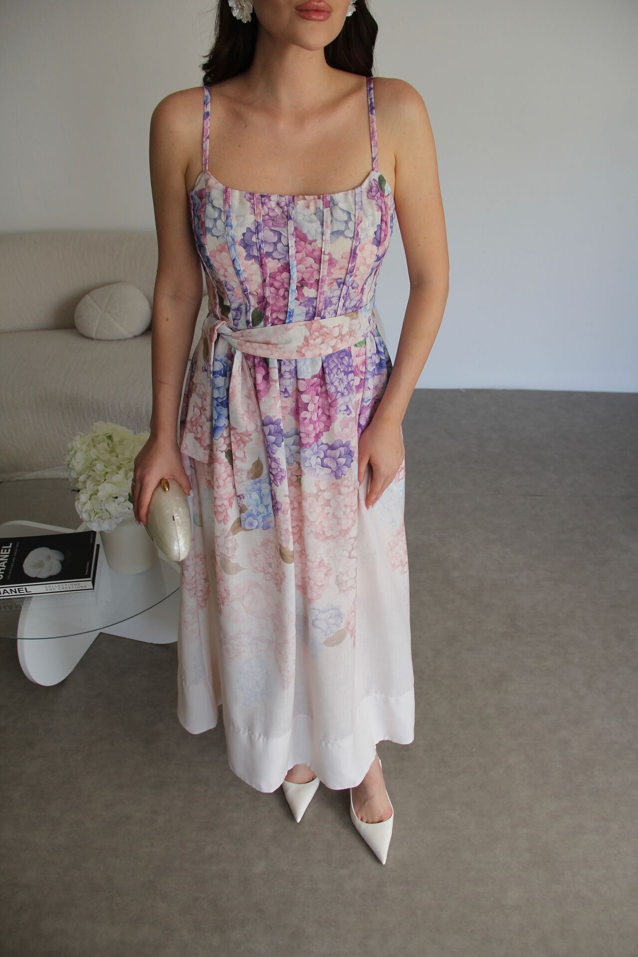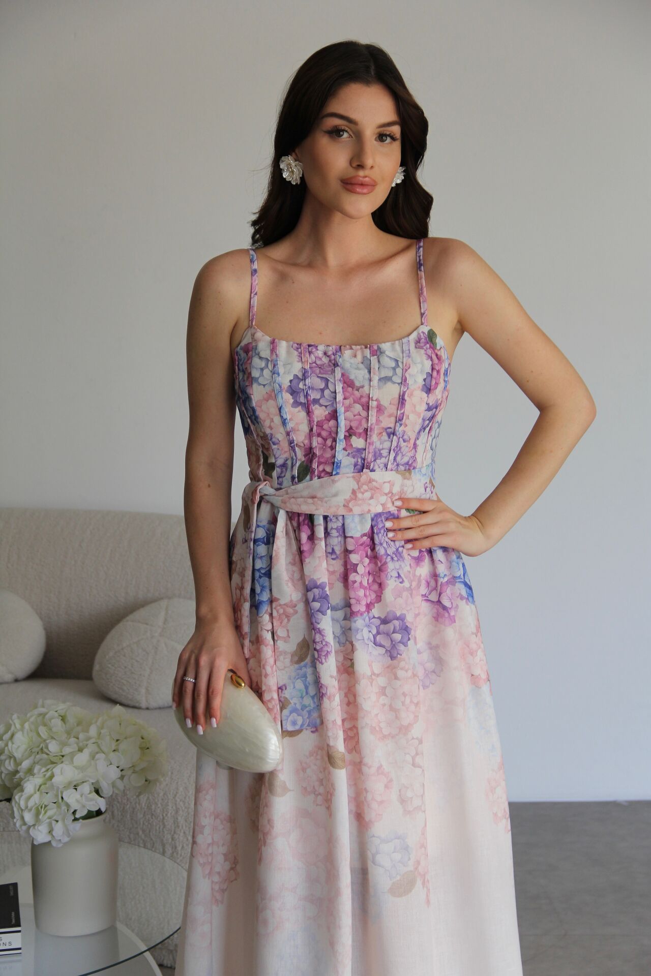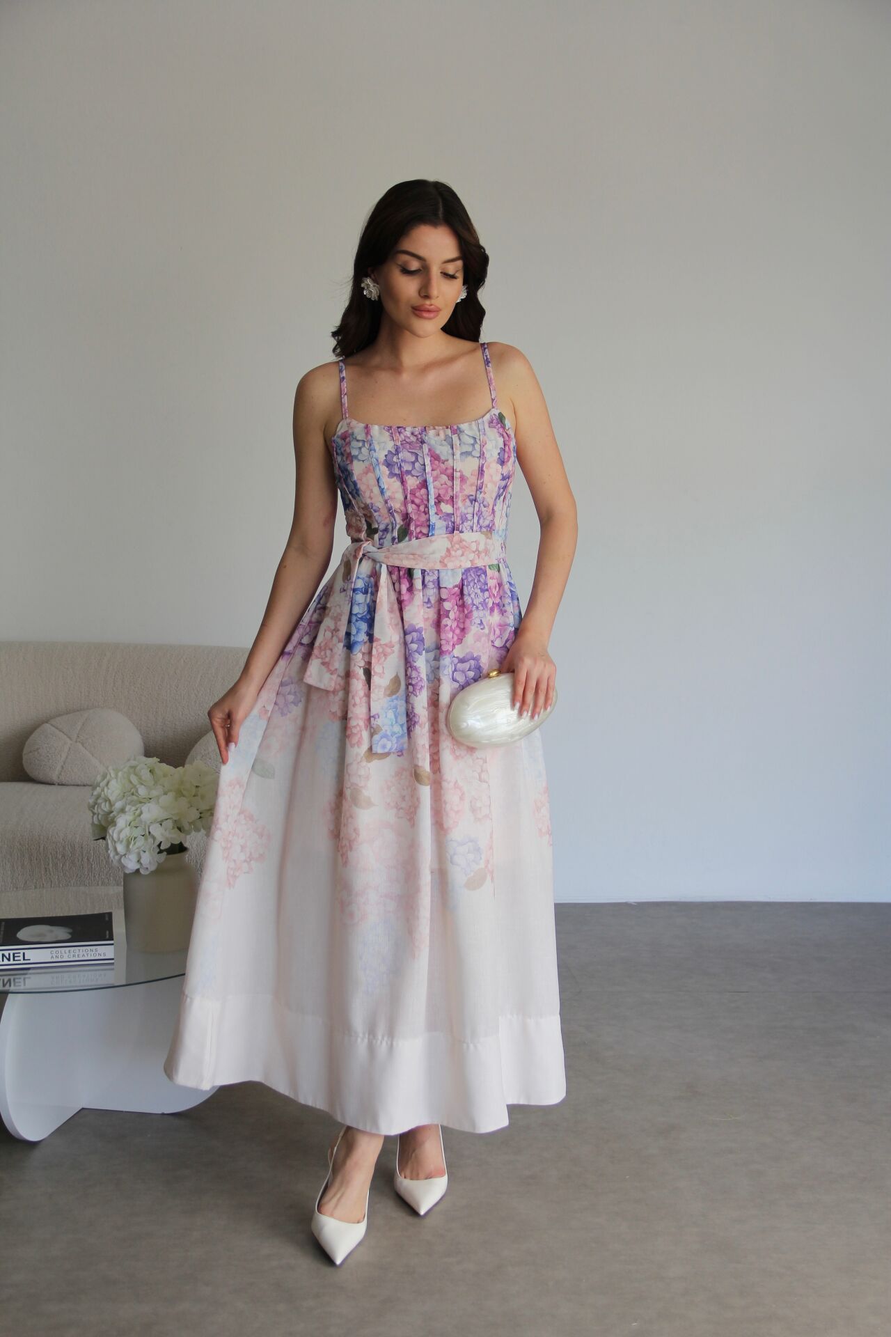 - Yüksek Kalite, Askılı Desenli KUŞAKLI Midi Boy Premium Tasarım Keten Elbise