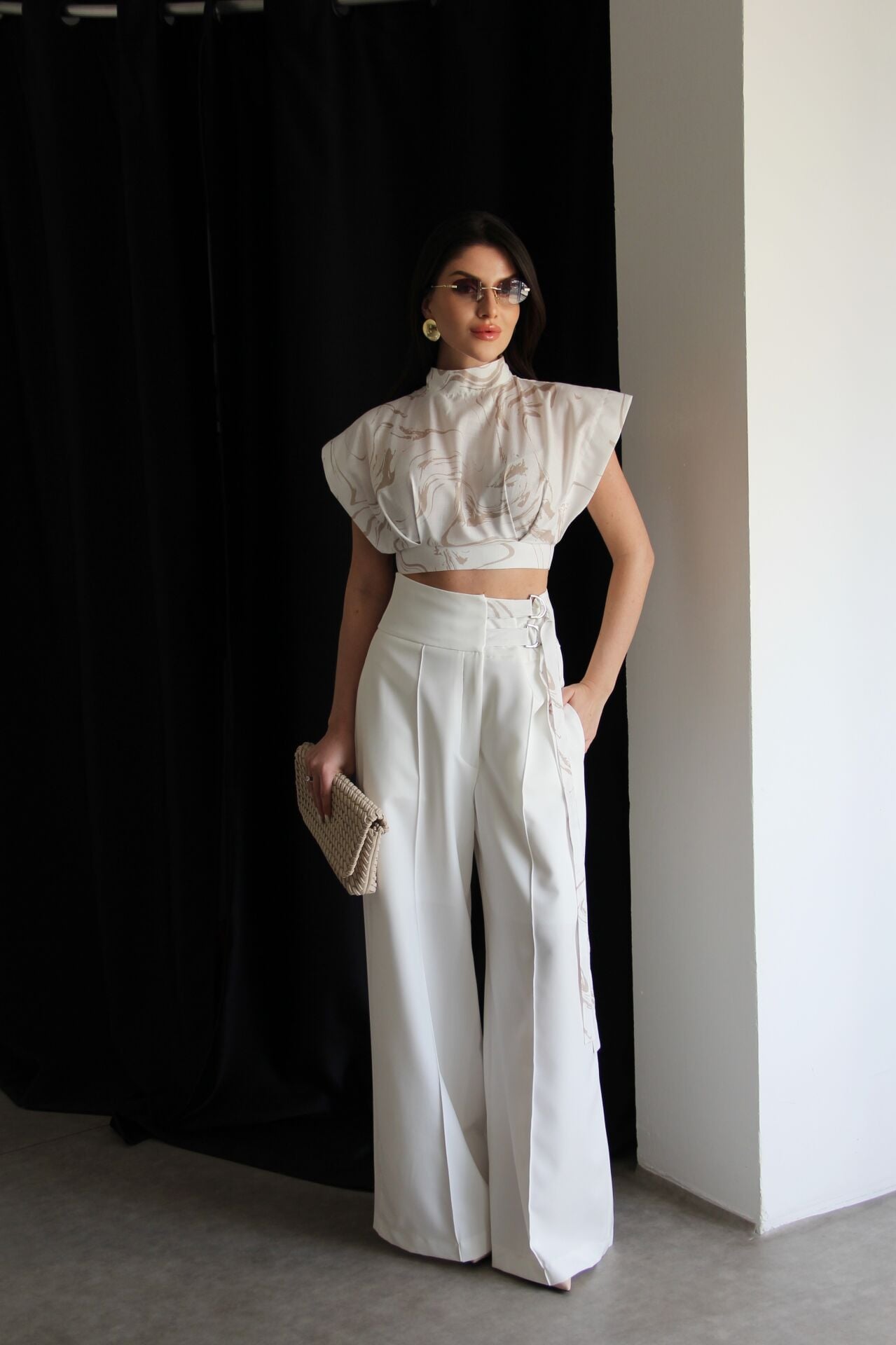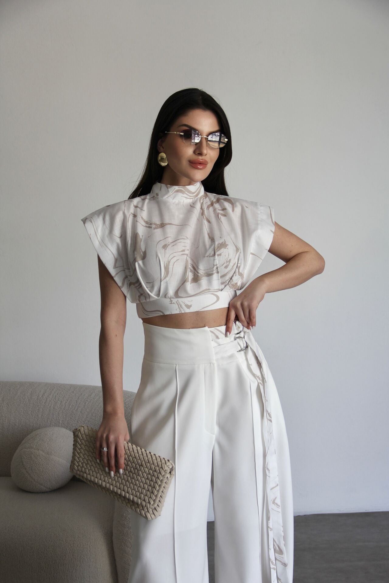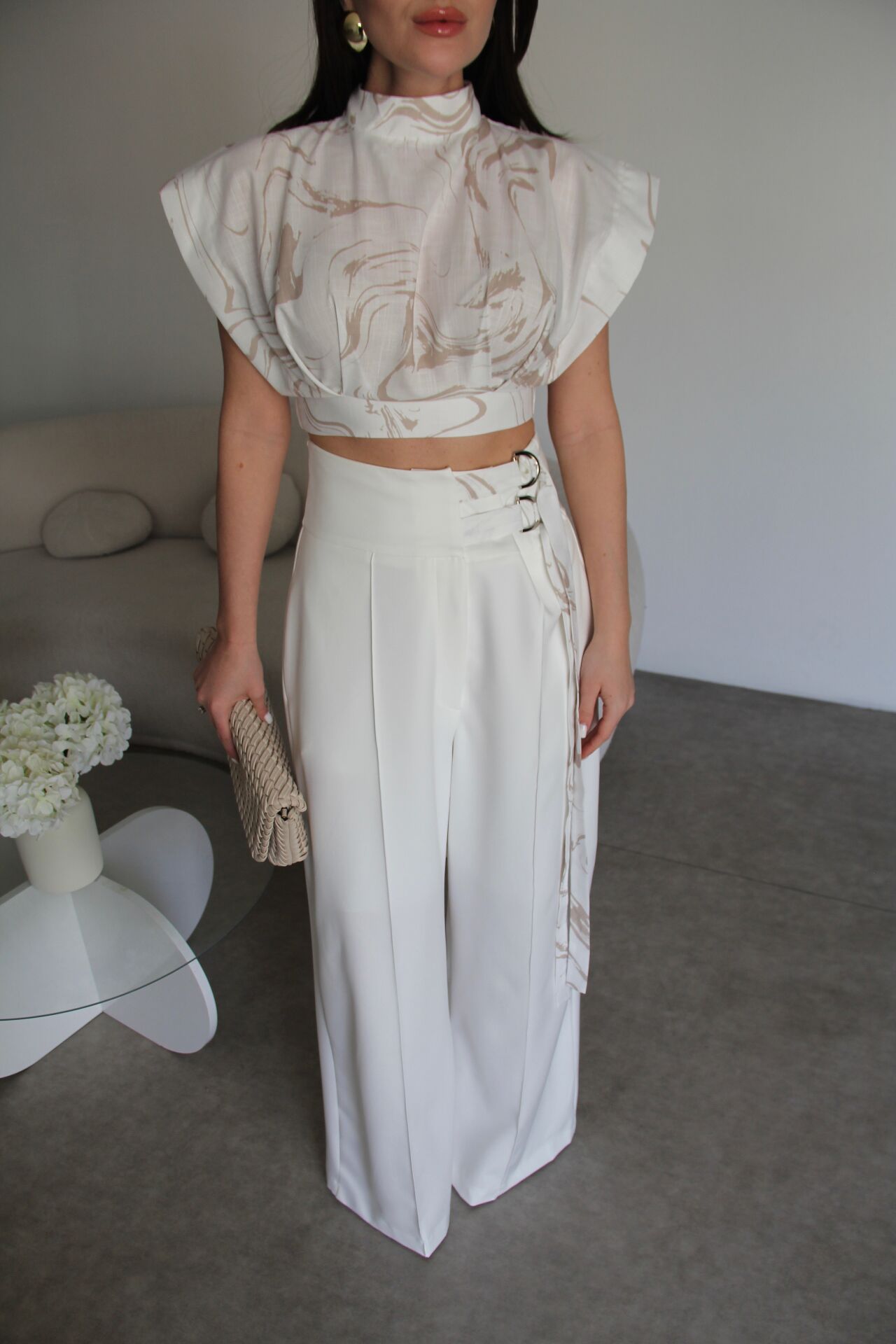 Desenli Tasarım Dik Yaka Bluz ve Kemer Detaylı Palazzo Pantolon Premium Takım