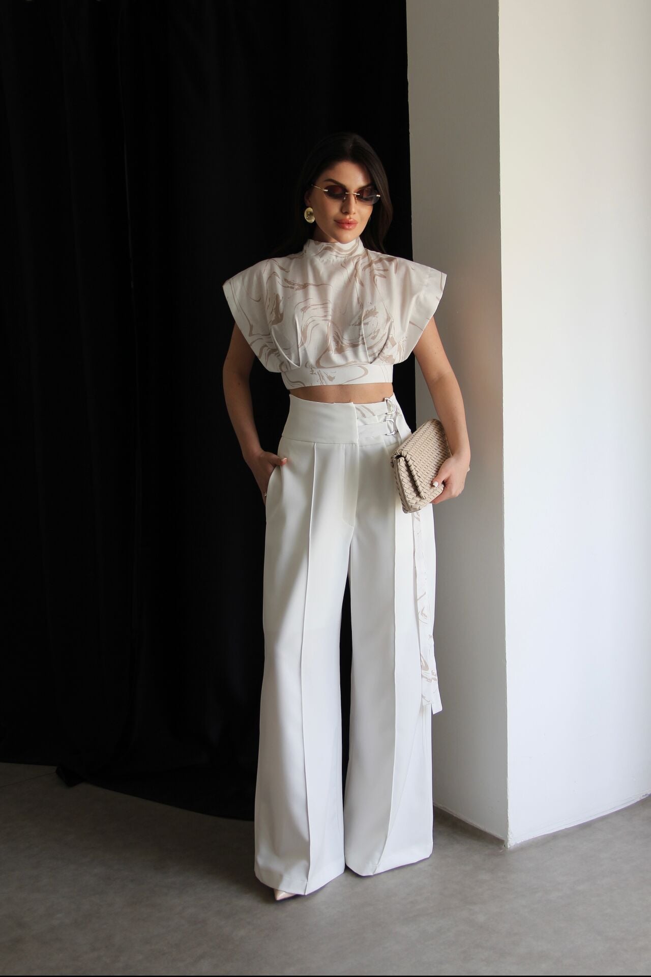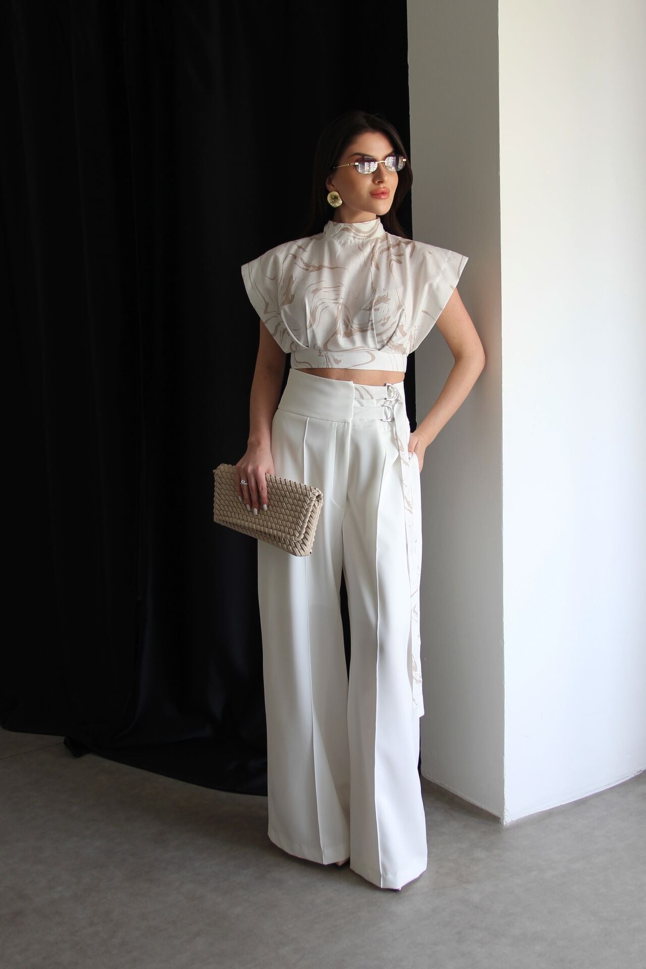 - - - Julidress.; Desenli Tasarım Bluz(bel kısmı lastiklidir) ve Kemer Detaylı Palazzo Pantolon Alt Üst Premium Takım.; Kumaş Türü: %93 Polyester %7 Elastan .; Bluz boyu:Ortalama:45 cm, Pantolon boyu:108-110cm, Paça boyu:27 cm dir.;.; Model Boy : 176 cm .; Model Kilo : 55 kg.; İki parçadan oluşan şık ve modern bir takım: Bluz ve pantolon alt üst tasarım.; - Premium kumaş kullanımı ile konfor ve şıklığı bir arada sunar.; - Alt-üst takım olarak tasarlanmıştır, kombin derdi olmadan kolayca şık görünmenizi sağlar.; - 2+ parça paket içeriği ile tam bir set halinde gelir.;.; **Şık ve Modern Tasarım:** Desenli tasarım bluz ve kemer detaylı palazzo pantolon kombinasyonu, modern ve şık bir görünüm sunar.; - **Çarpıcı Desen:** Bluz üzerindeki desen, takımınıza özgün bir hava katarken, stilinizi ön plana çıkarır.; - **Rahat ve Şık Alt:** Palazzo pantolon, geniş paça tasarımıyla hem rahatlık hem de şıklık sağlar.; - **Zarif Bel Detayı:** Kemer detayı, belinizi vurgulayarak feminen bir siluet oluşturur.; - **Dik Yaka Detayı:** Dik yaka bluz, sofistike bir görünüm sunar ve boynunuzu zarifçe çerçeveler.;