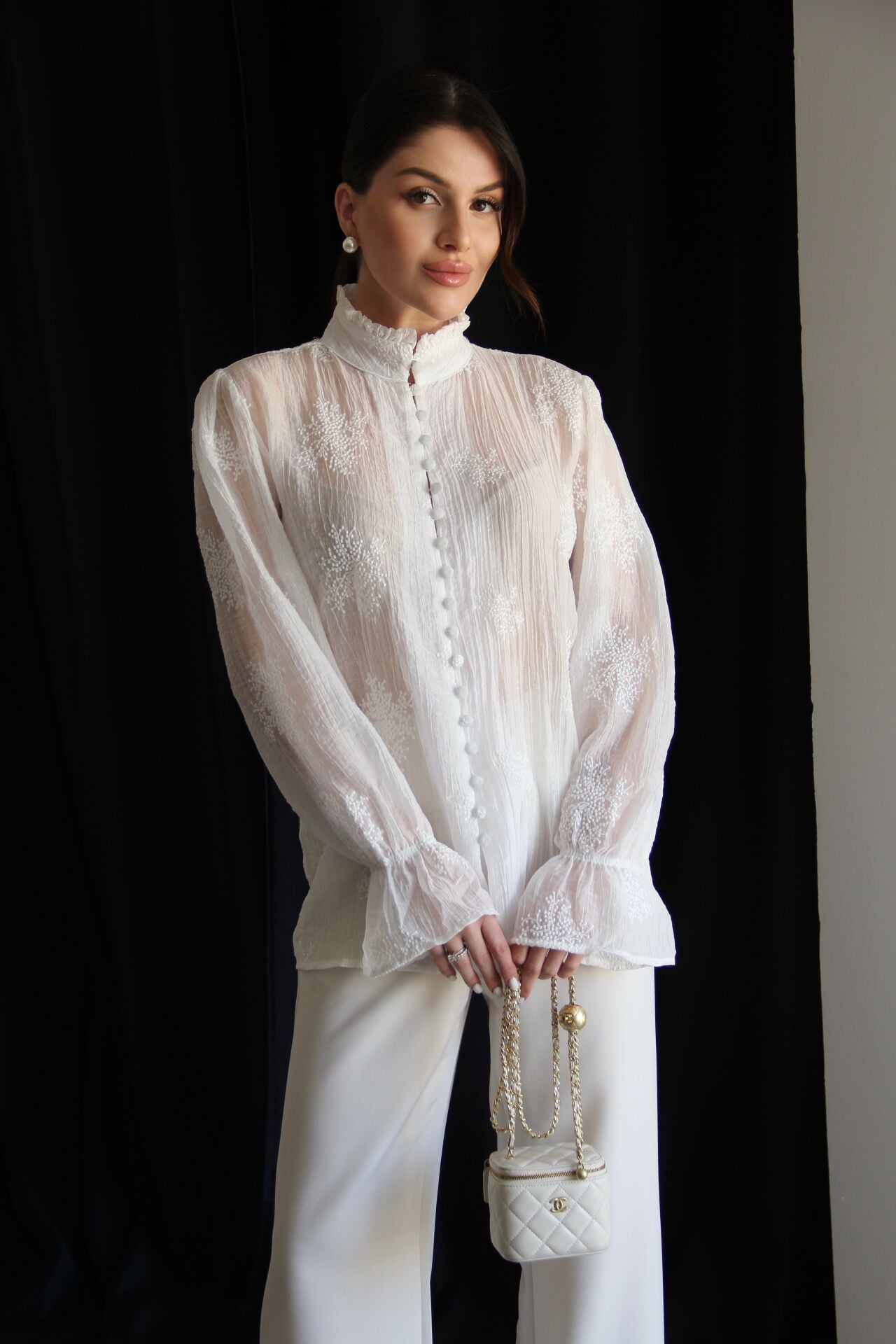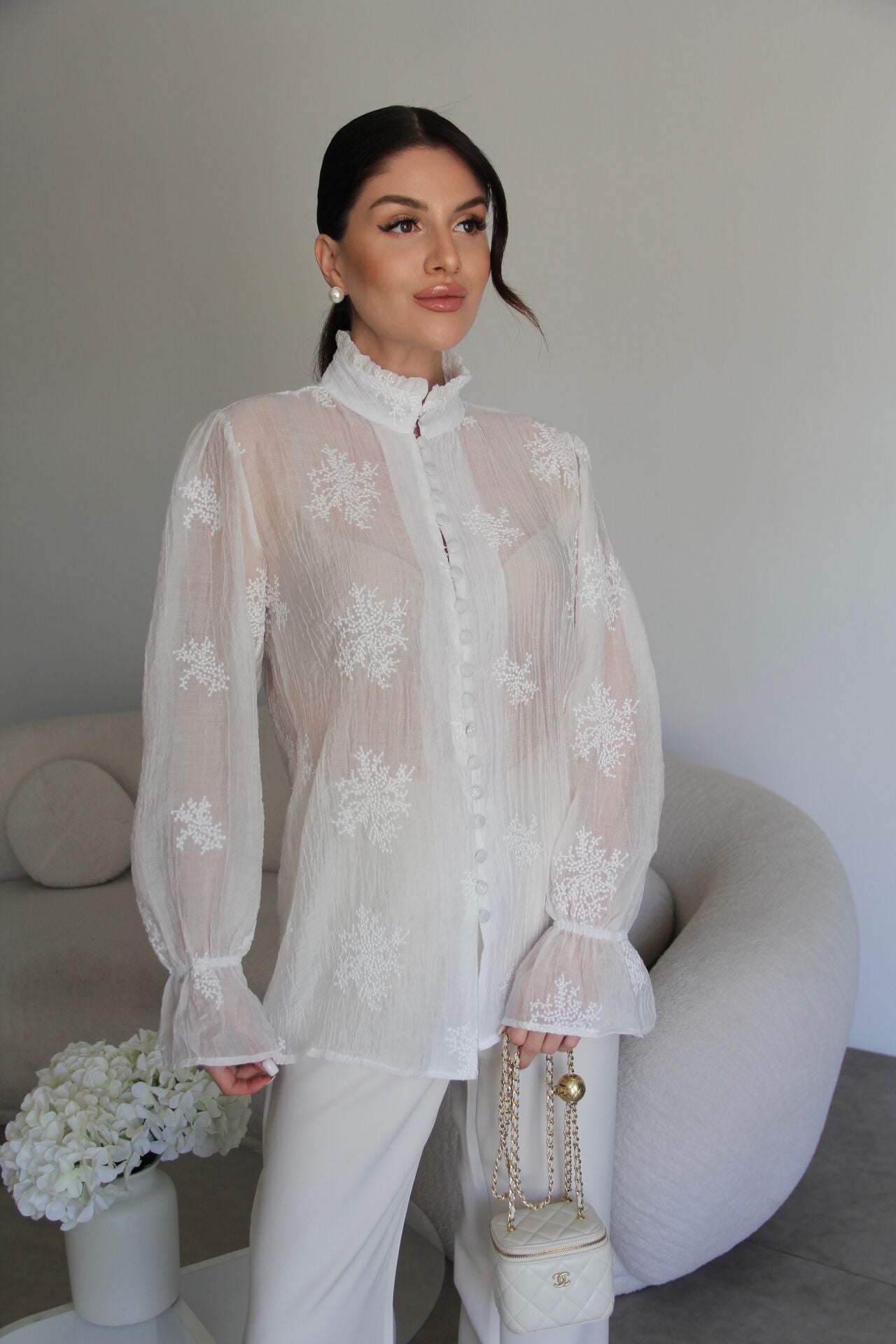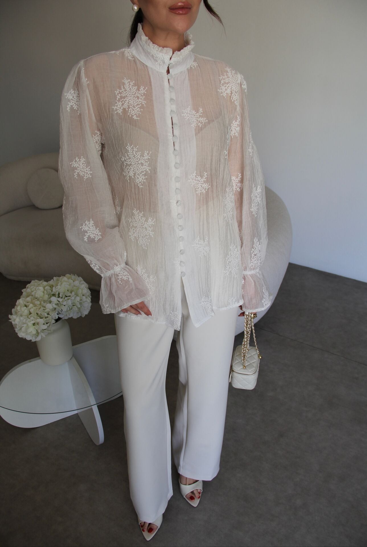 Dik Yaka Boydan Düğmeli Nakış Detaylı Premium Transparan Gömlek