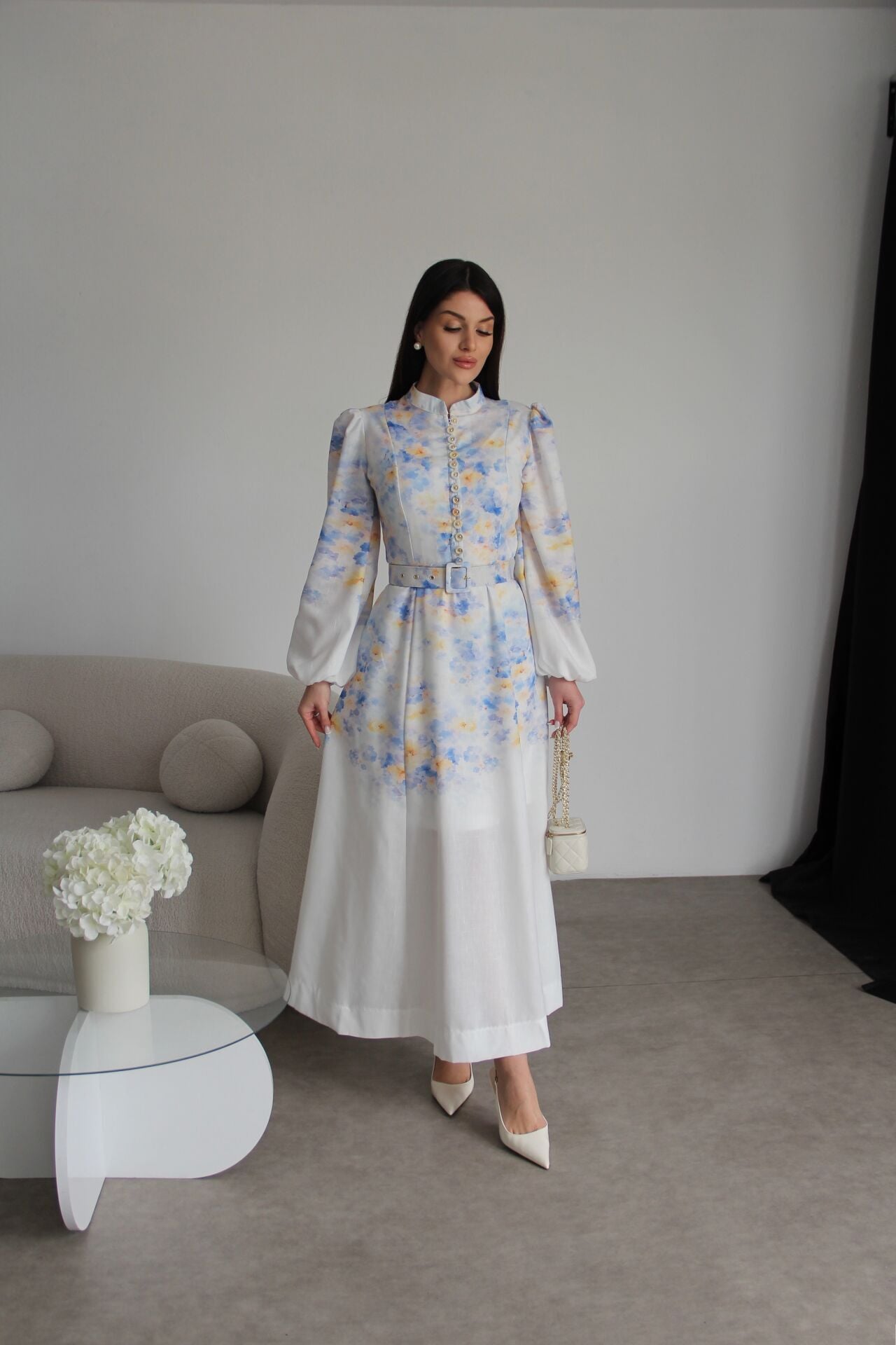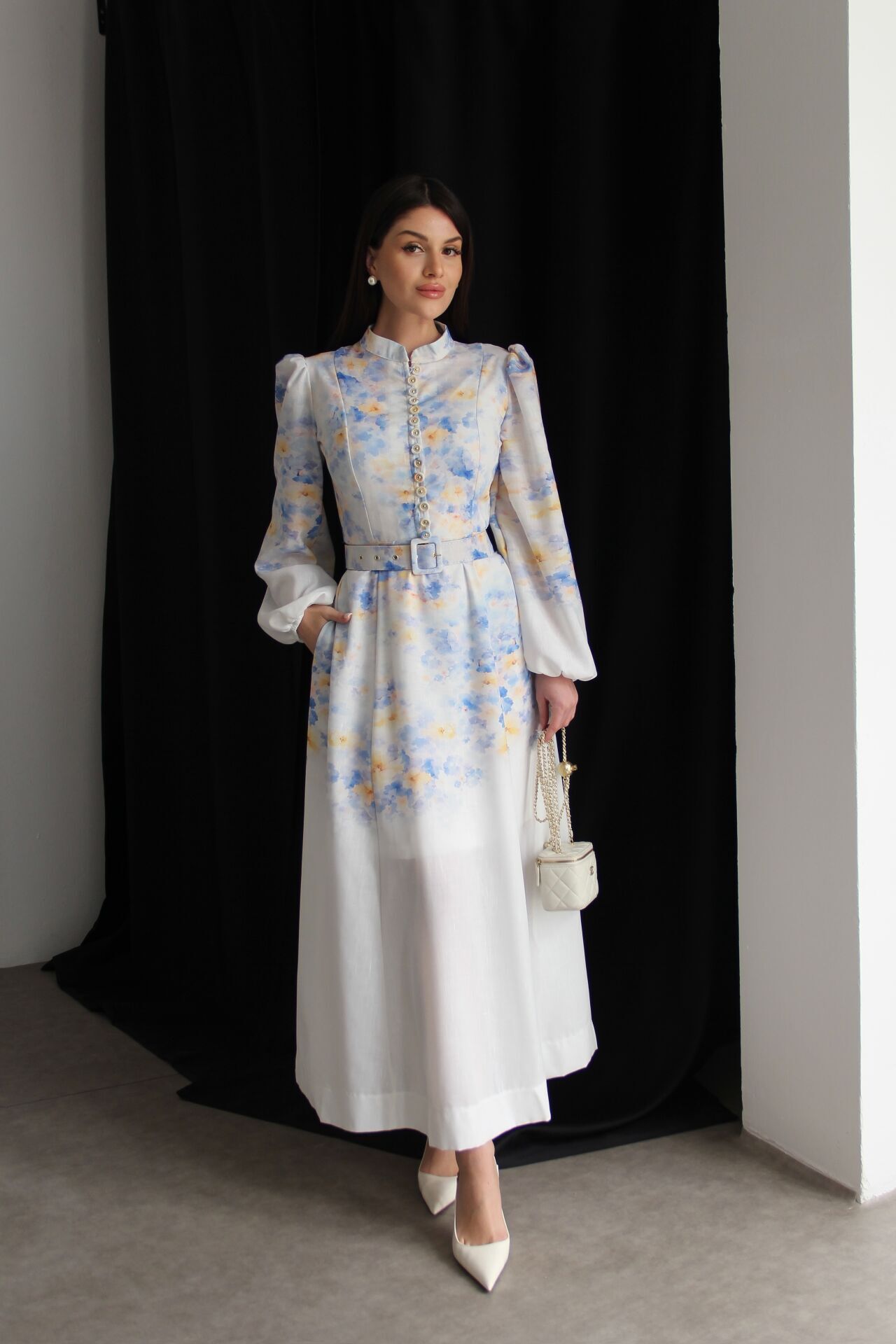 Dik Yaka Çok Renkli Düğmeli KEMERLİ Premium Tasarım Keten Elbise