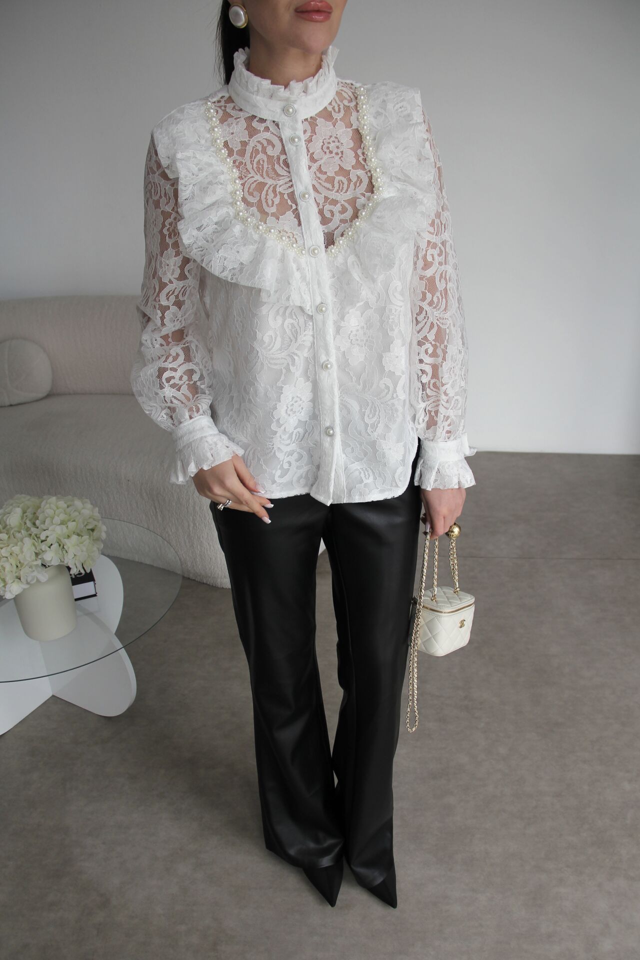 Dik Yaka Vintage inci işleme Detaylı Premium Tasarım Beyaz Dantel Gömlek