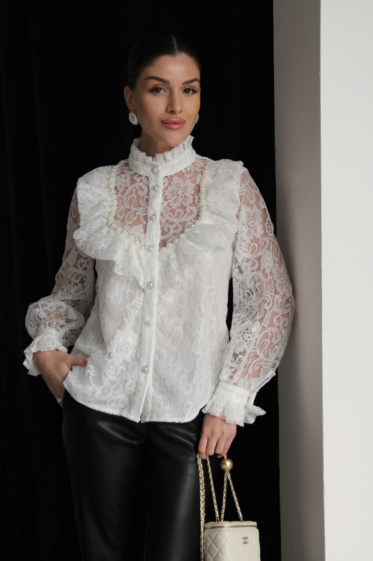 Dik Yaka Vintage inci işleme Detaylı Premium Tasarım Beyaz Dantel Gömlek.