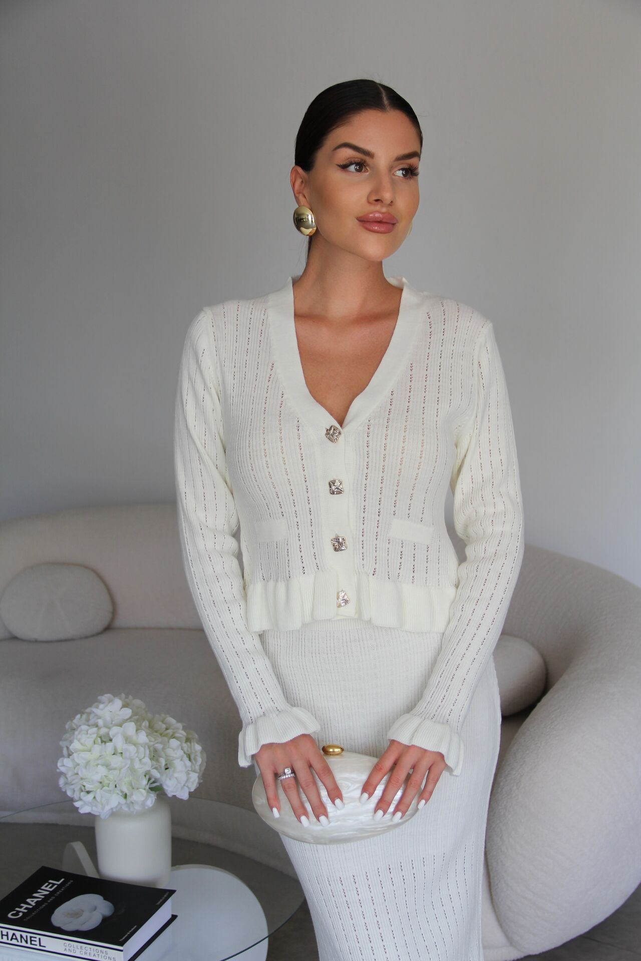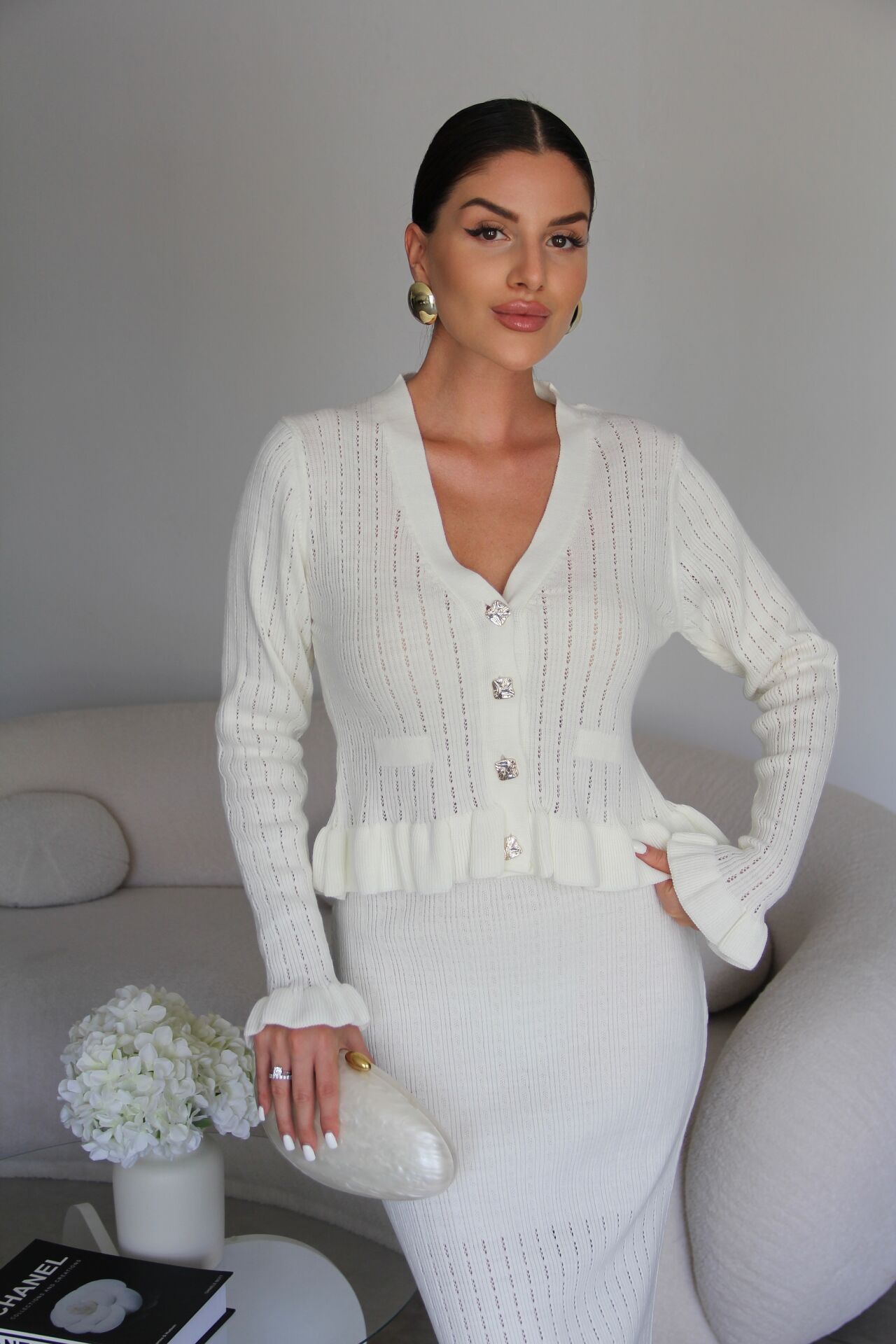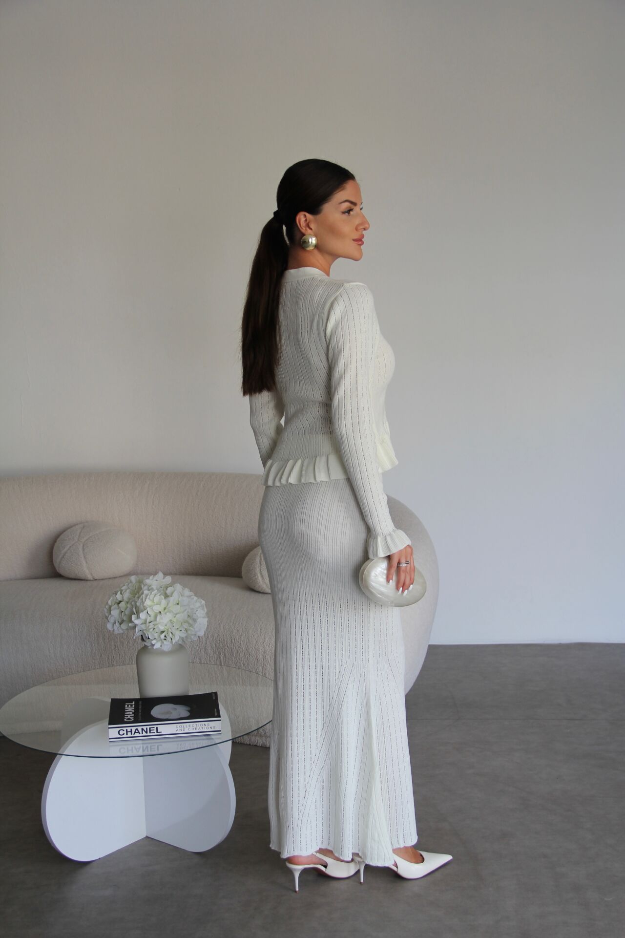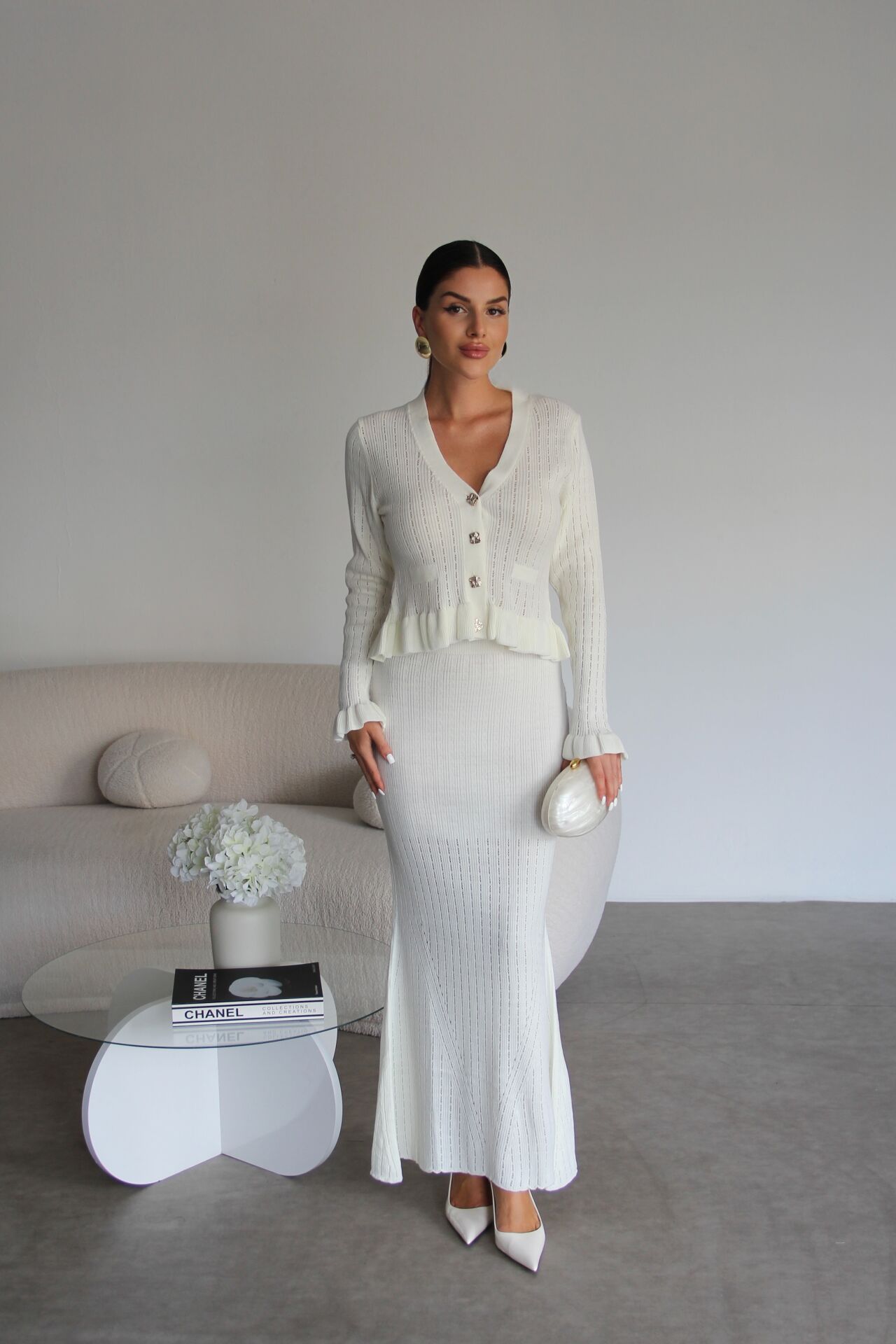 Düğme Detaylı V Yaka Hırka ve Maxi Uzun Etekli Premium Triko Takım