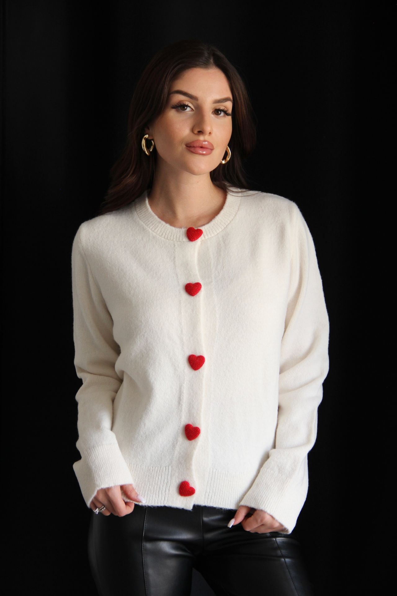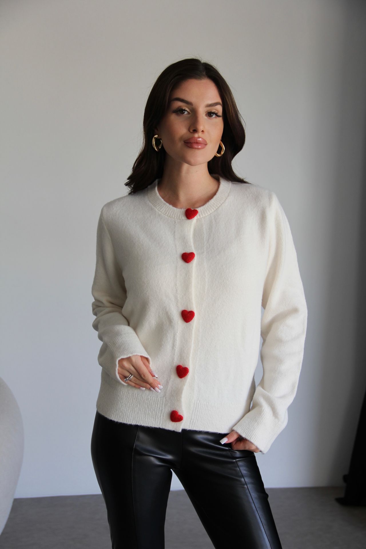 Ekru Beyaz Bisiklet Yaka Kırmızı Kalp Düğmeli Premium Hırka