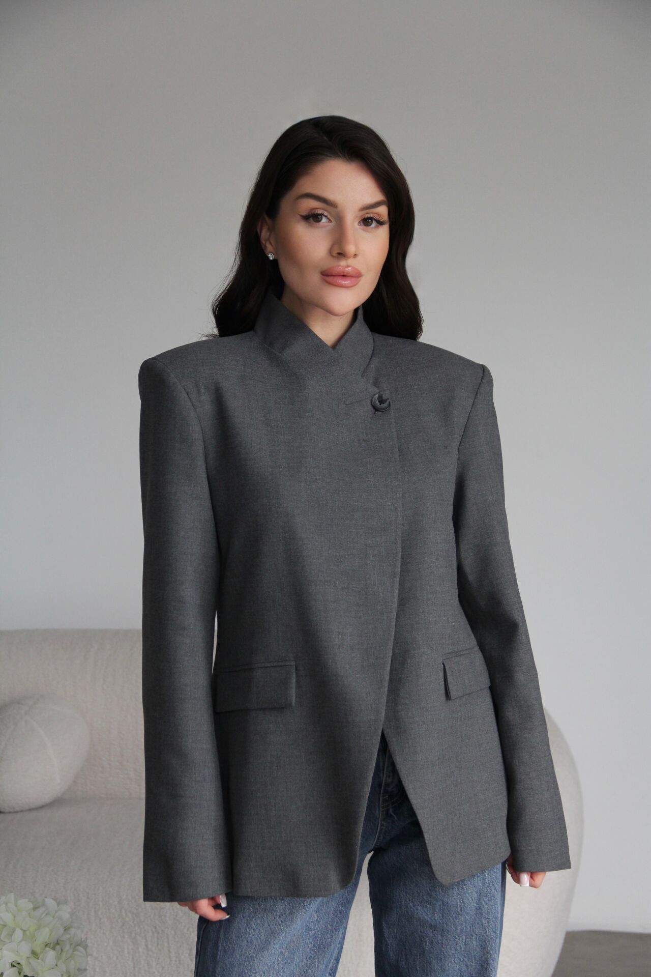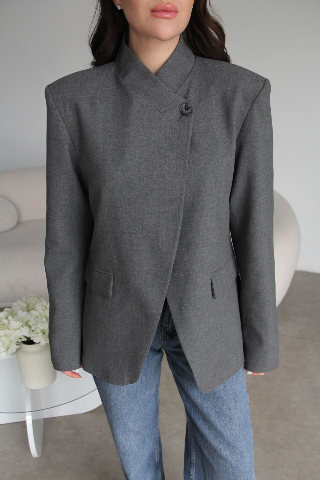 Gri Tek Düğme Detaylı Asimetrik Yaka Premium Tasarım Blazer Ceket