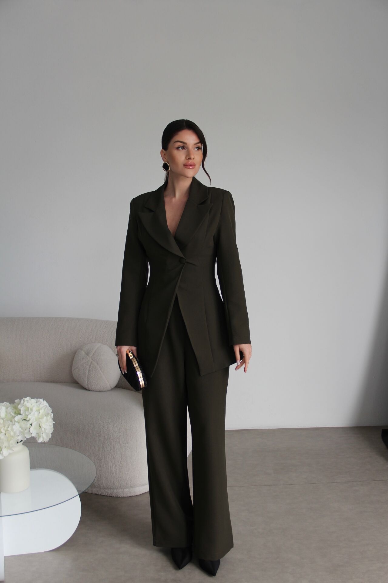 Zarif tasarımıyla dikkat çeken korseli tek düğmeli ceket ve palazzo pantolon, özel günlerinizde şıklığınızı tamamlar.